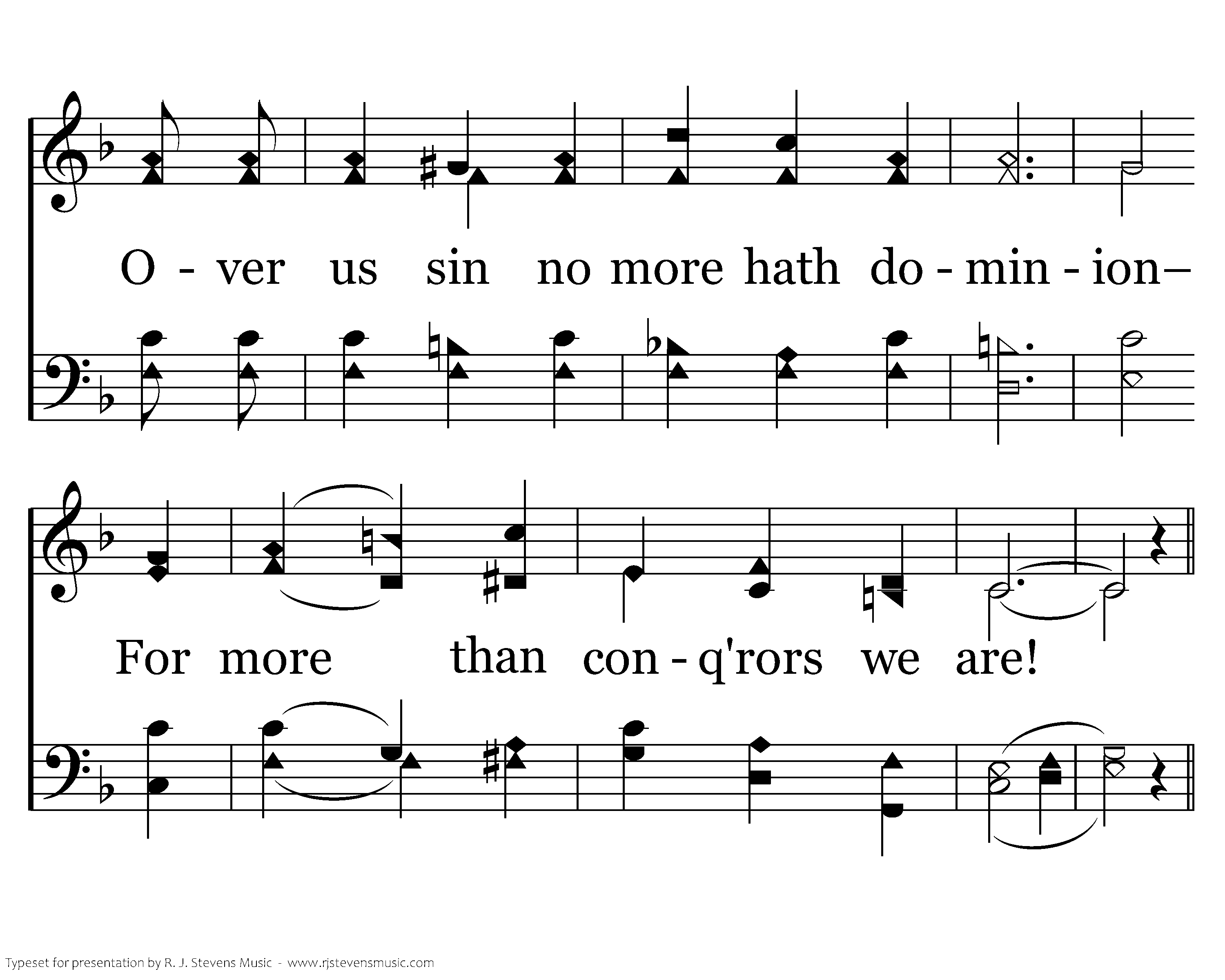 Thru death into life everlasting He passed, and we follow Him there; Over us sin no more hath dominion For more than conq'rors we are!
