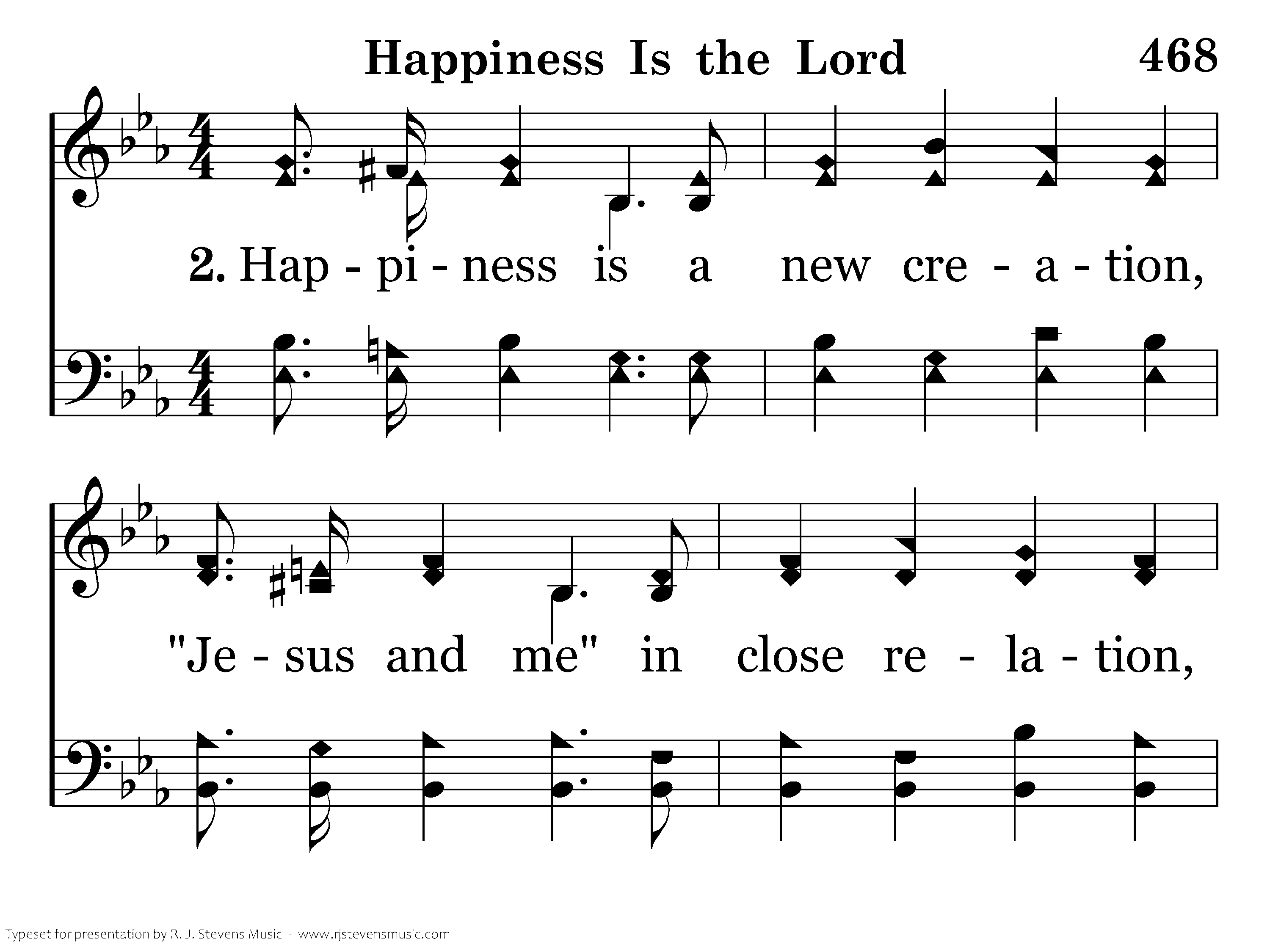 Happiness is a new creation, "Jesus and me" in close relation, Having a part in His salvation Happiness is the Lord. Real joy is mine, no mat-ter if teardrops start, I've the secret-it's Jesus in my heart!