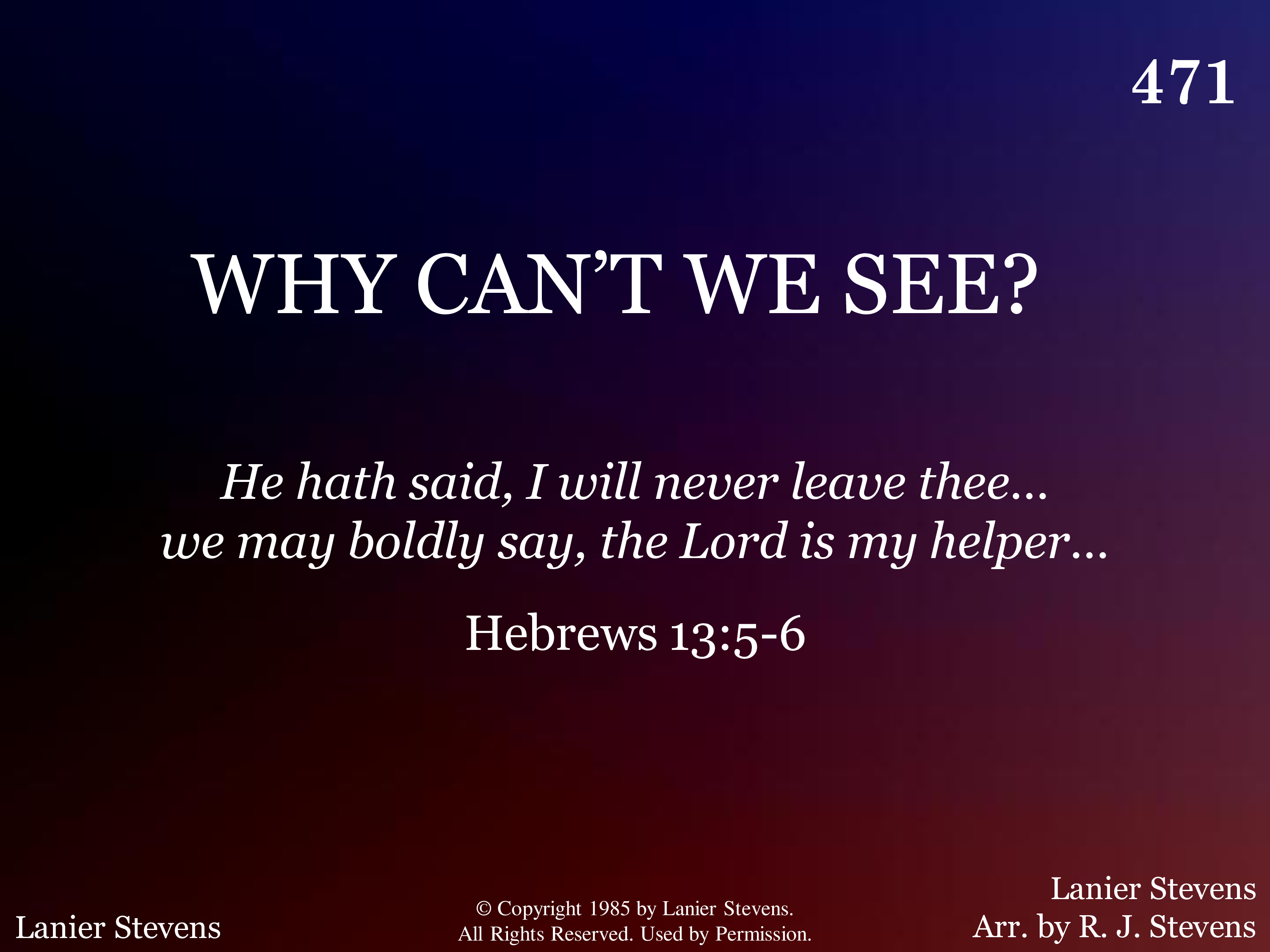 Why can't we see? Why do we sin? We must not let the tempter in; O Jesus, make our hearts Thy throne, So we can see we're not alone.