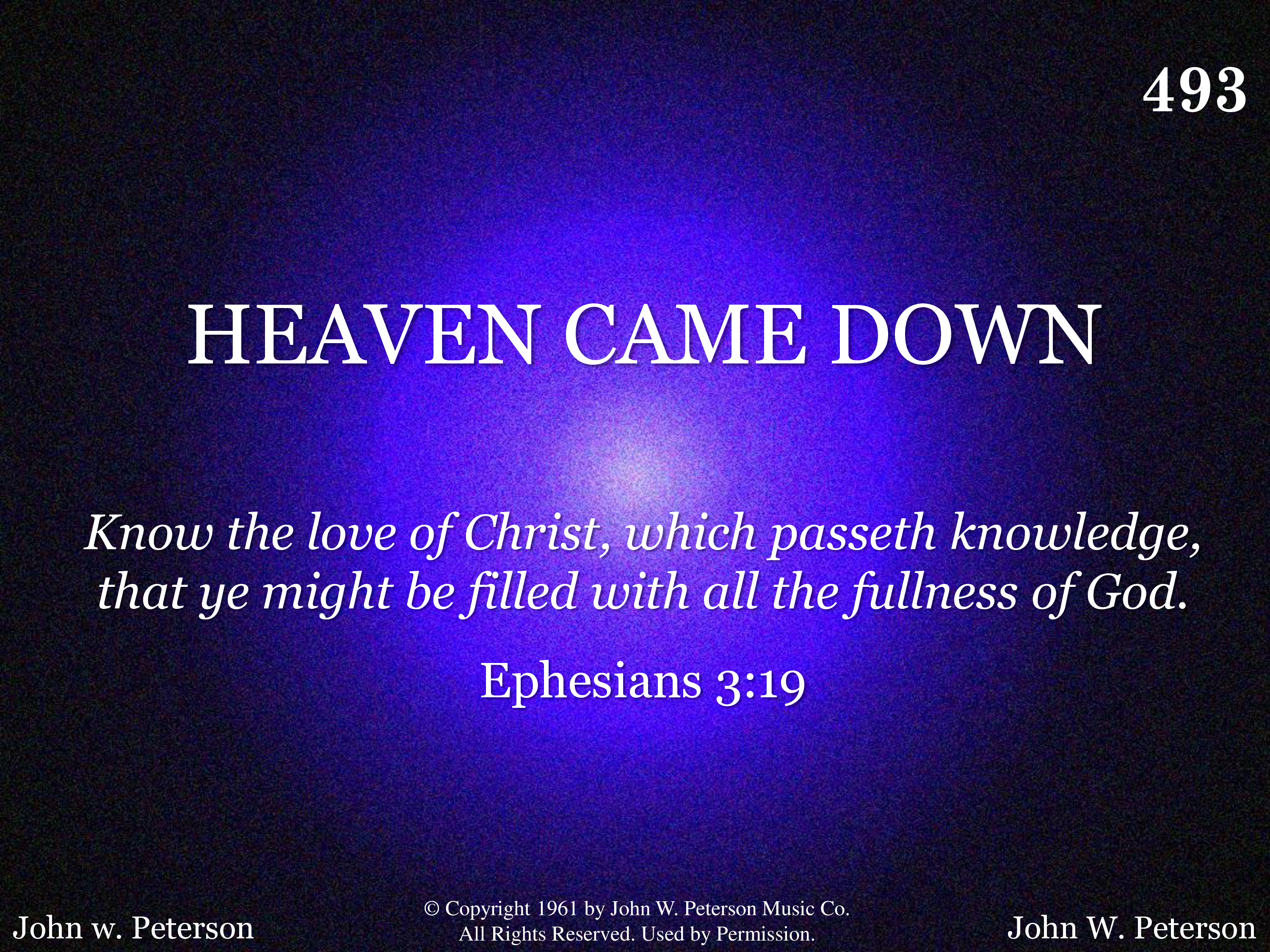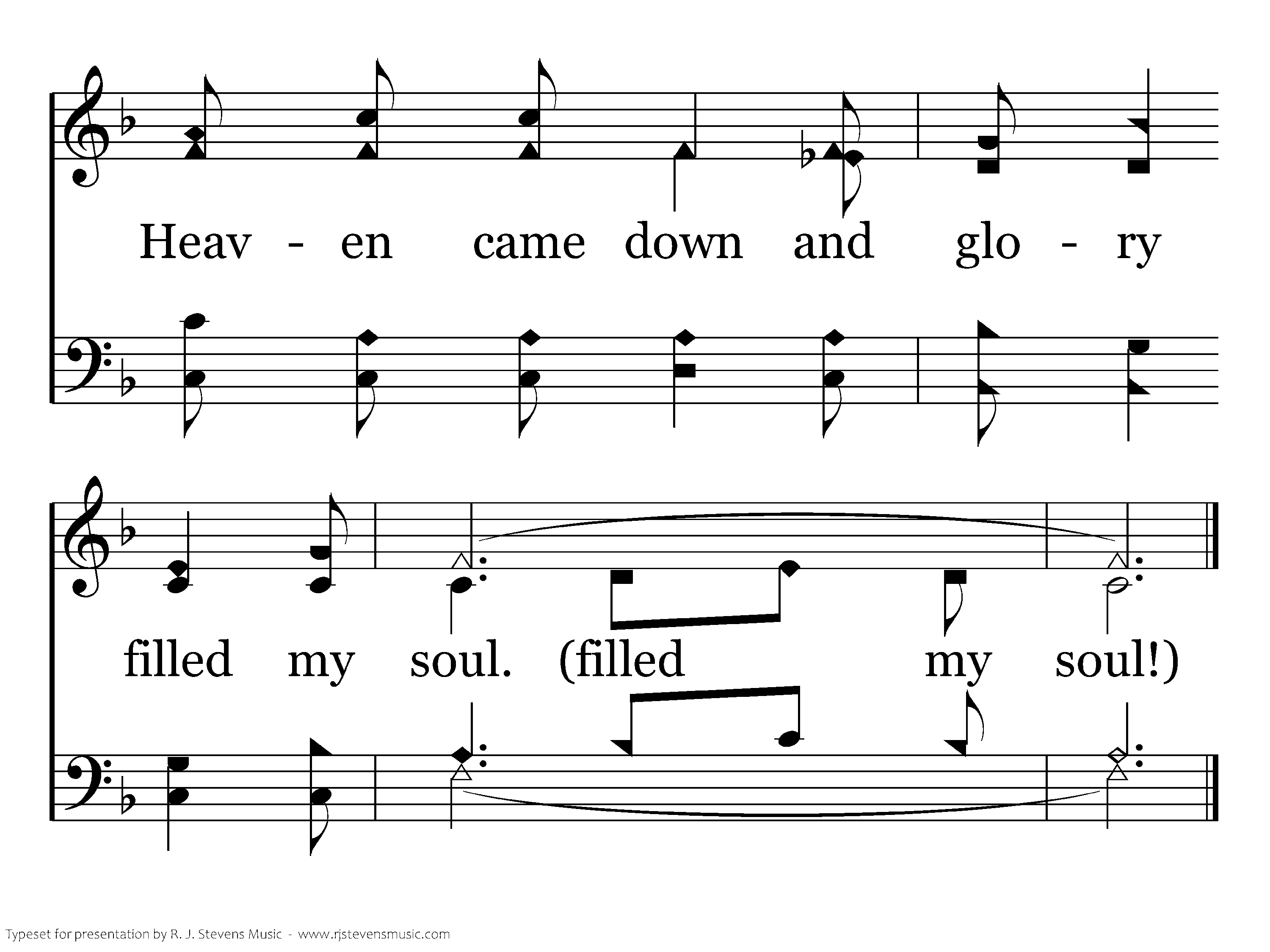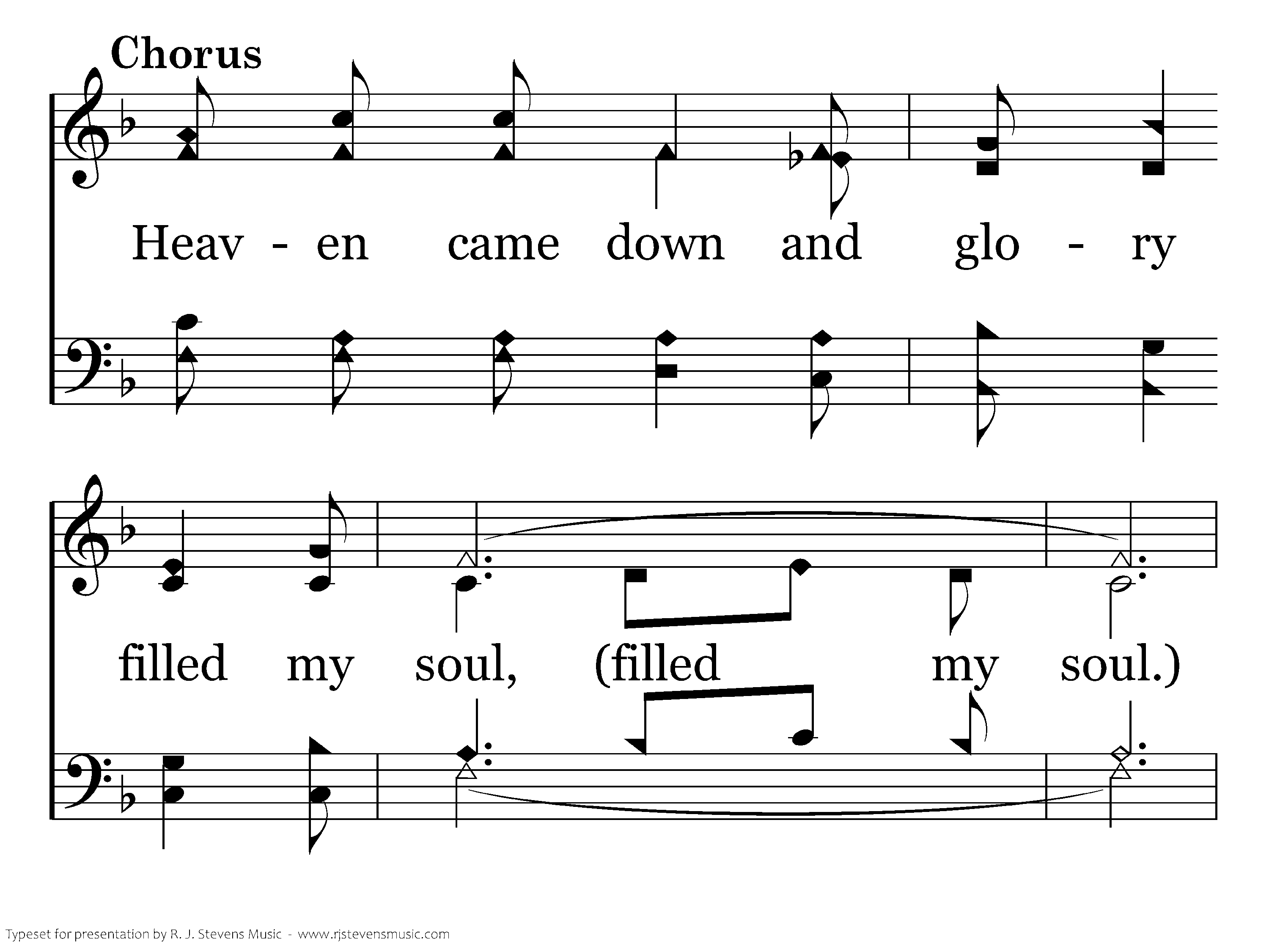 Heaven came down and glory filled my soul. When at the Cross the Savior made me whole. My sins were washed away And my night was turned to day. Heaven came down and glory filled my soul.