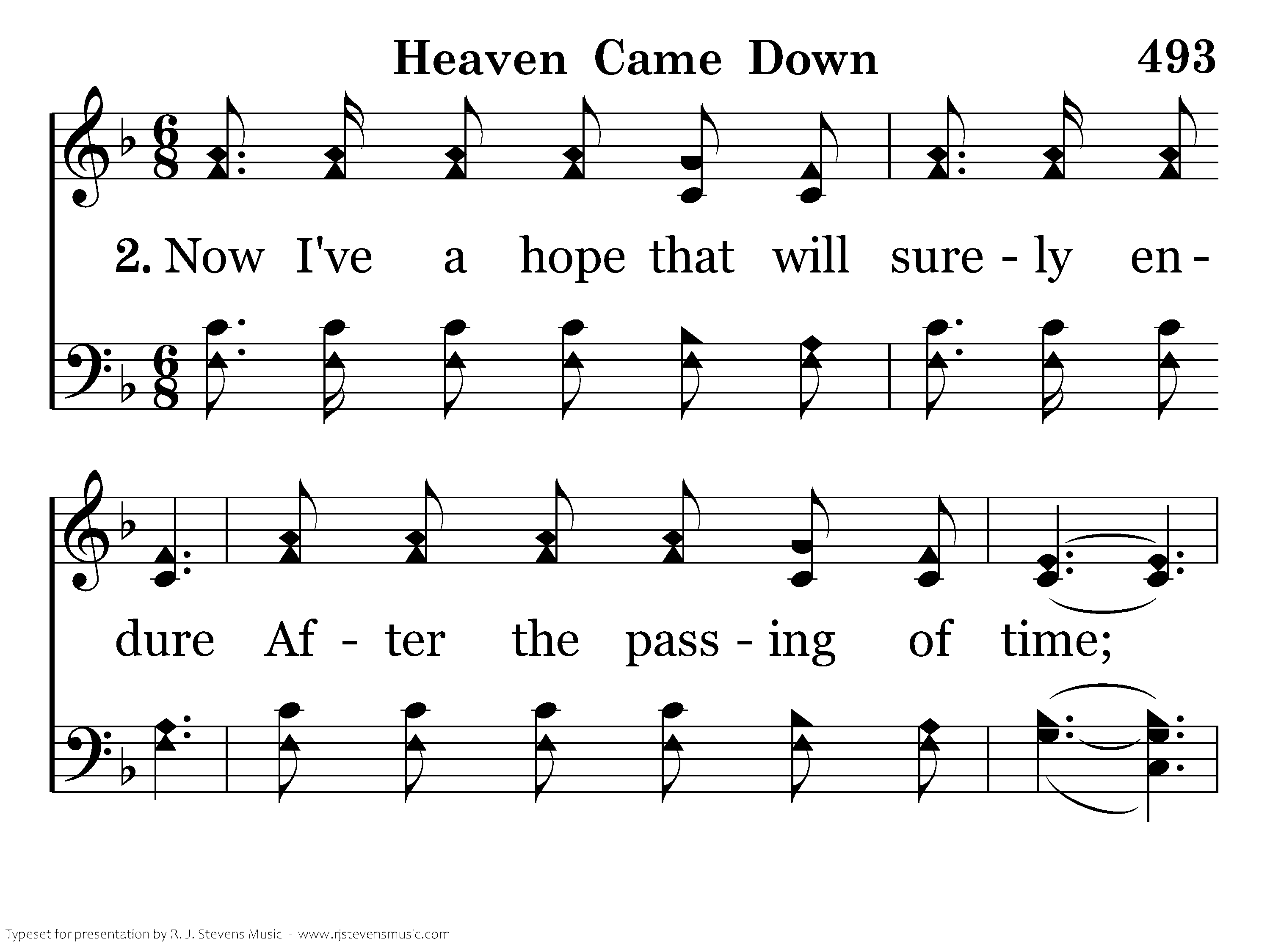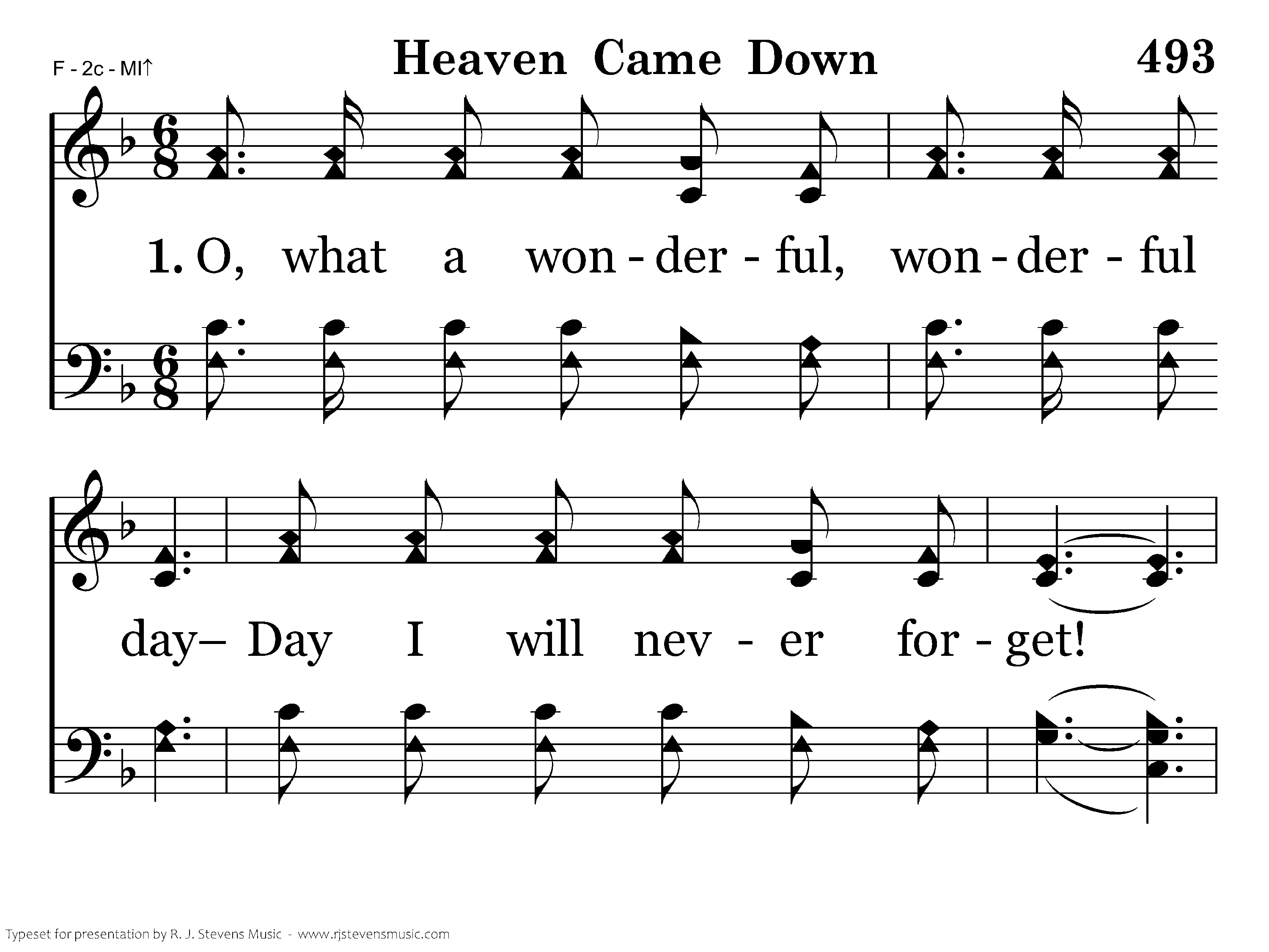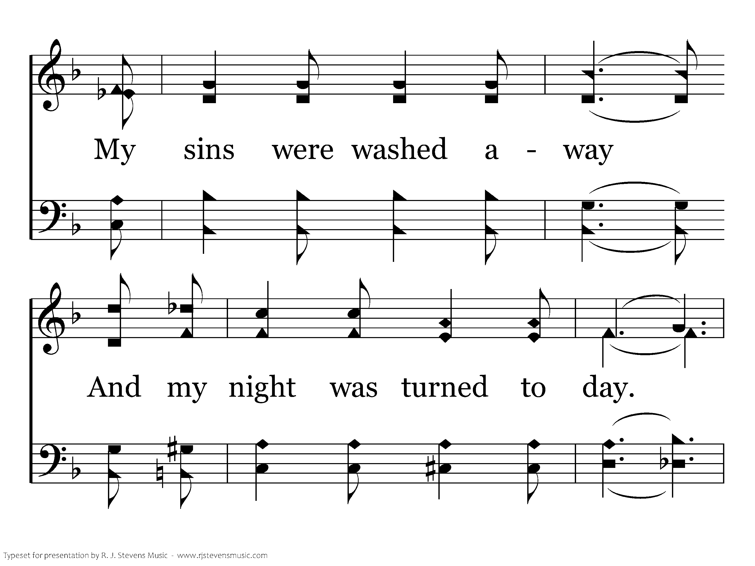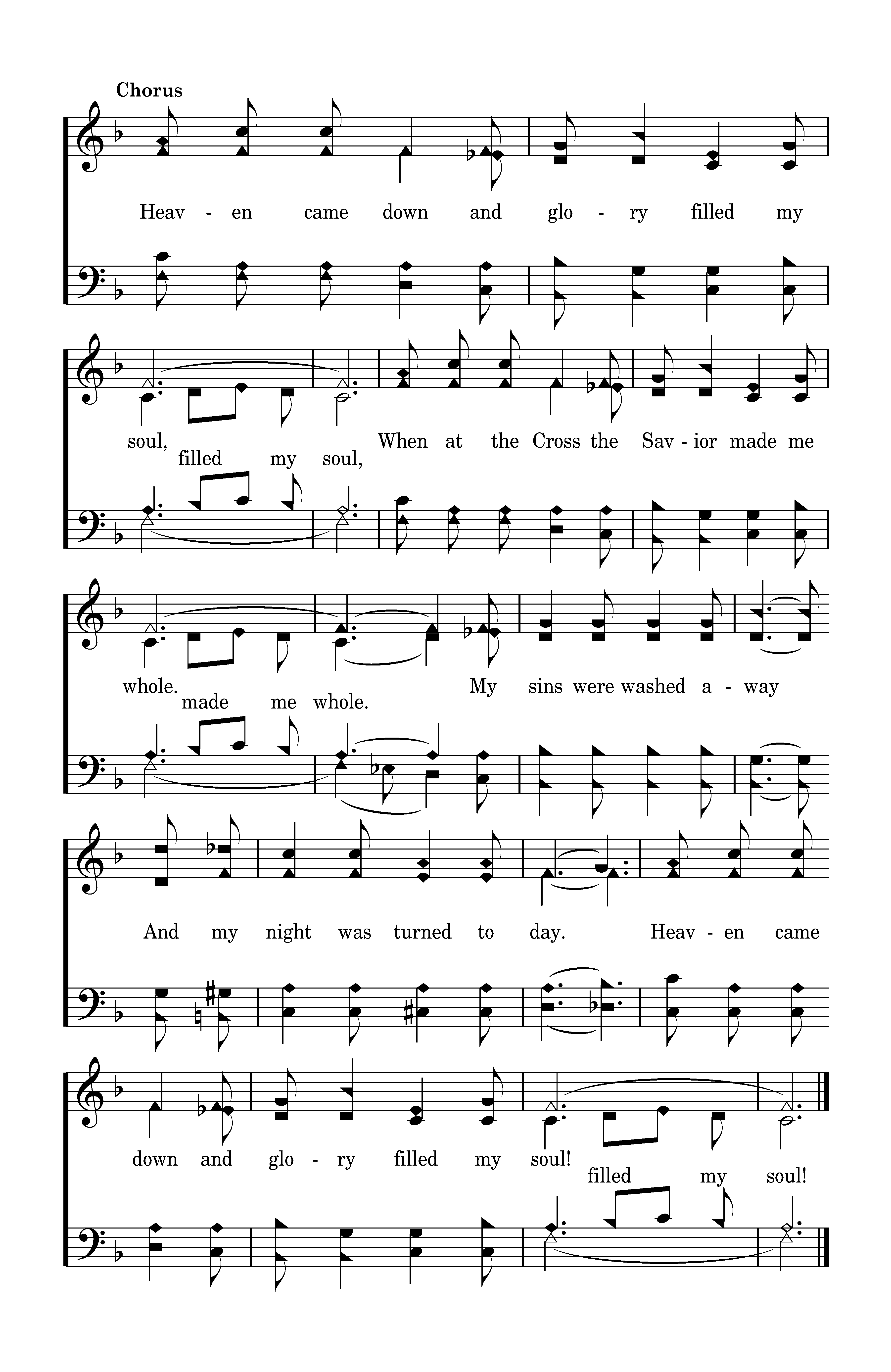 Heaven came down and glory filled my soul. When at the Cross the Savior made me whole. My sins were washed away And my night was turned to day. Heaven came down and glory filled my soul.