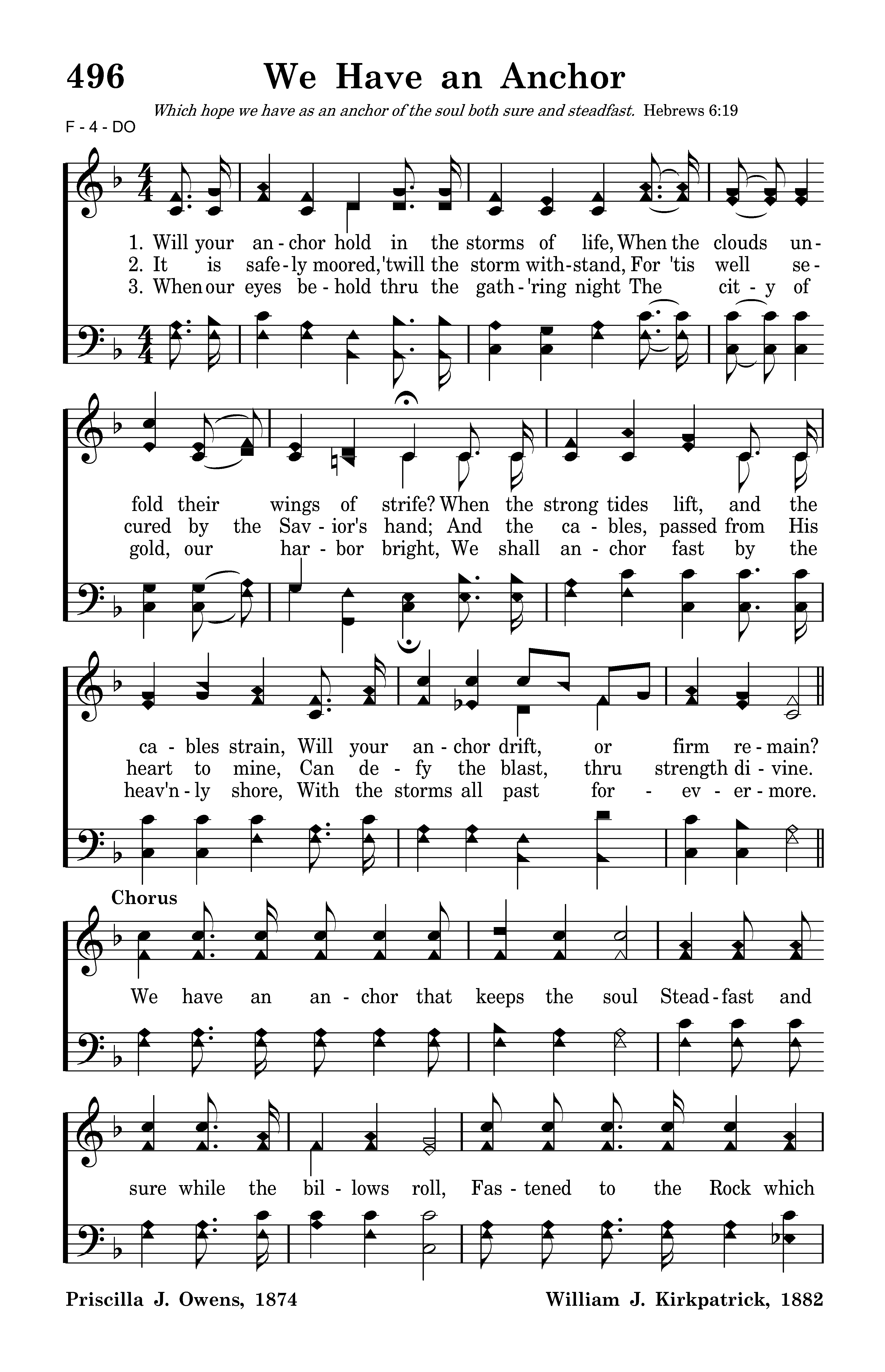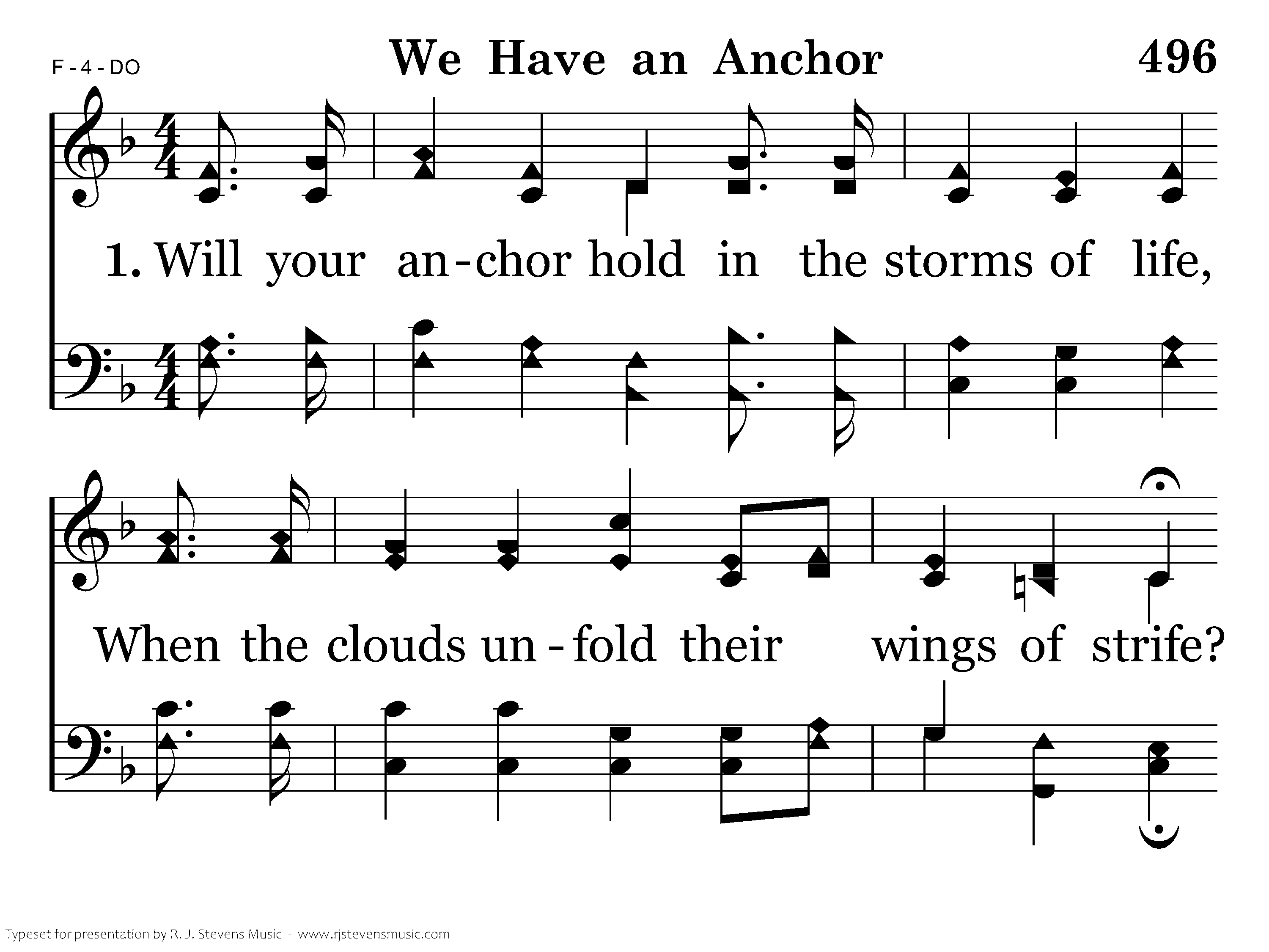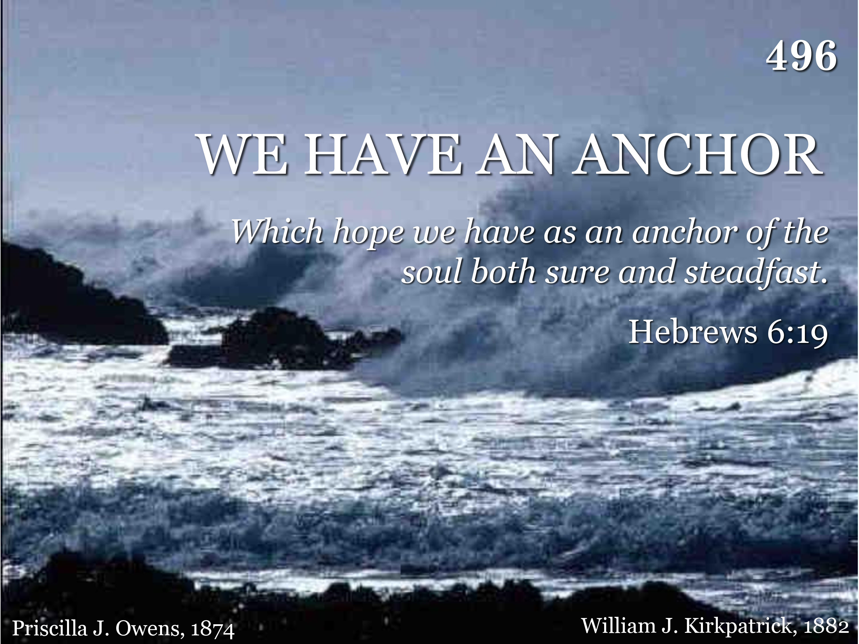 We have an anchor that keeps the soul Steadfast and sure while the billows roll, Fastened to the Rock which cannot move, Grounded firm and deep in the Savior's love.