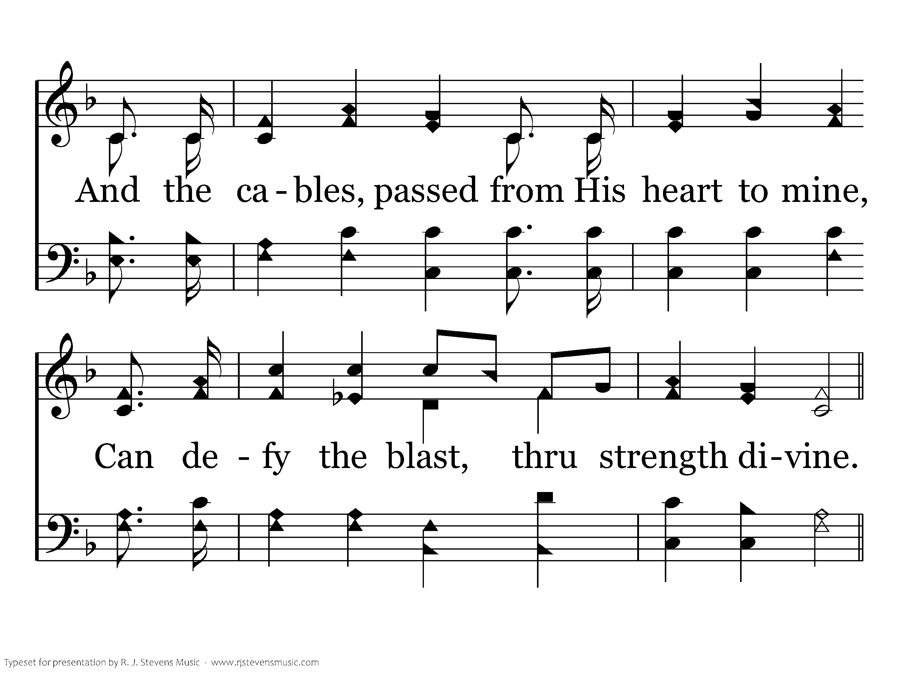 It is safely moored, 'twill the storm withstand, For 'tis well secured by the Savior's hand; And the cables, passed from His heart to mine, Can defy the blast, thru strength divine.