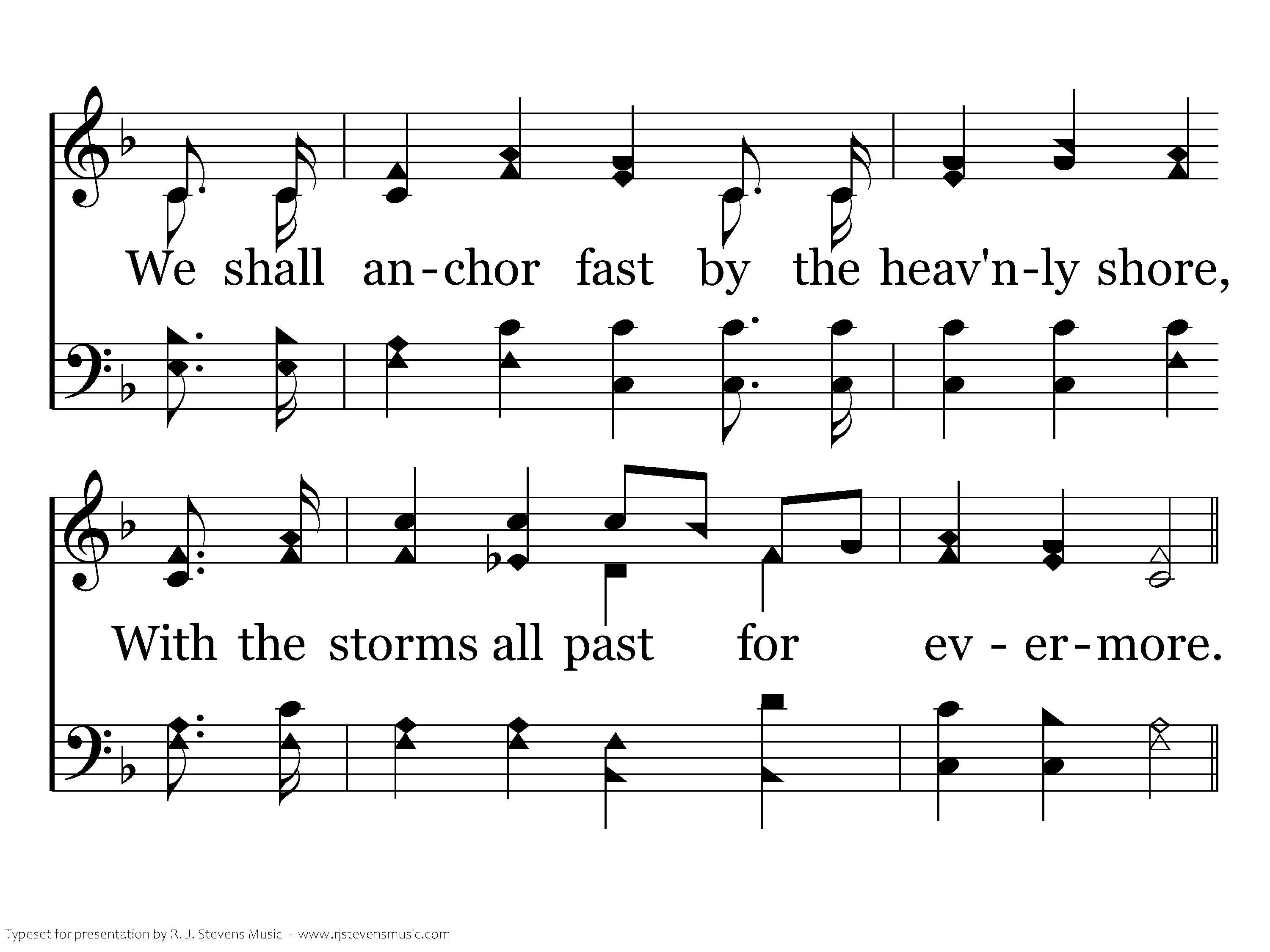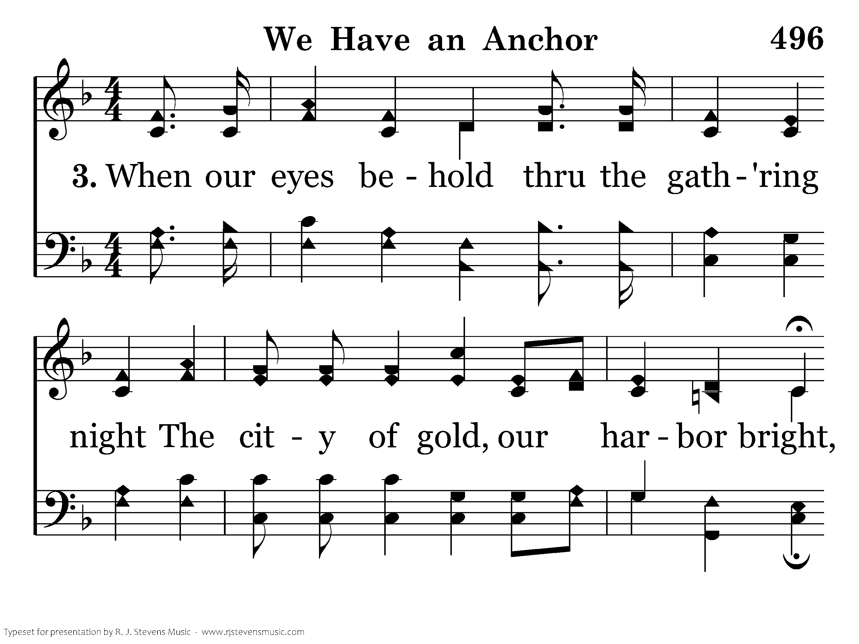 When our eyes behold thru the gath'ring night The city of gold, our harbor bright, We shall anchor fast by the heav'nly shore, With the storms all past forevermore.