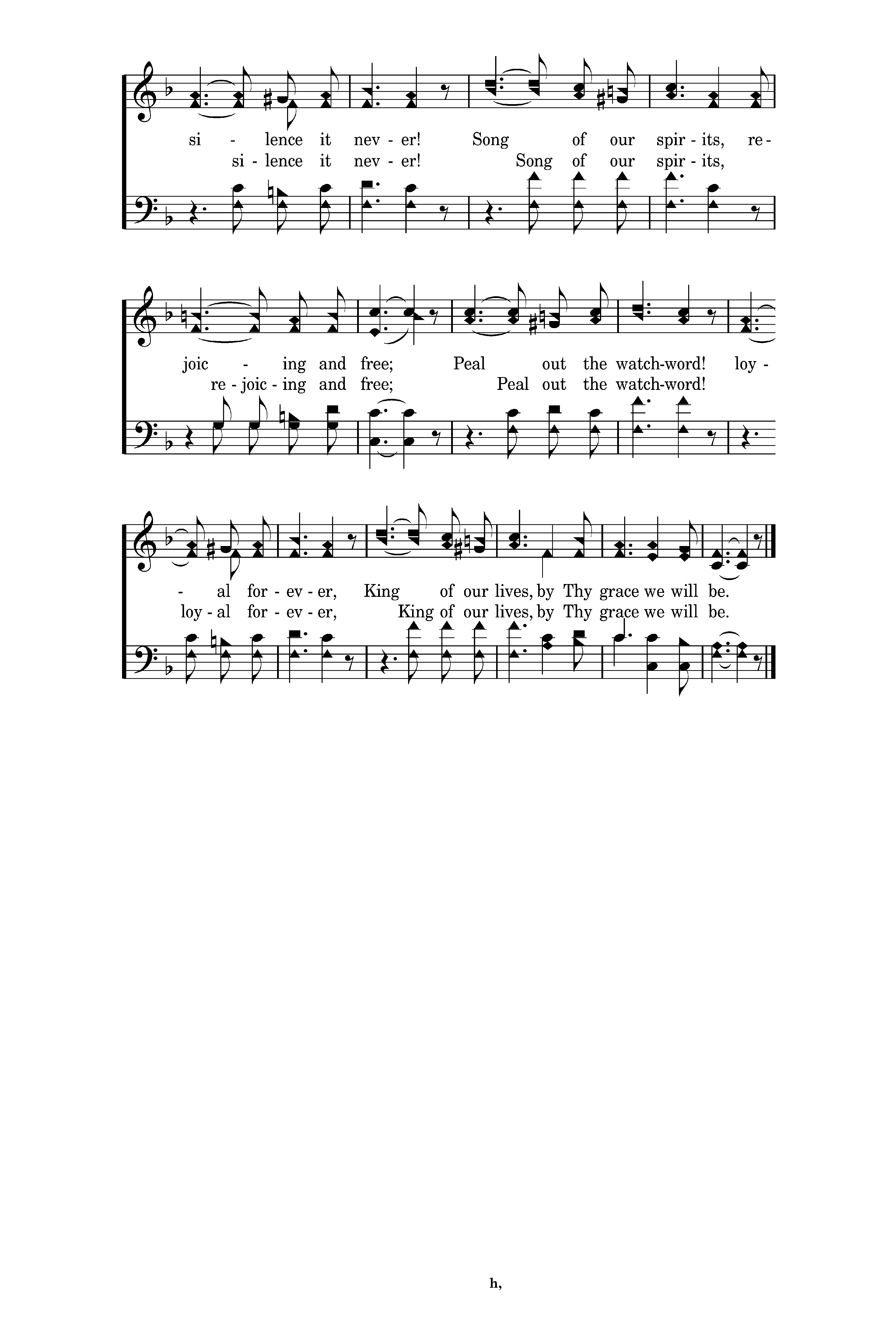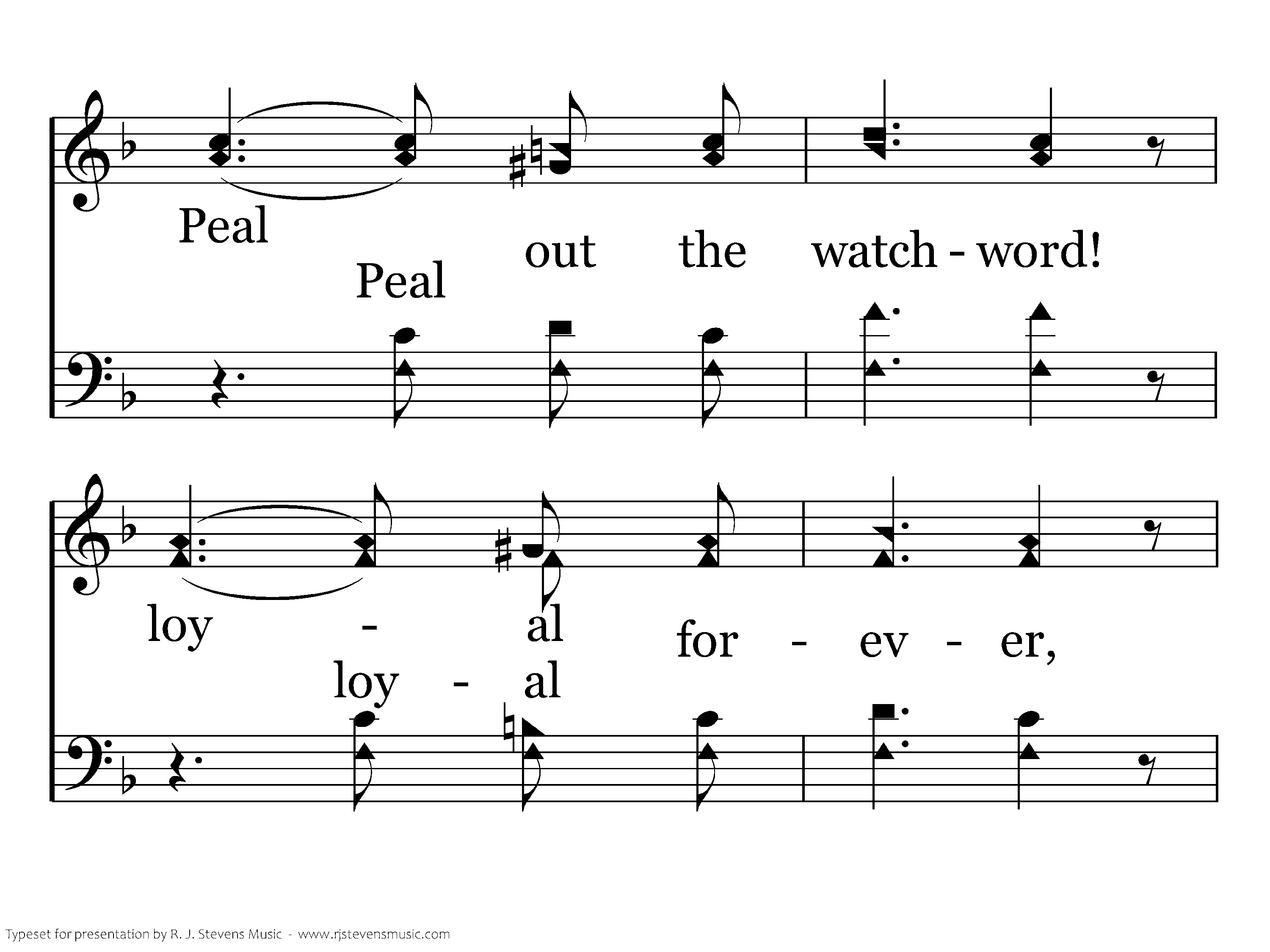 Peal out the watchword! silence it never! Song of our spirits, rejoicing and free; Peal out the watchword! loyal forever, King of our lives, by Thy grace we will be.