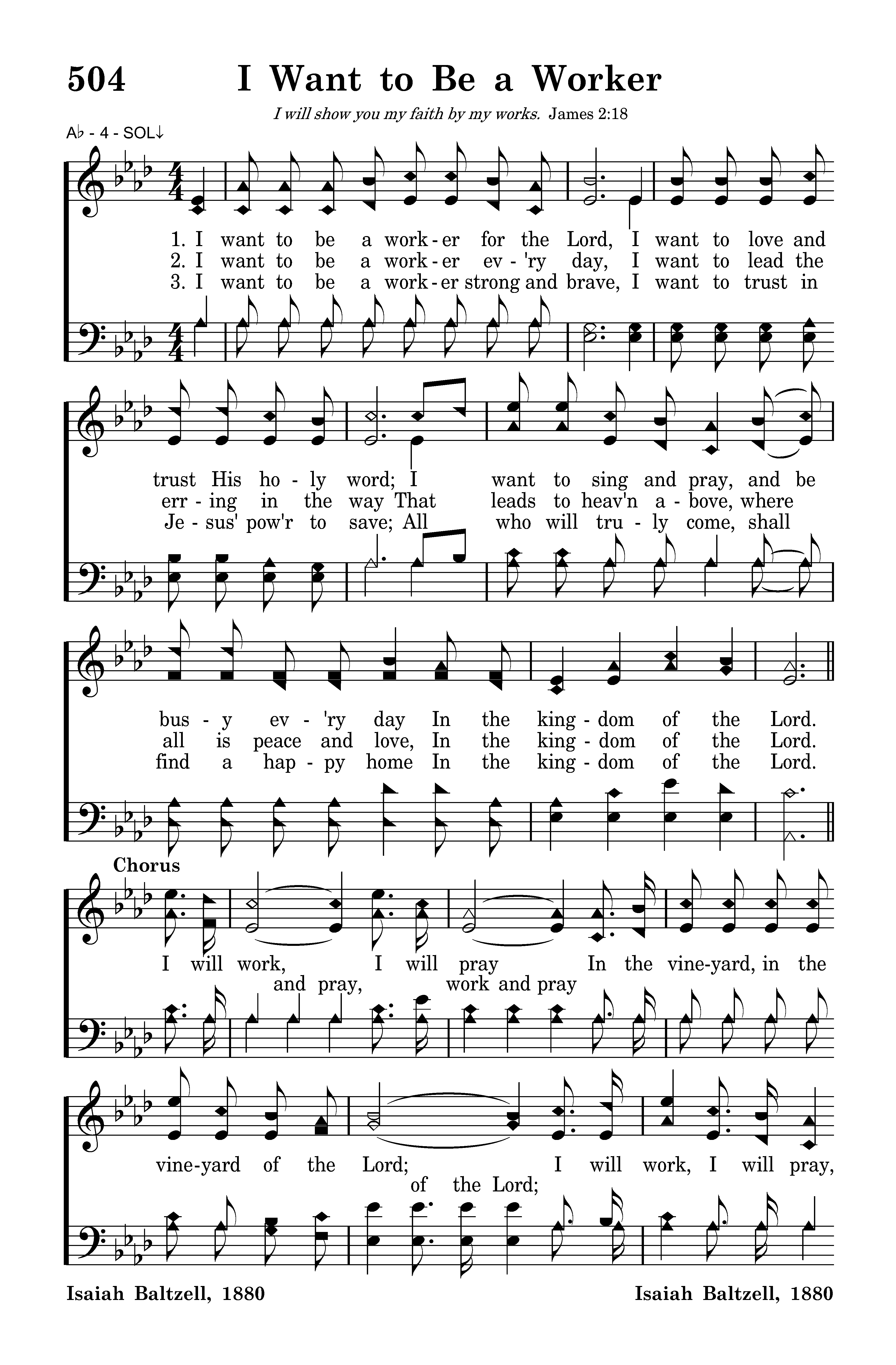 I will work, I will pray In the vineyard, in the vineyard of the Lord; I will work, I will pray, I will labor ev'ry day In the vineyard of the Lord.