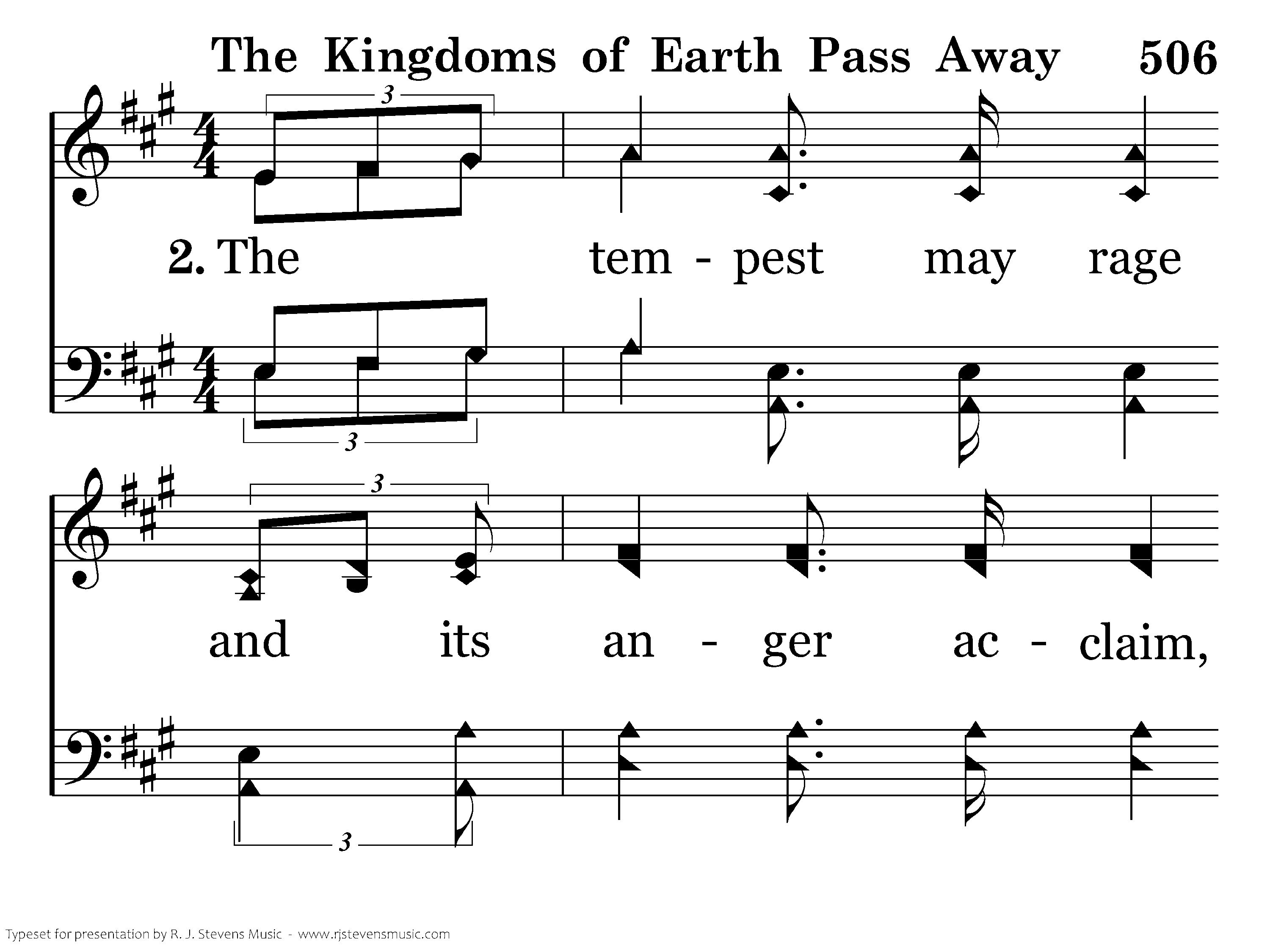 The tempest may rage and its anger acclaim, Yea, the wind and the torrents may roar, And the strong gates of hell may assail it in vain, Still the kingdom shall stand ever more.