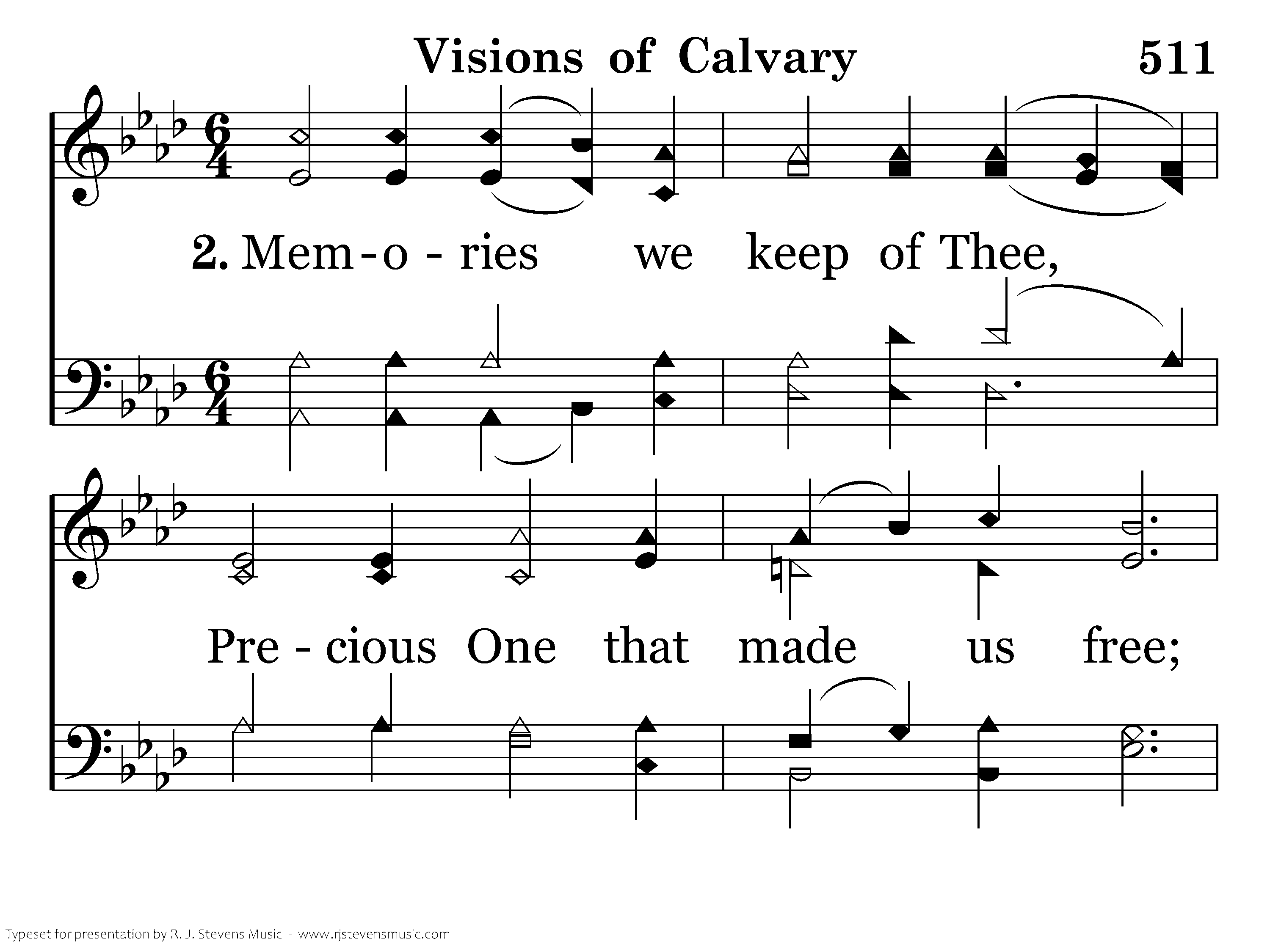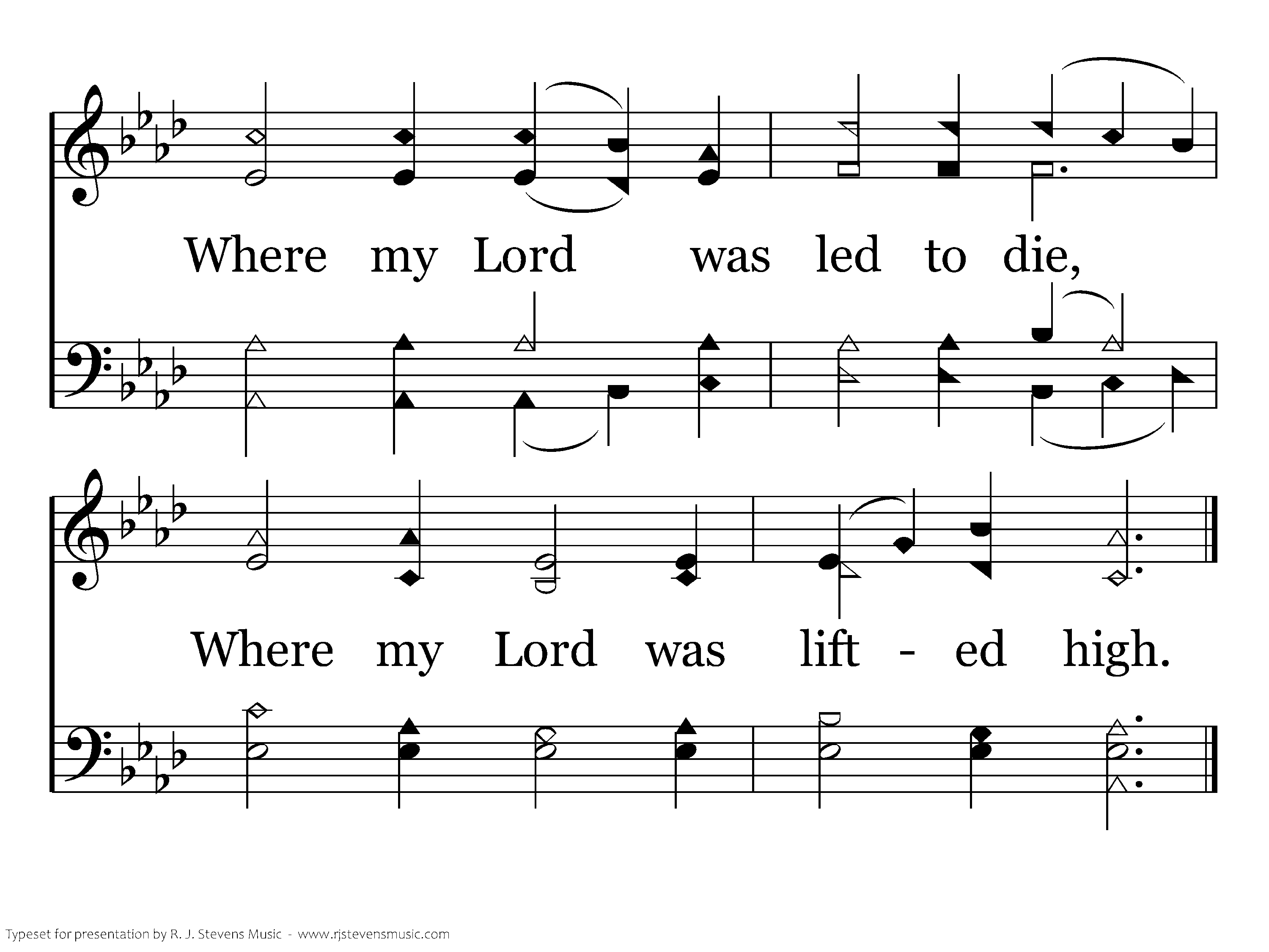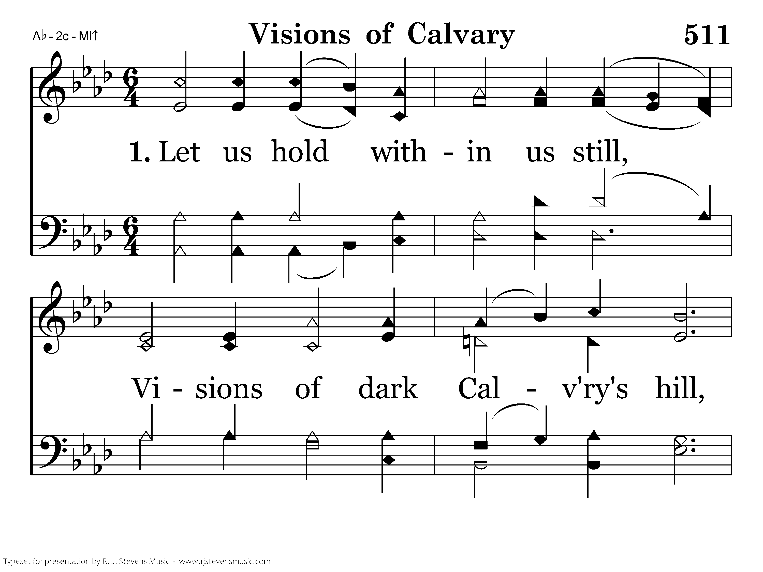 Let us hold within us still, Visions of dark Calv'ry's hill, Where my Lord was led to die, Where my Lord was lifted high.
