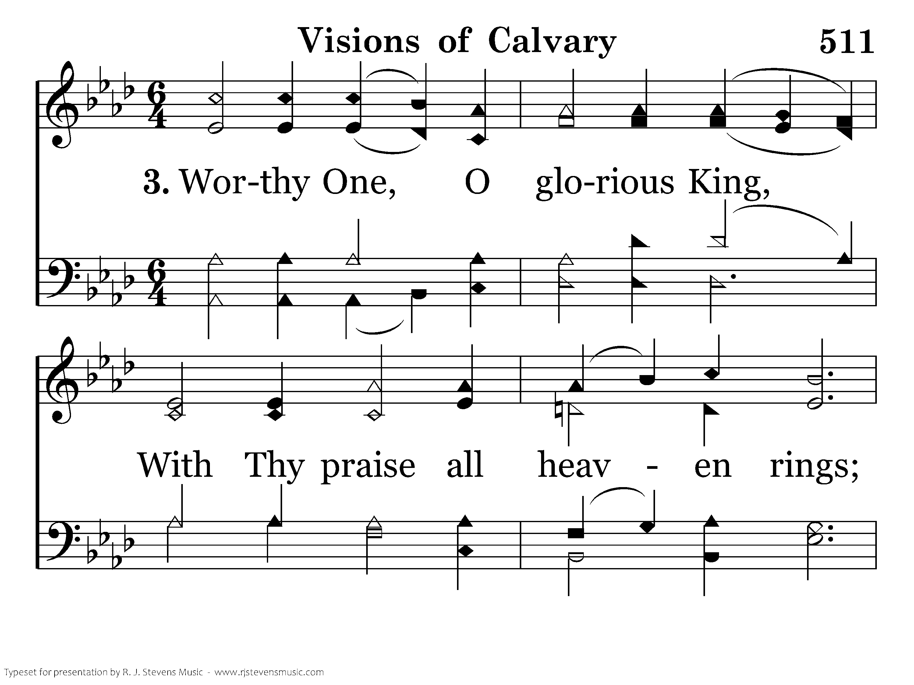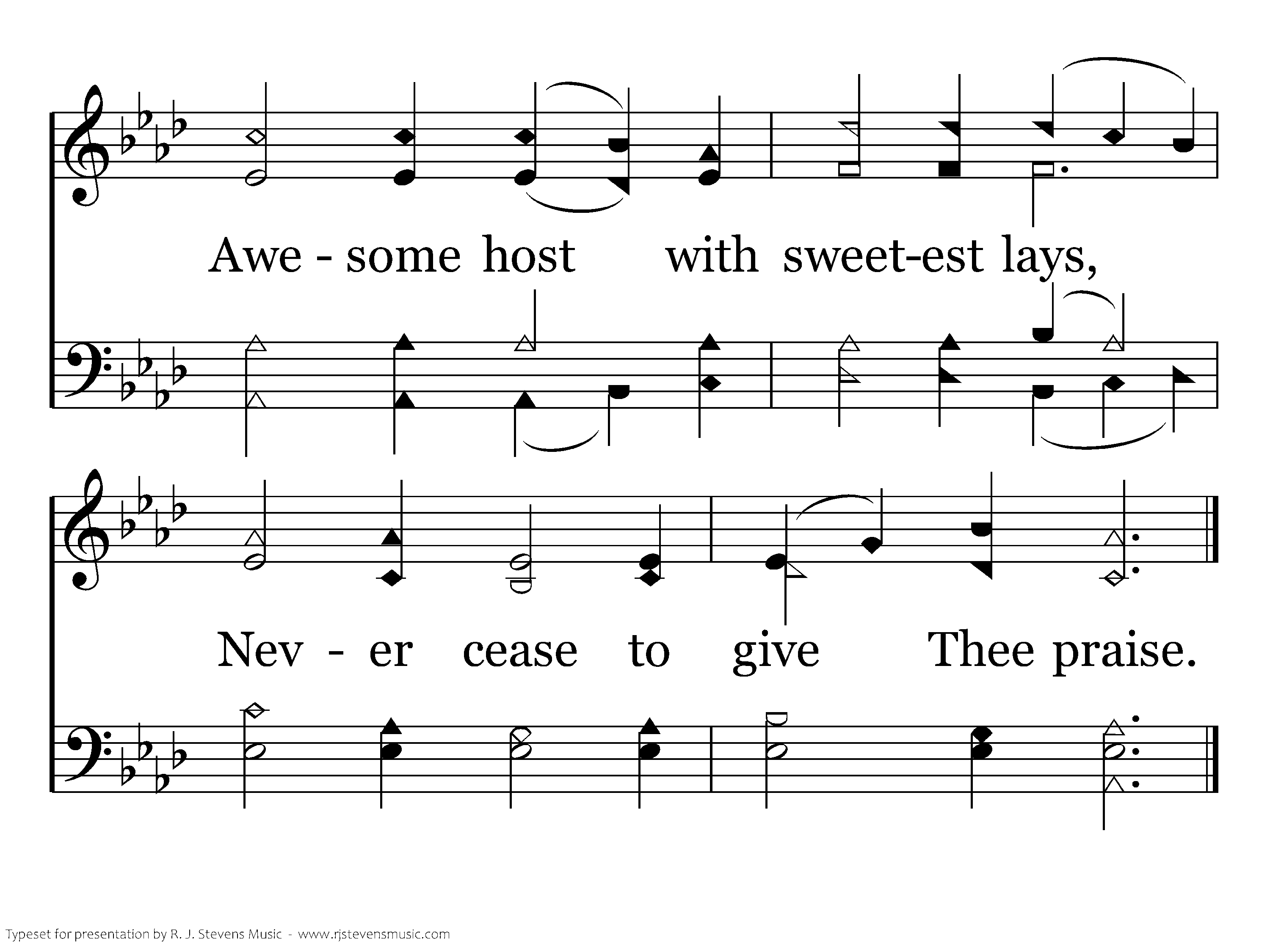 Worthy One, O glorious King, With Thy praise all heaven rings; Awesome host with sweetest lays, Never cease to give Thee praise.