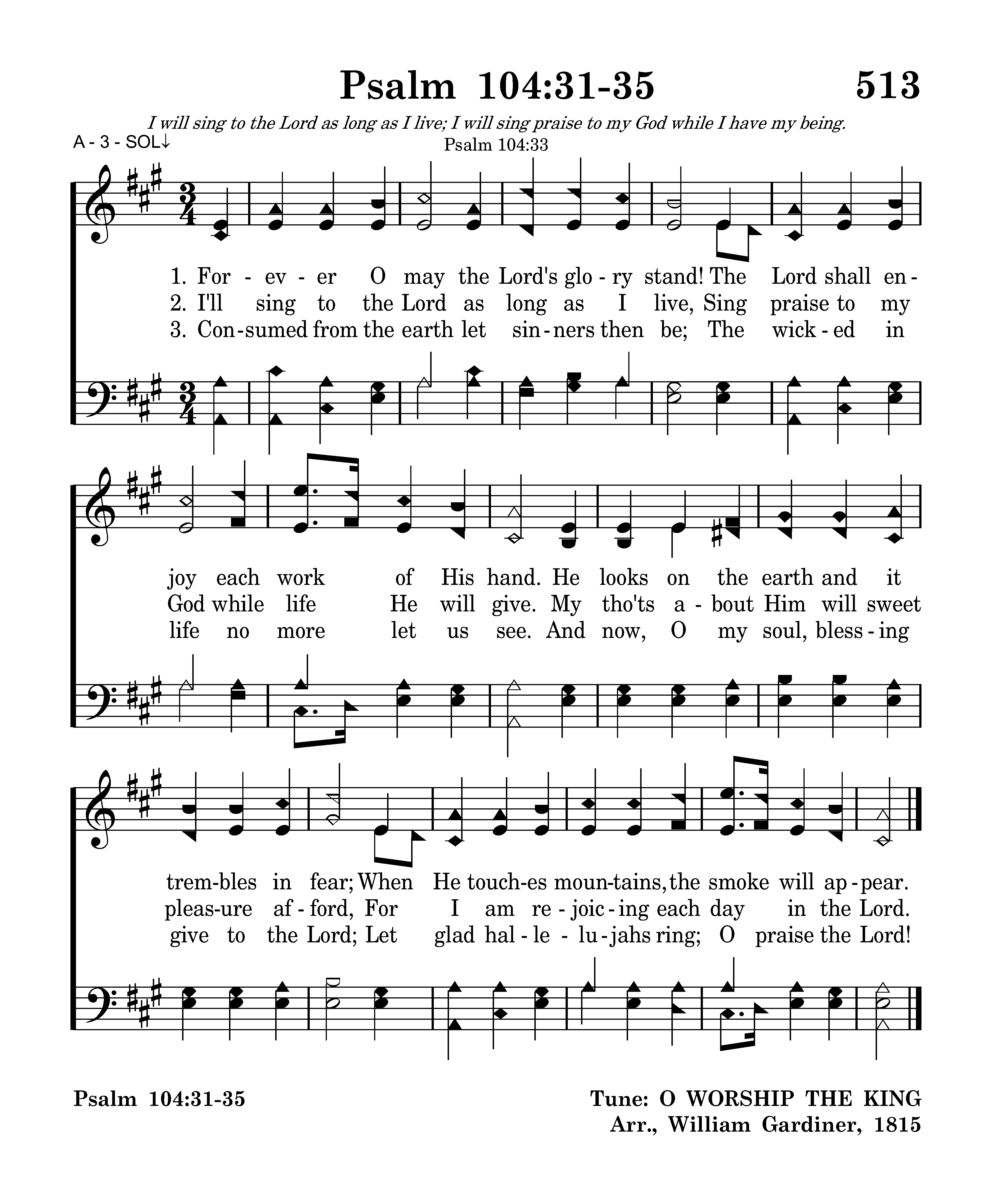 I'll sing to the Lord as long as I live, Sing praise to my God while life He will give. My tho'ts about Him will sweet pleasure afford, For I am rejoicing each day in the Lord.