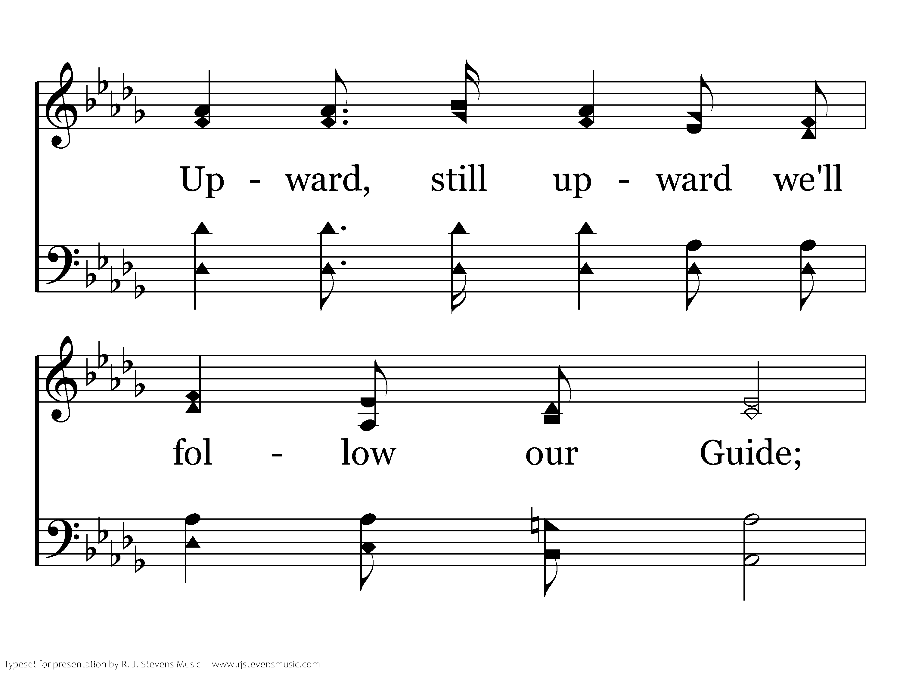 Trying to walk in the steps of the Savior, Upward, still upward we'll follow our Guide; When we shall see Him, "the King in His beauty," Happy, how happy, our place at His side.