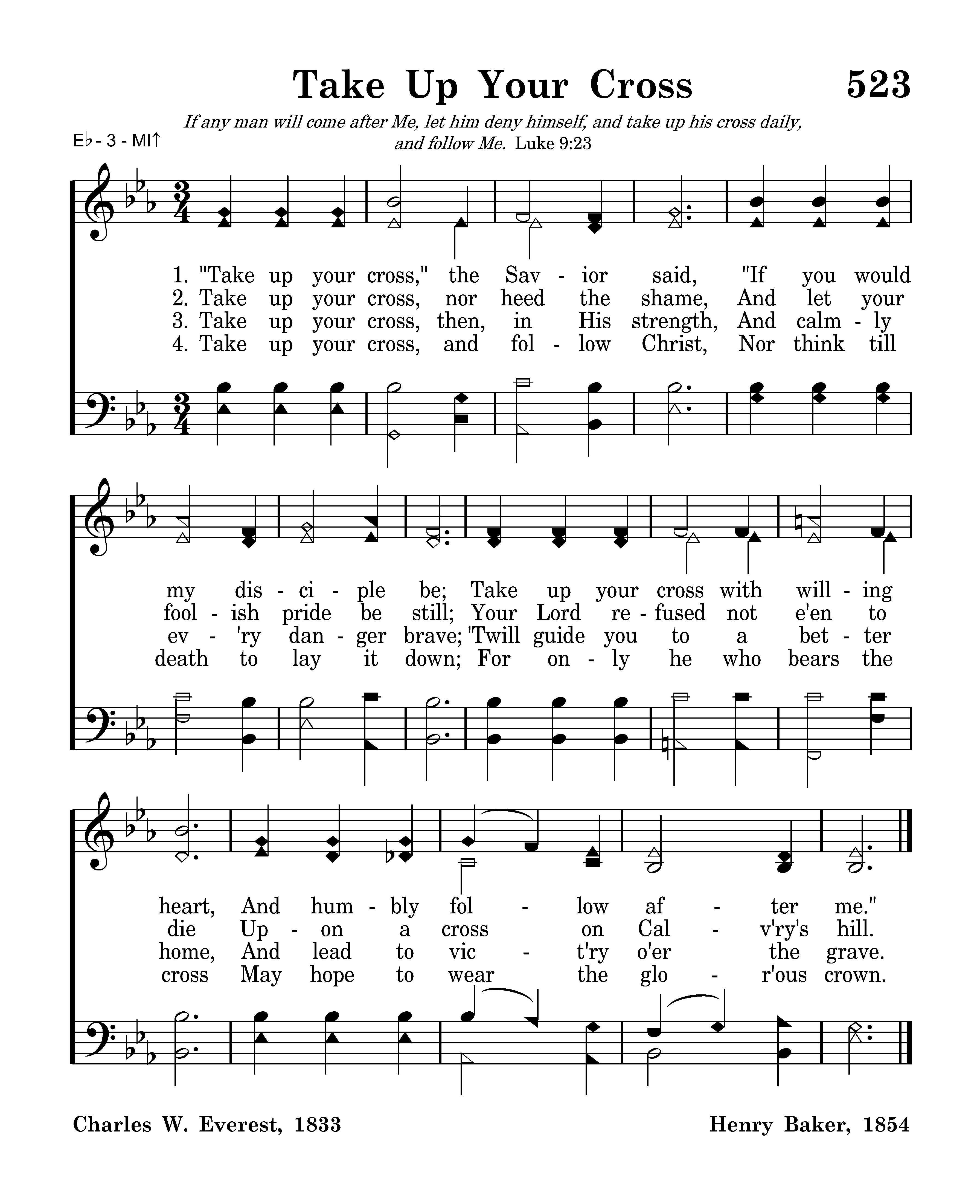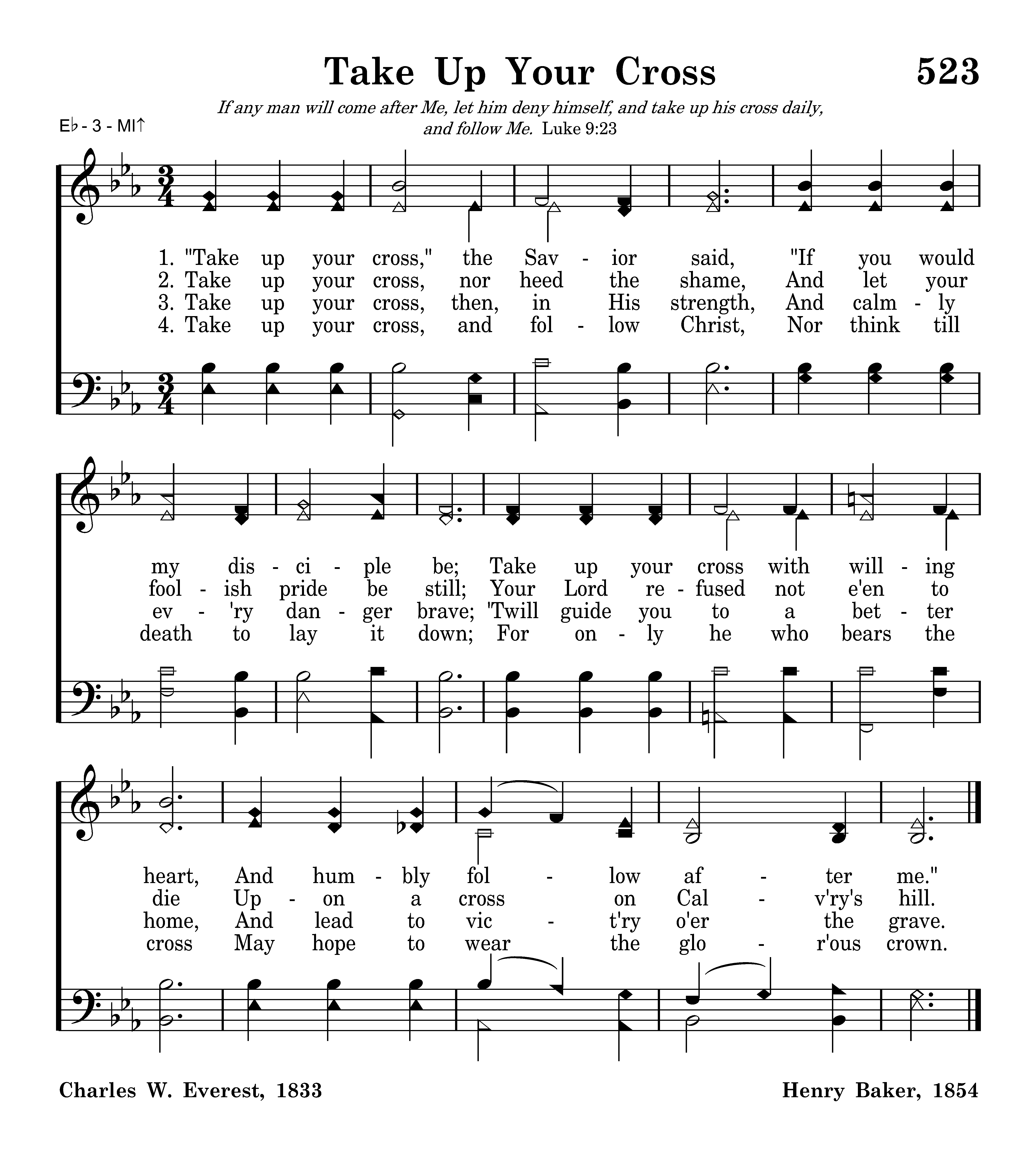 Take up your cross, and follow Christ, Nor think till death to lay it down; For only he who bears the cross May hope to wear the glor'ous crown.