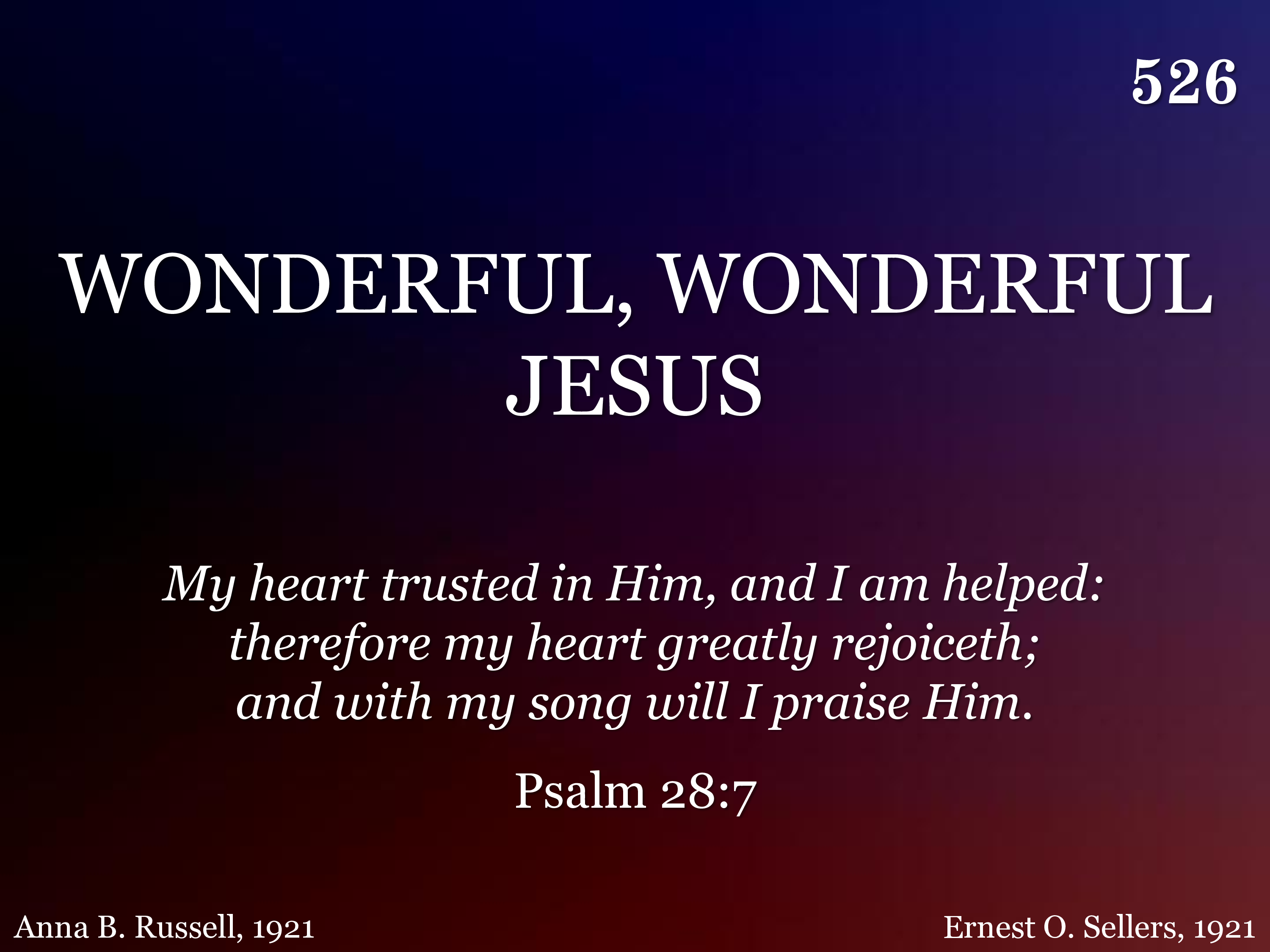 Key Value Title Wonderful, Wonderful Jesus Number 526 Hymnal Hymns For Worship (Revised) Key Signature Bb Starting Pitch