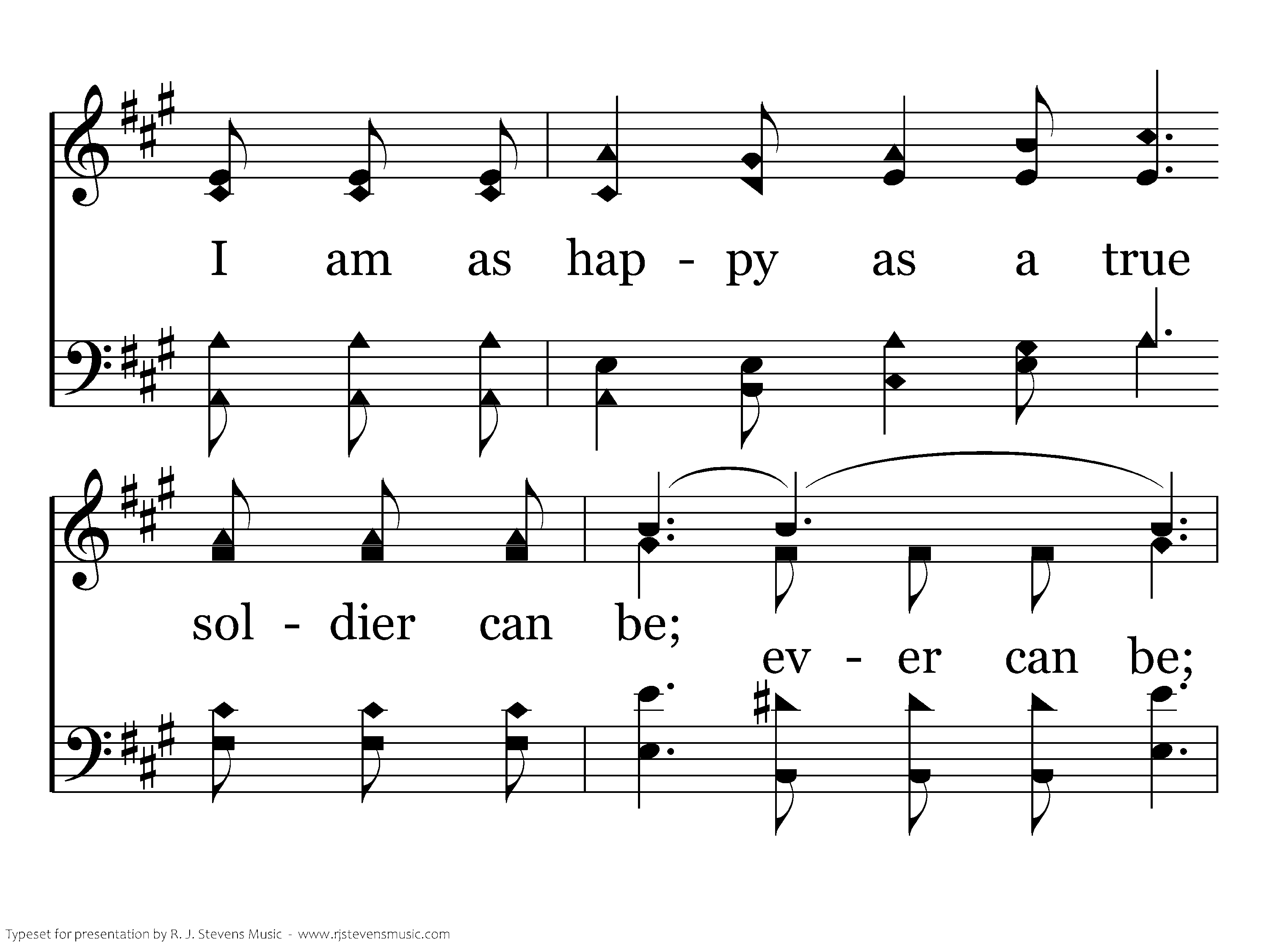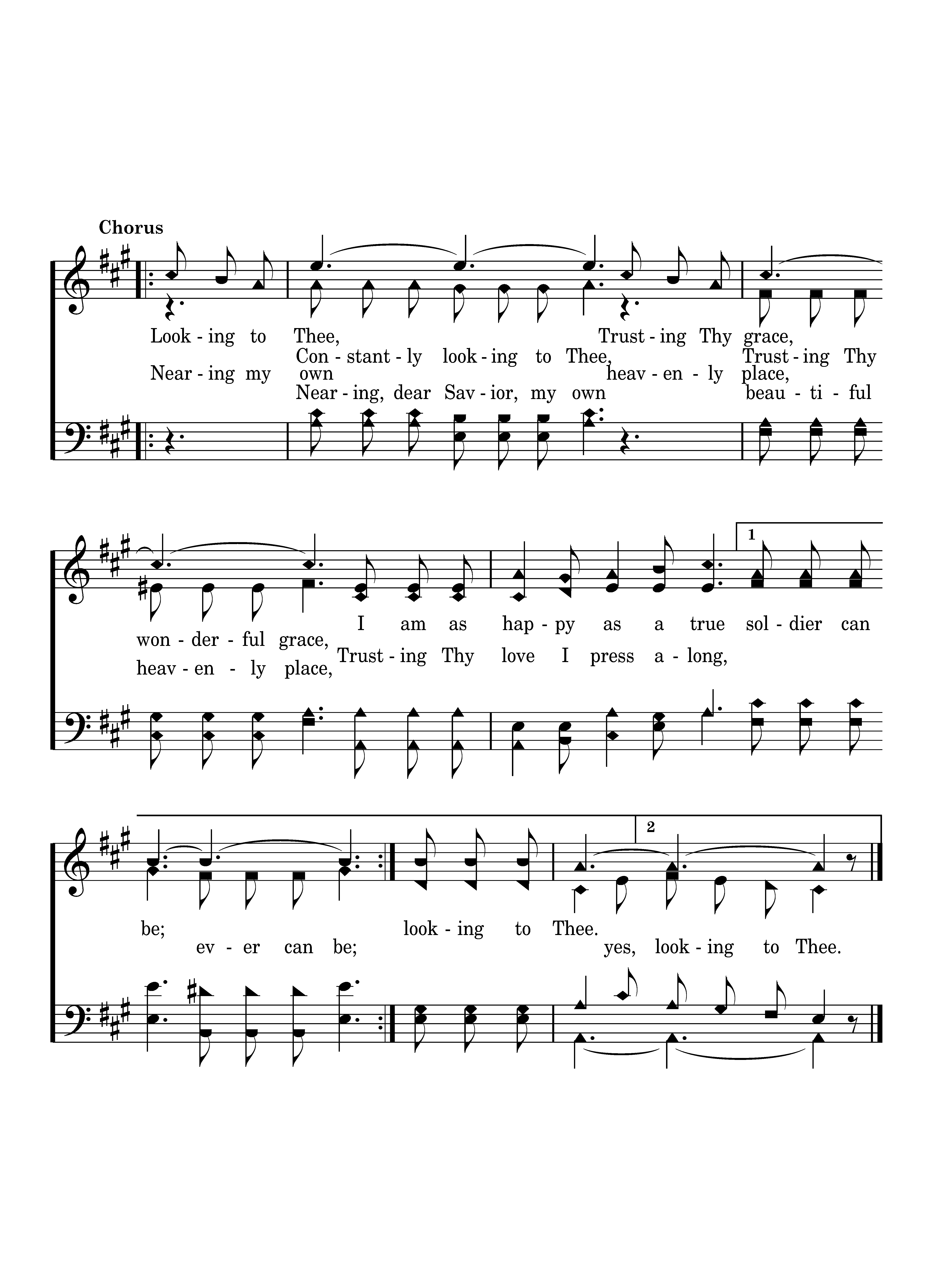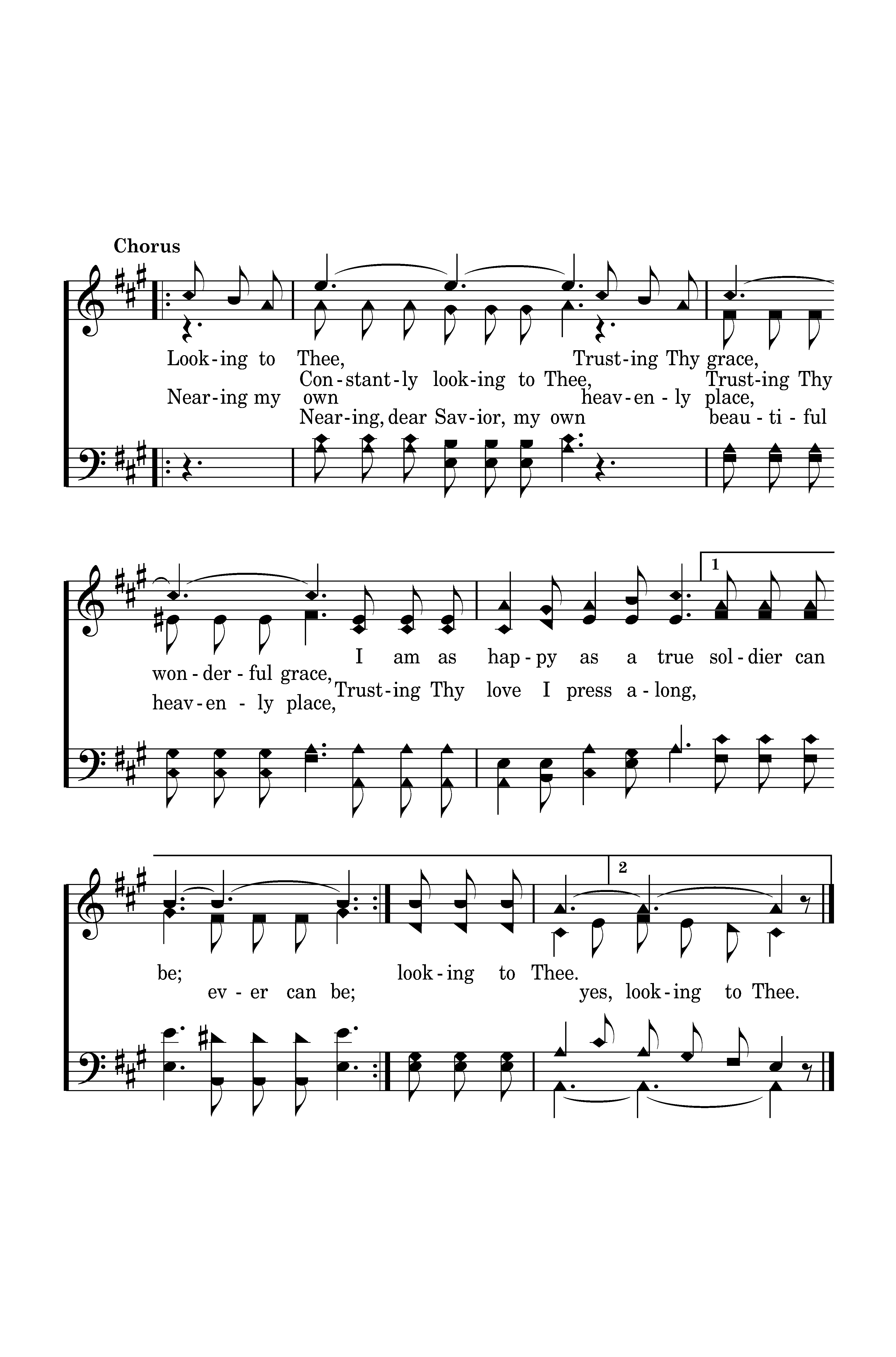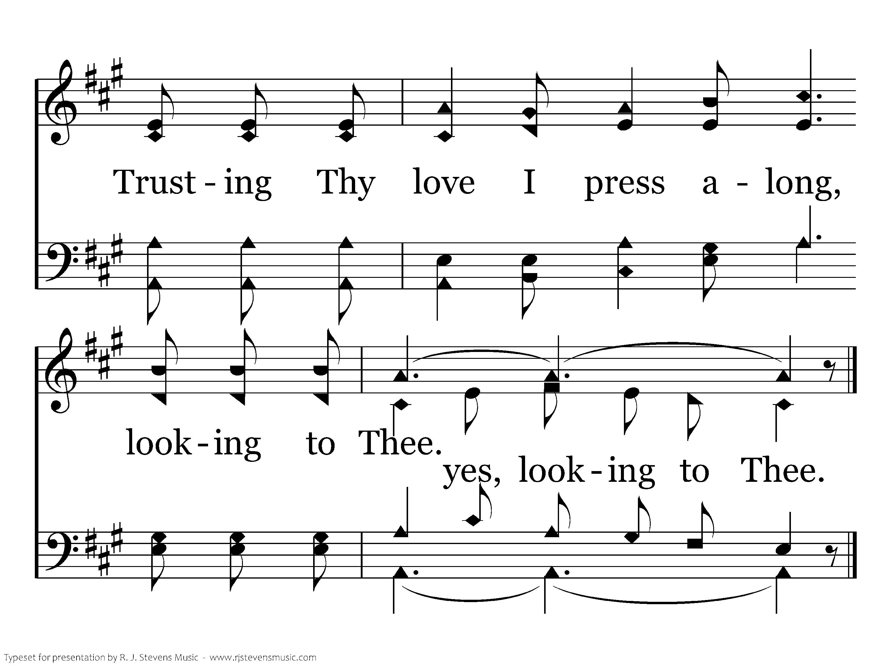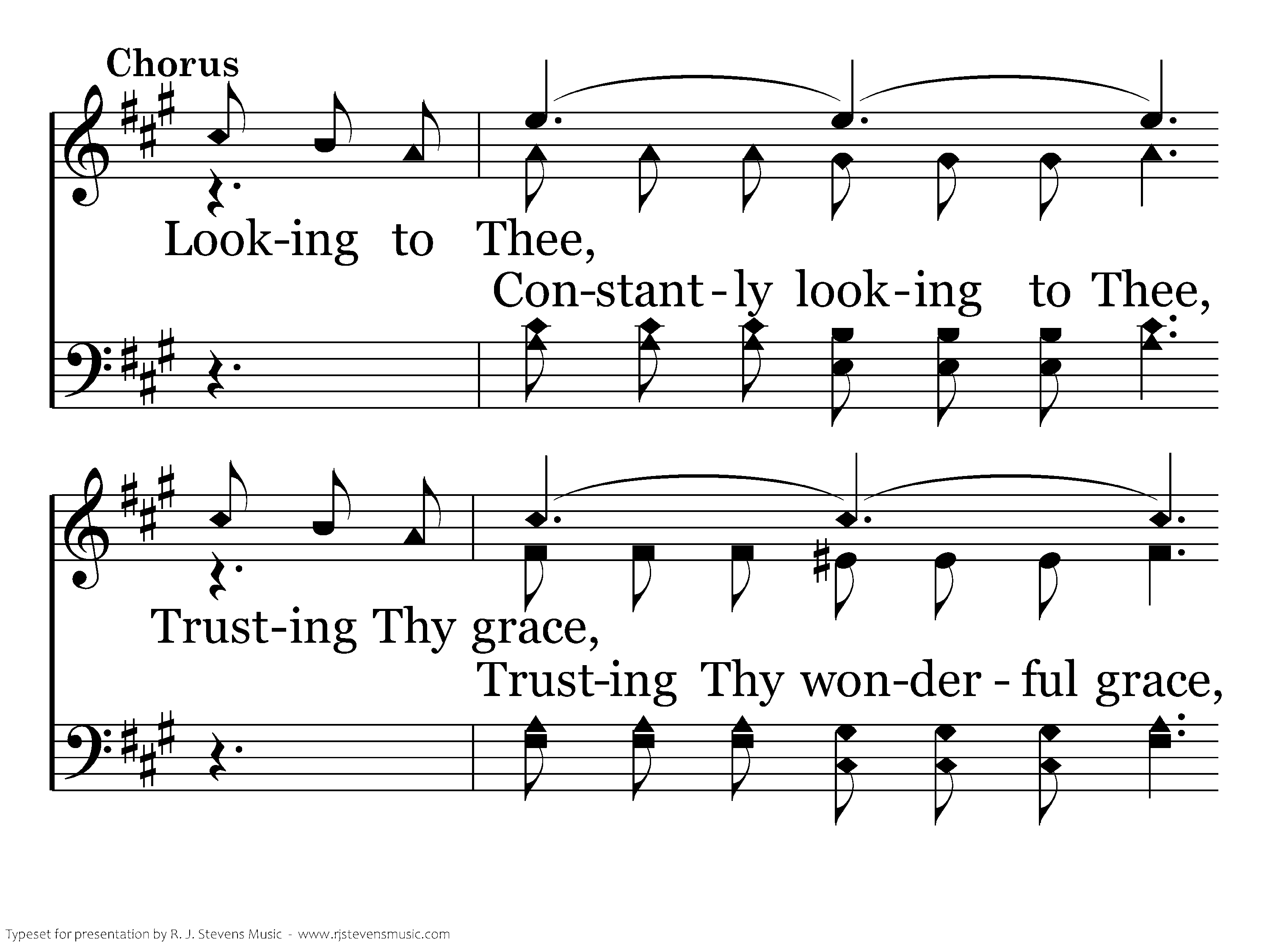 Looking to Thee, Trusting thy grace, I am as happy as a true soldier can be; Nearing my own heavenly place, Trusting Thy love I press along looking to Thee.