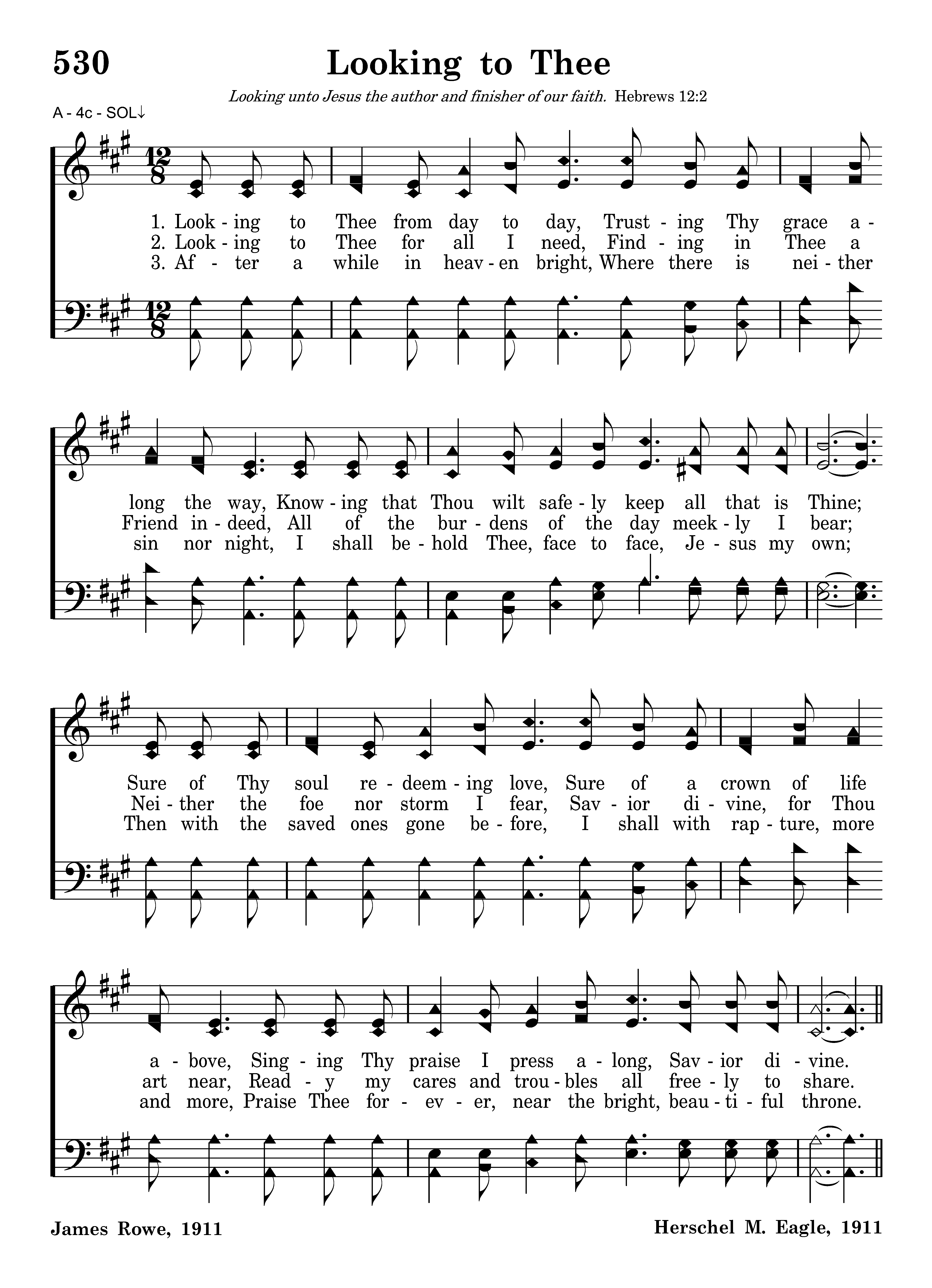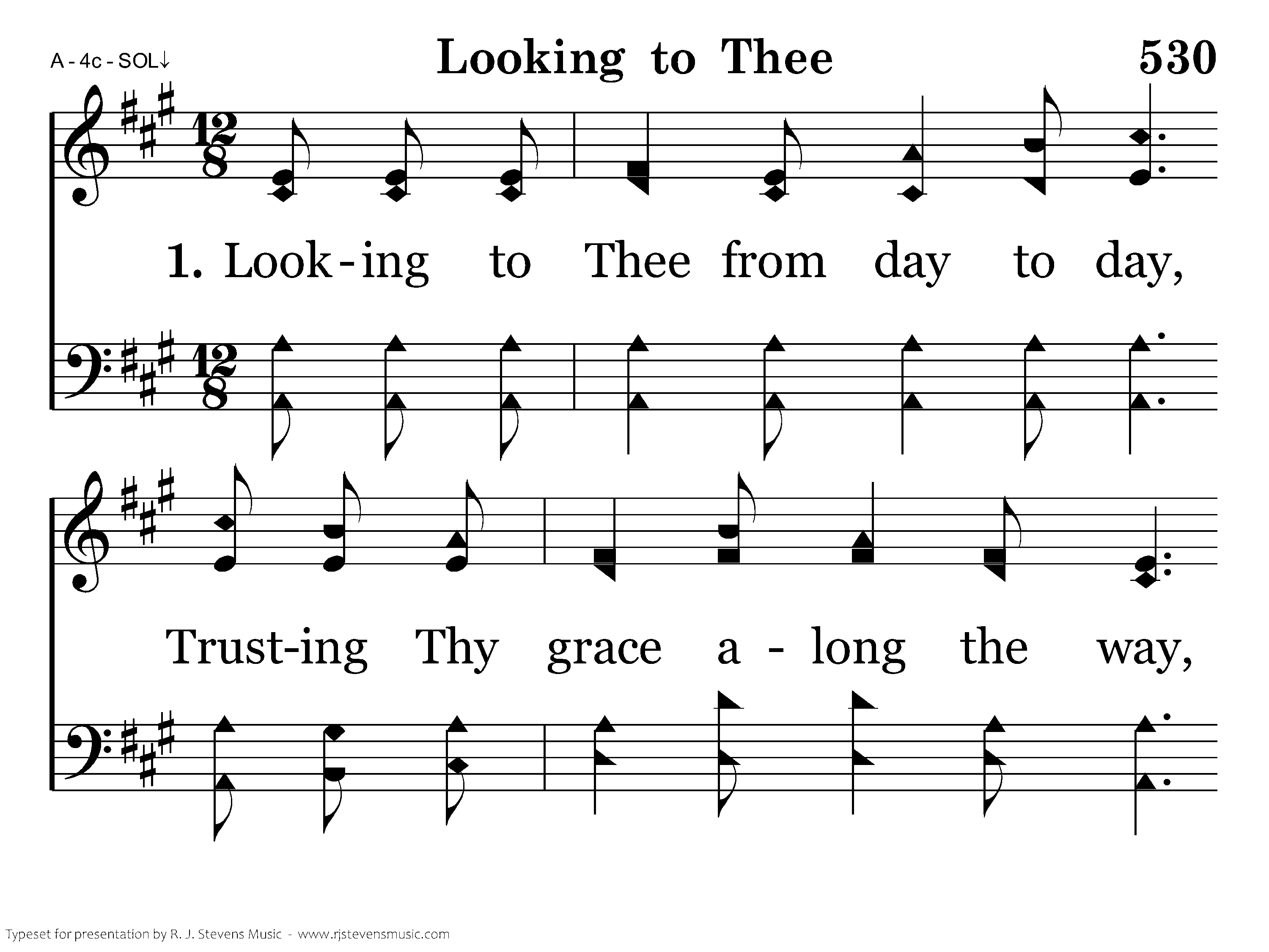 Looking to Thee for all I need, Finding in Thee a Friend indeed, All of the burdens of the day meekly I bear; Neither the foe nor storm I fear, Savior divine, for Thou art near, Ready my cares and troubles all freely to share.