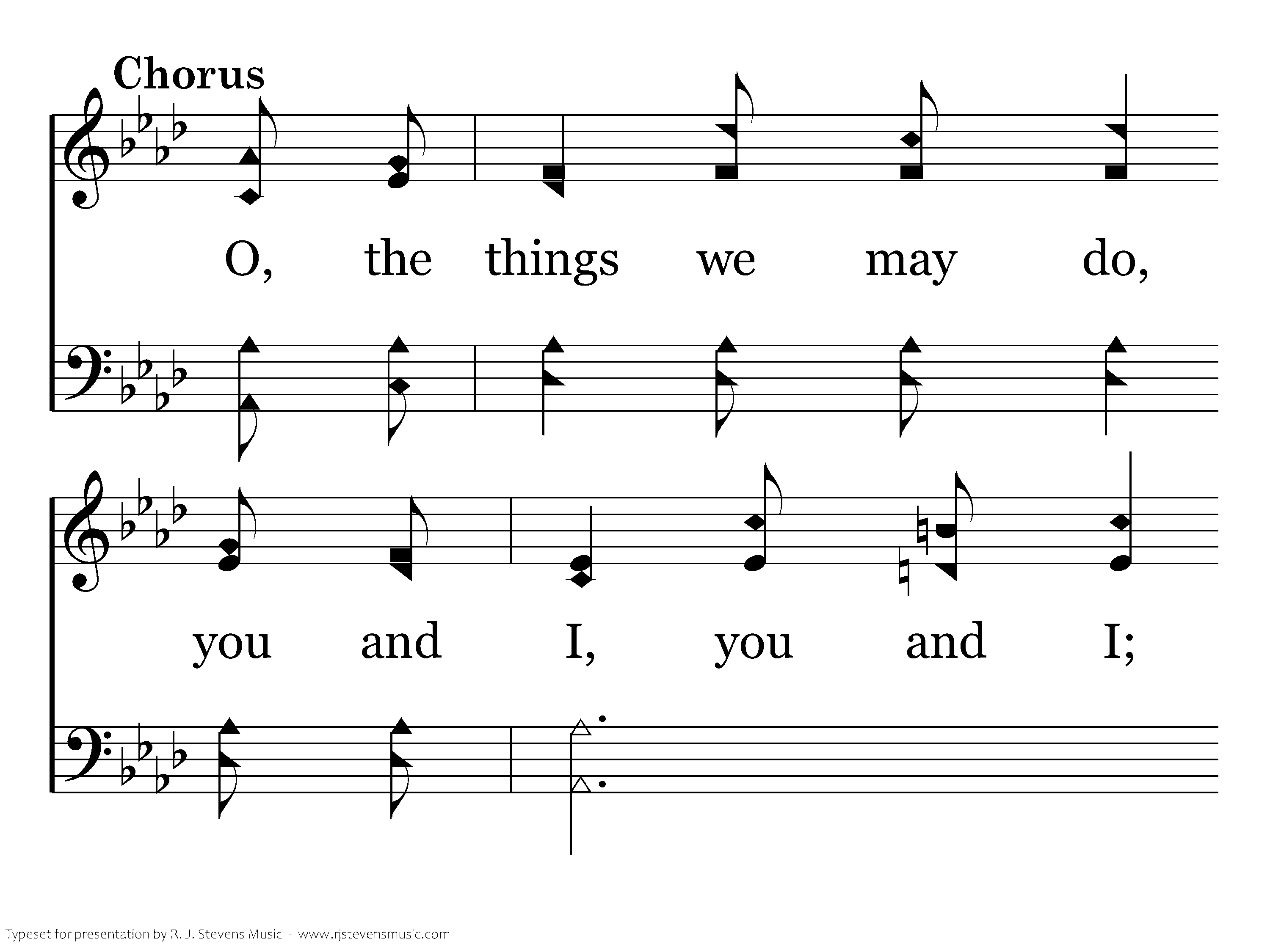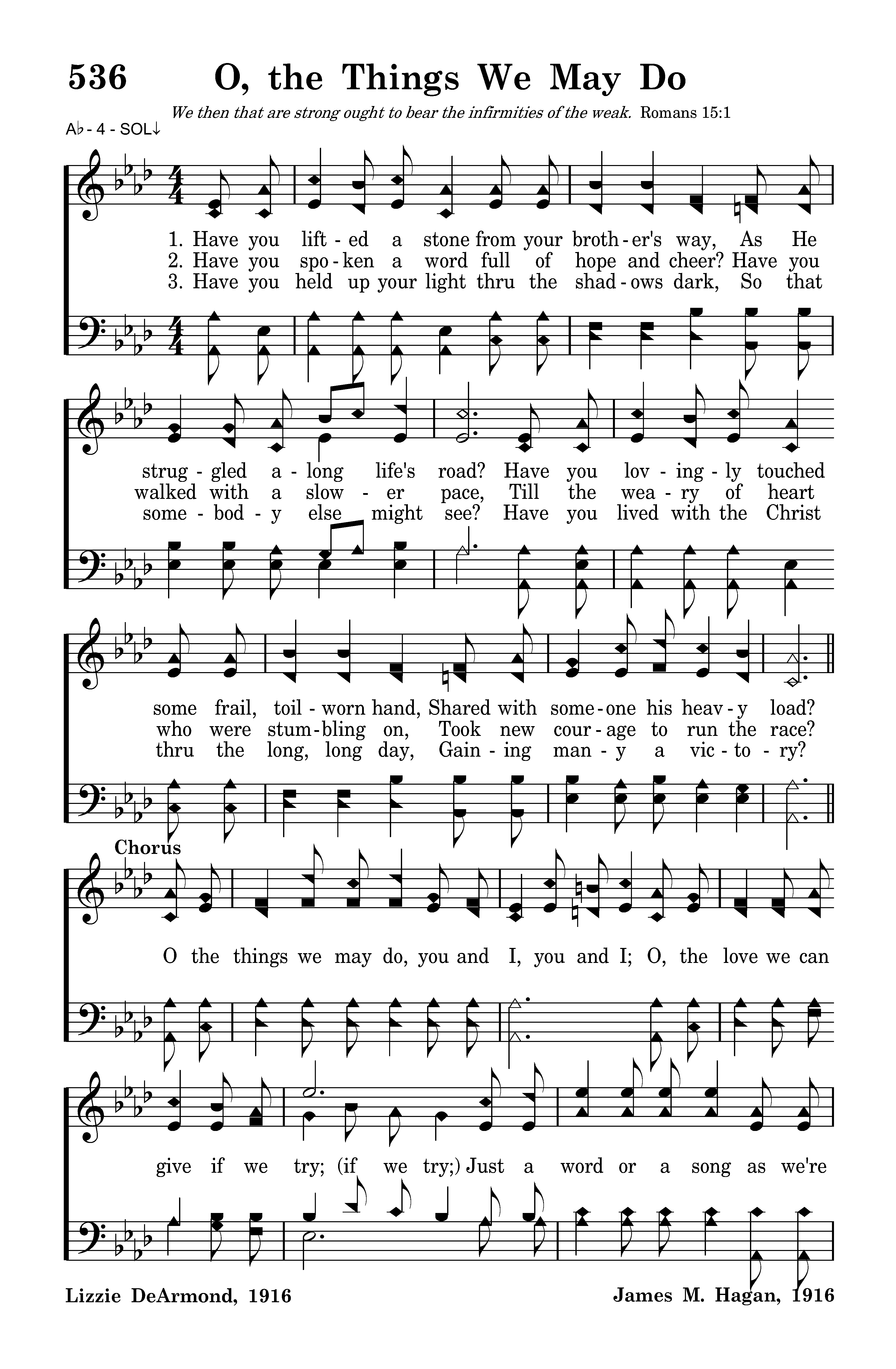 O the things we may do, you and I, you and I, O, the love we can give if we try, Just a word or a song as we're passing along, They will count in the great by and by.