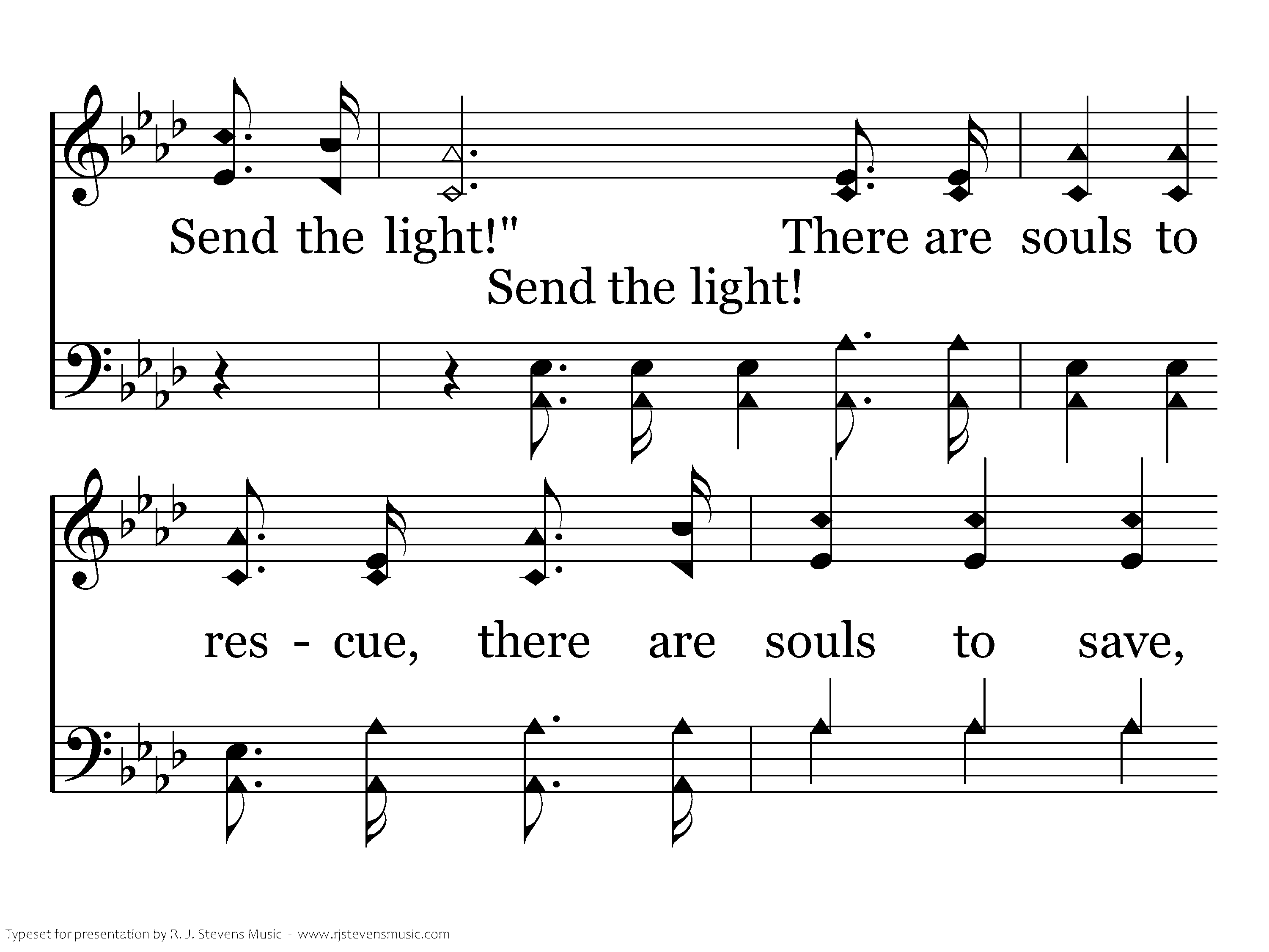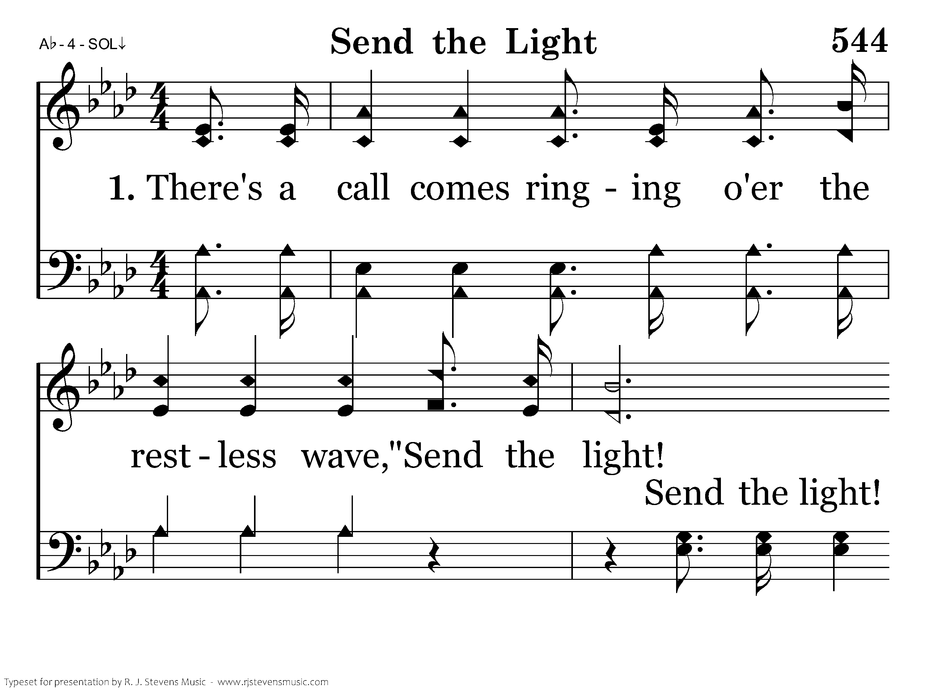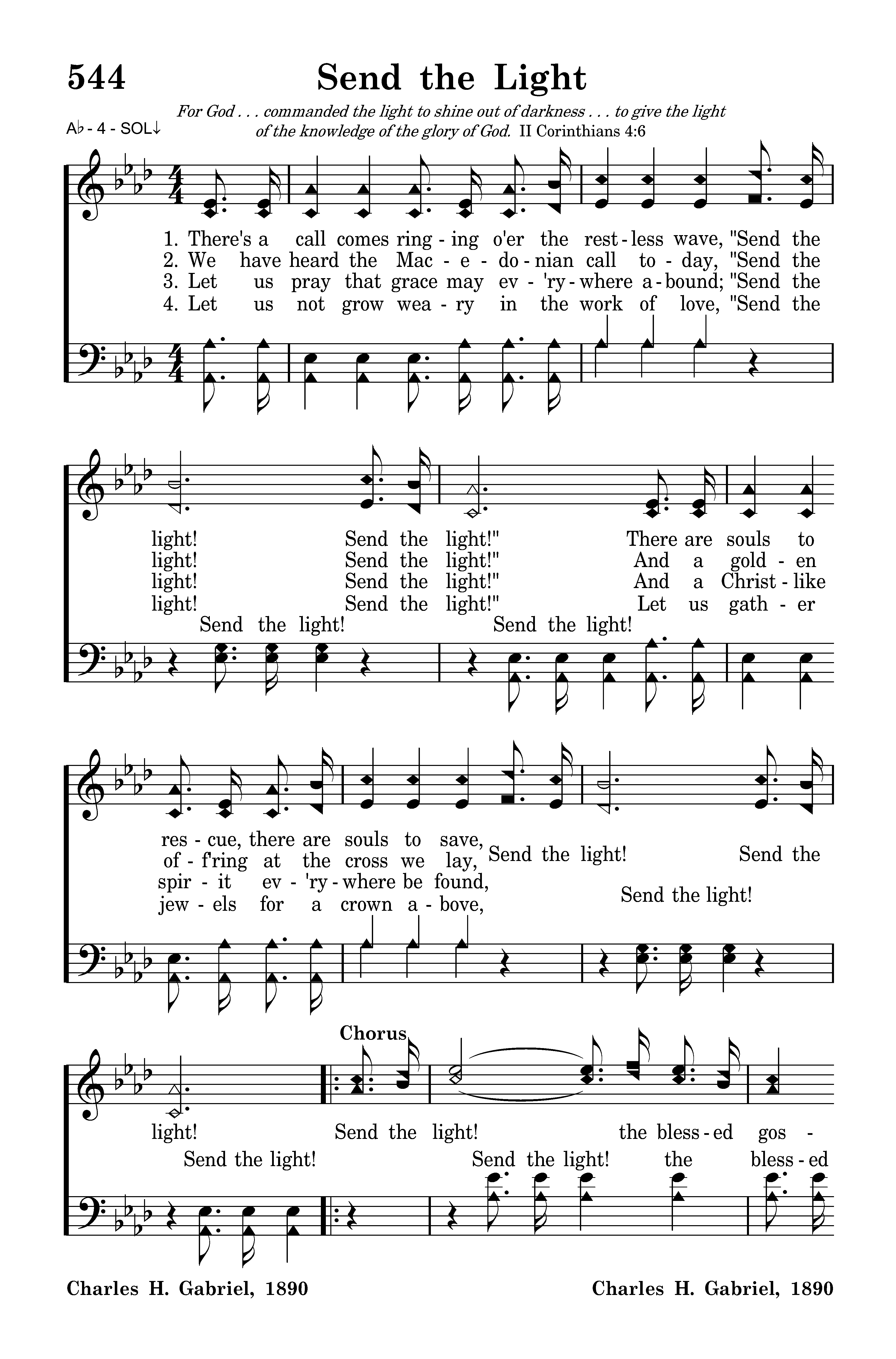 There's a call comes ringing o'er the restless wave, "Send the light! Send the light!" There are souls to rescue, there are souls to save, "Send the light! Send the light!"