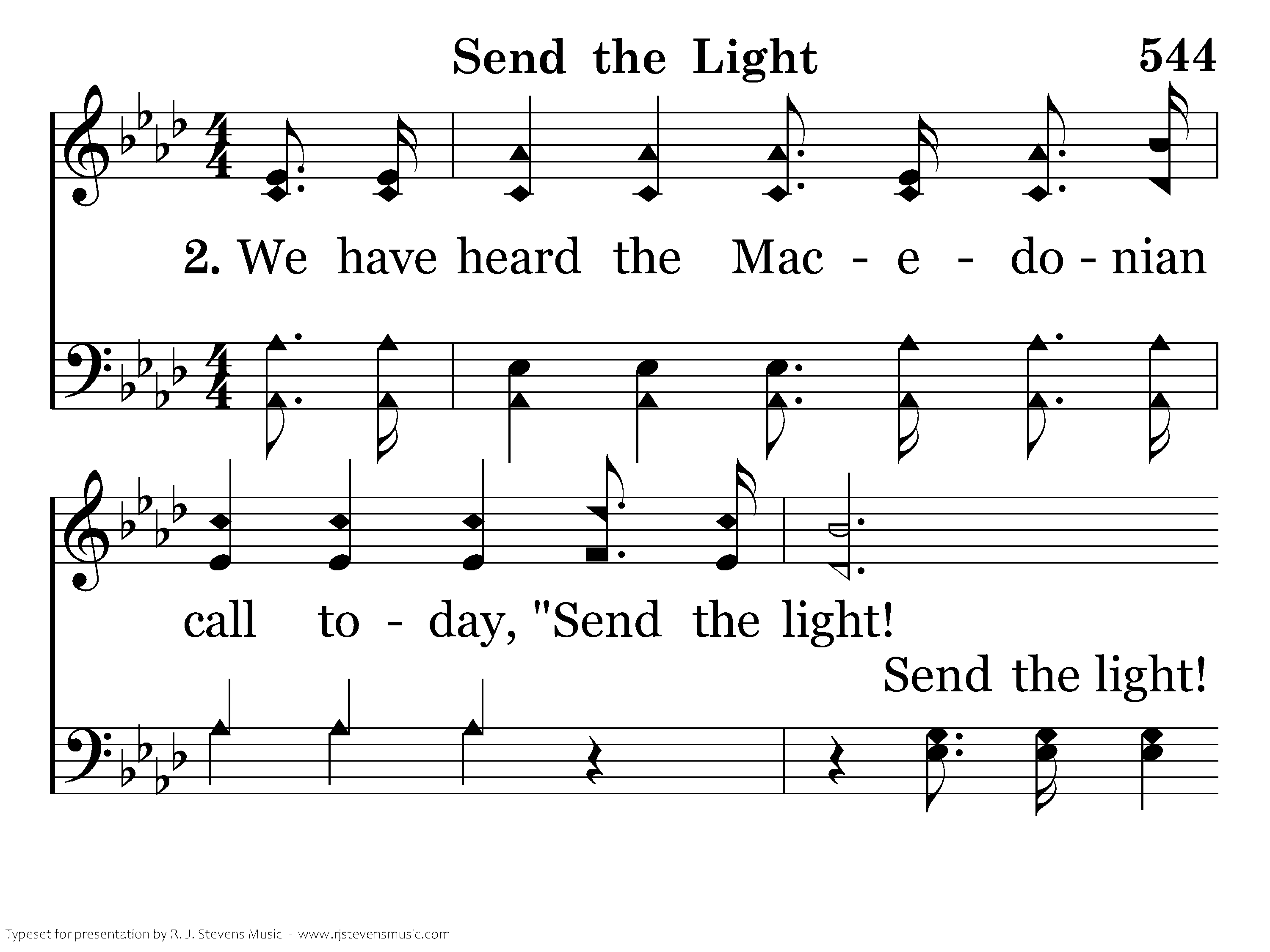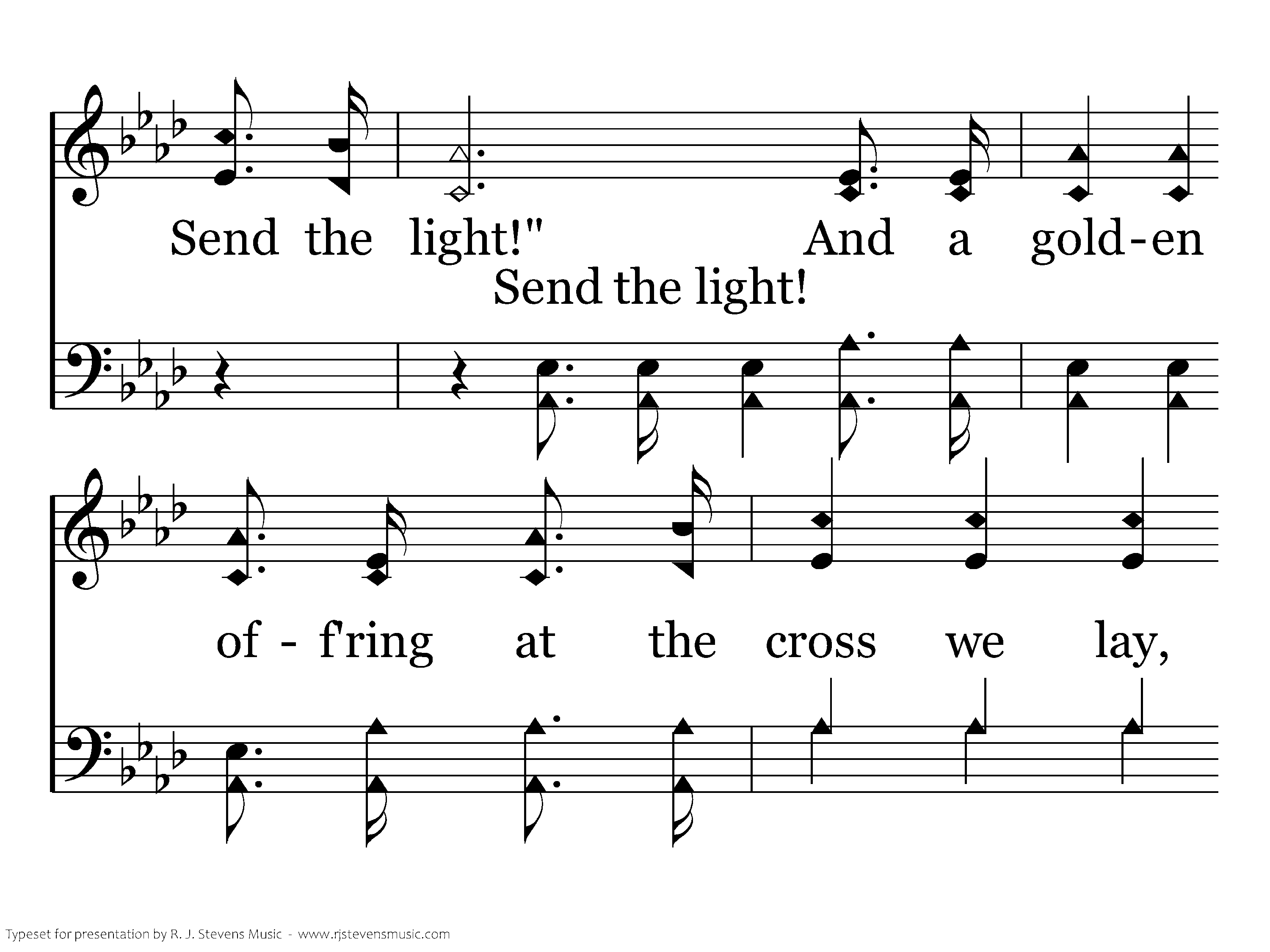 We have heard the Macedonian call today, "Send the light! Send the light!" And a golden off'ring at the cross we lay, "Send the light! Send the light!"