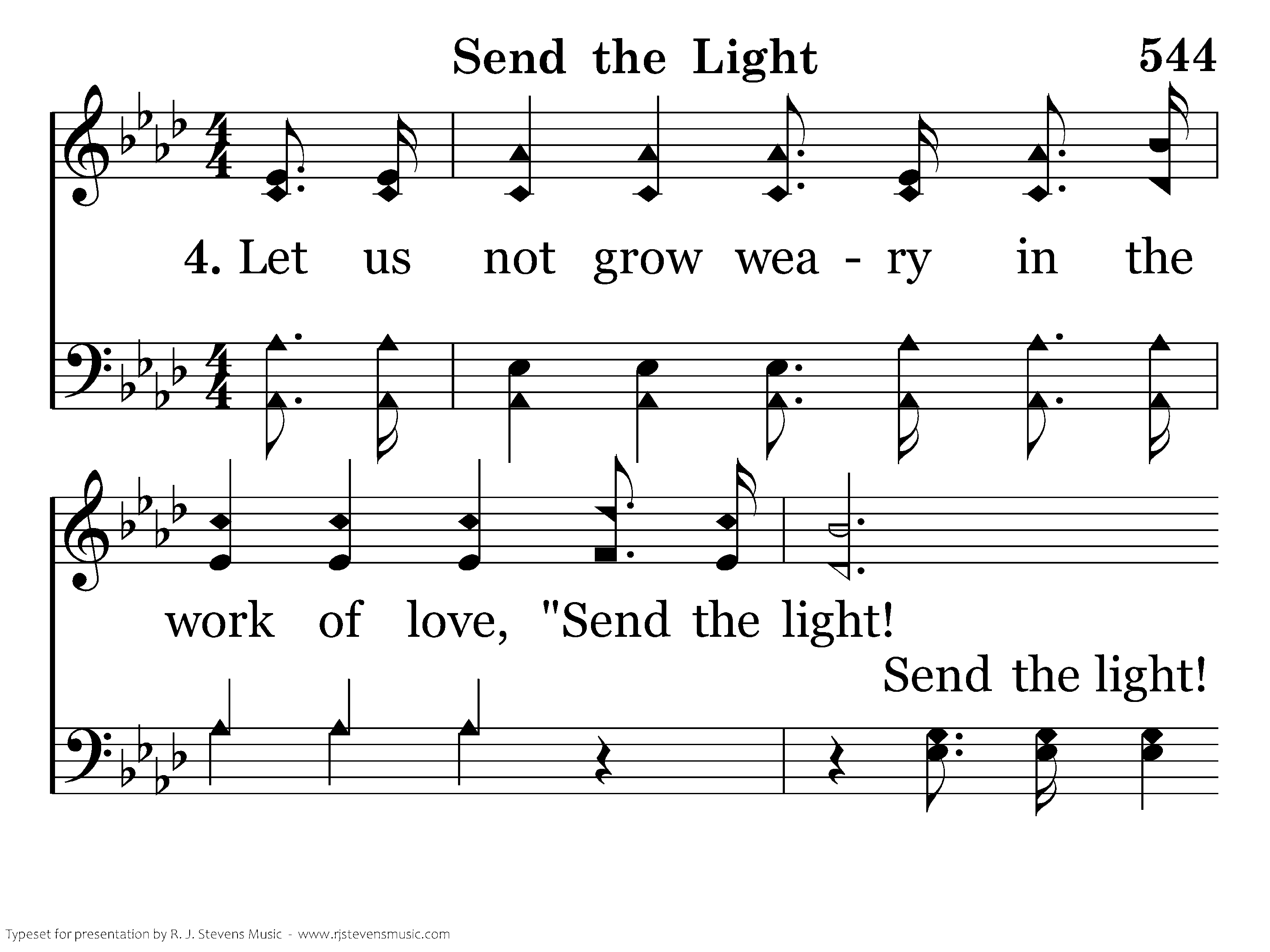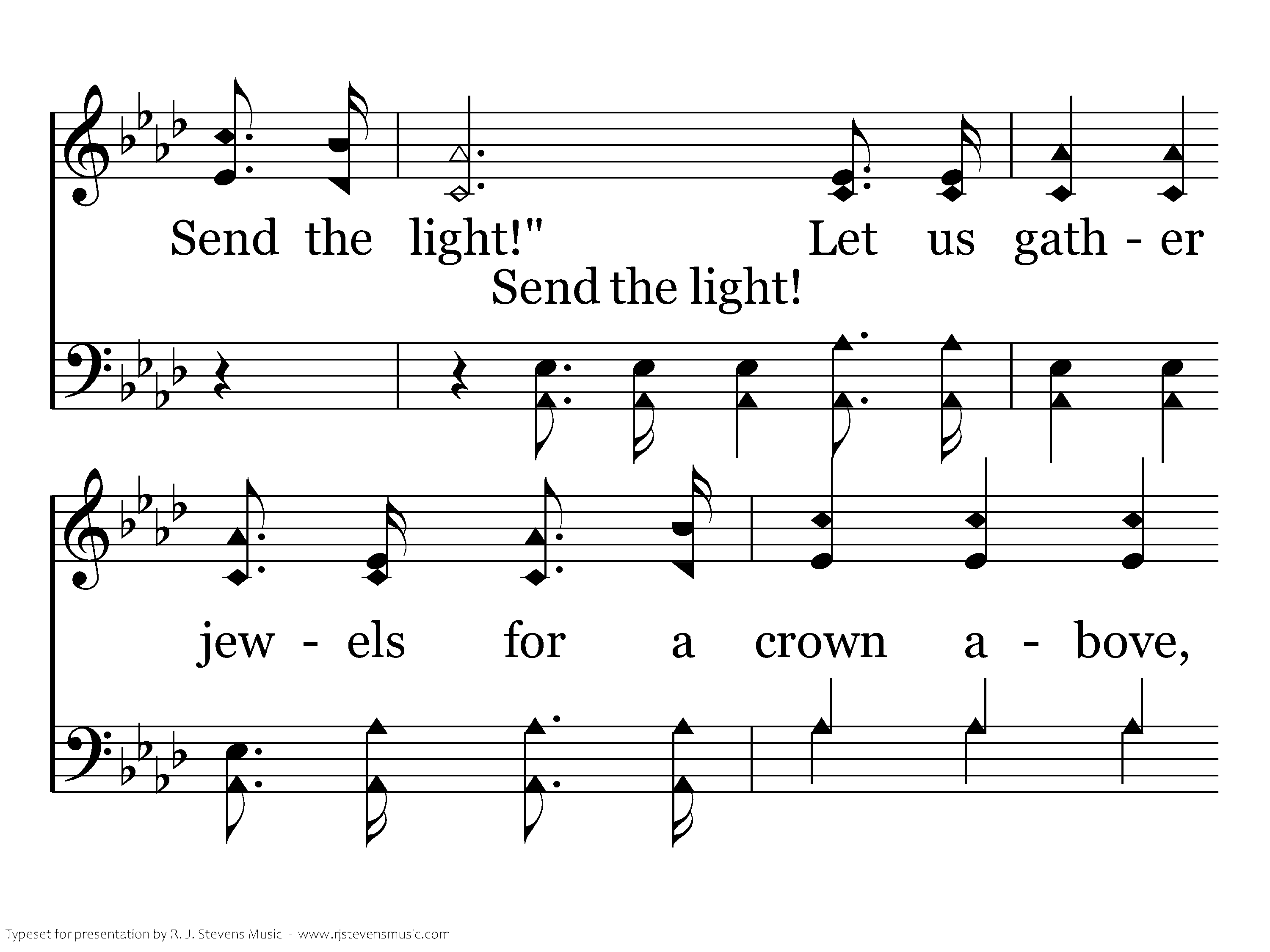 Let us not grow weary in the work of love, "Send the light! Send the light!" Let us gather jewels for a crown above, "Send the light! Send the light!"