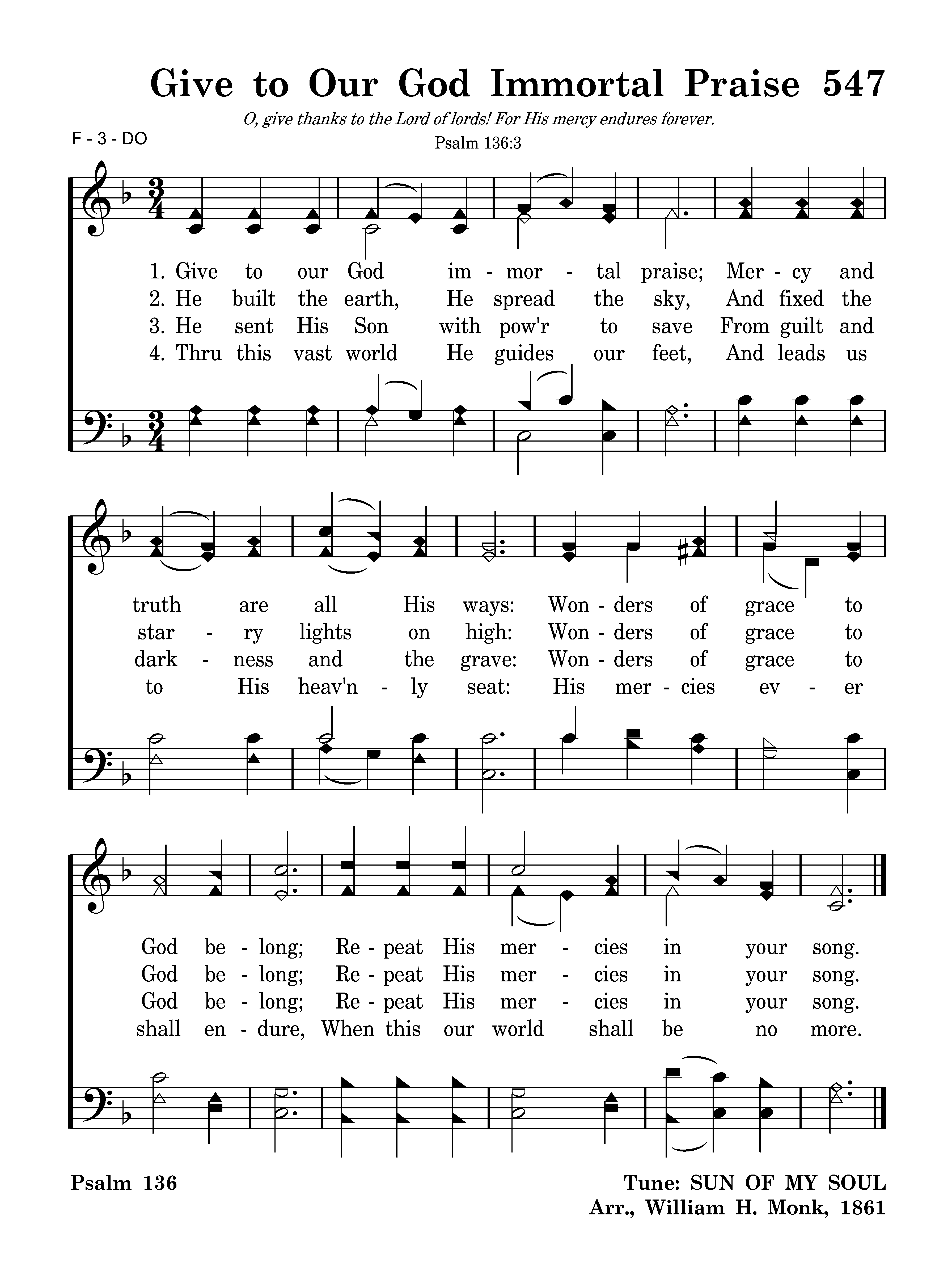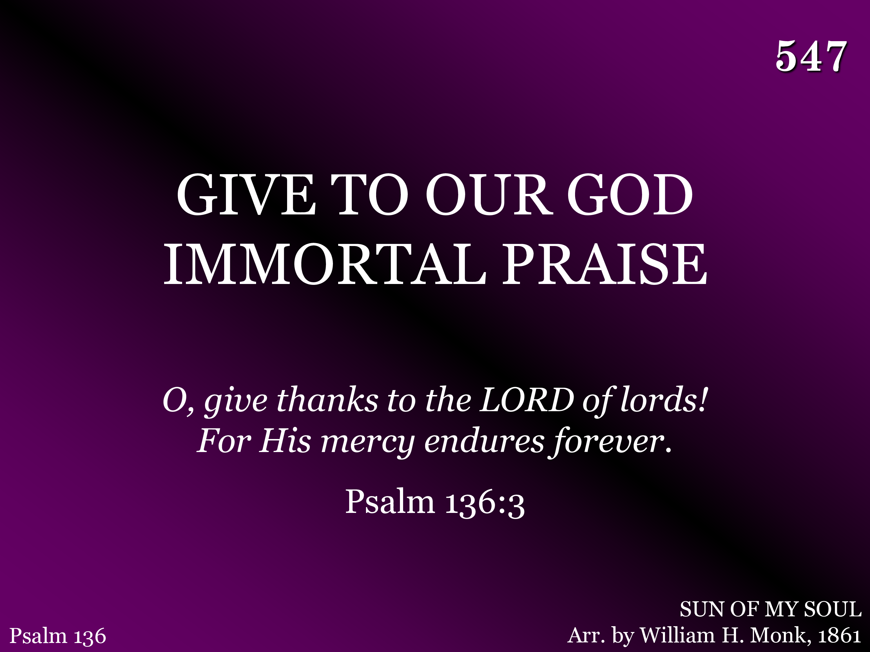 Give to our God immortal praise; Mercy and truth are all His ways: Wonders of grace to God belong; Repeat His mercies in your song.