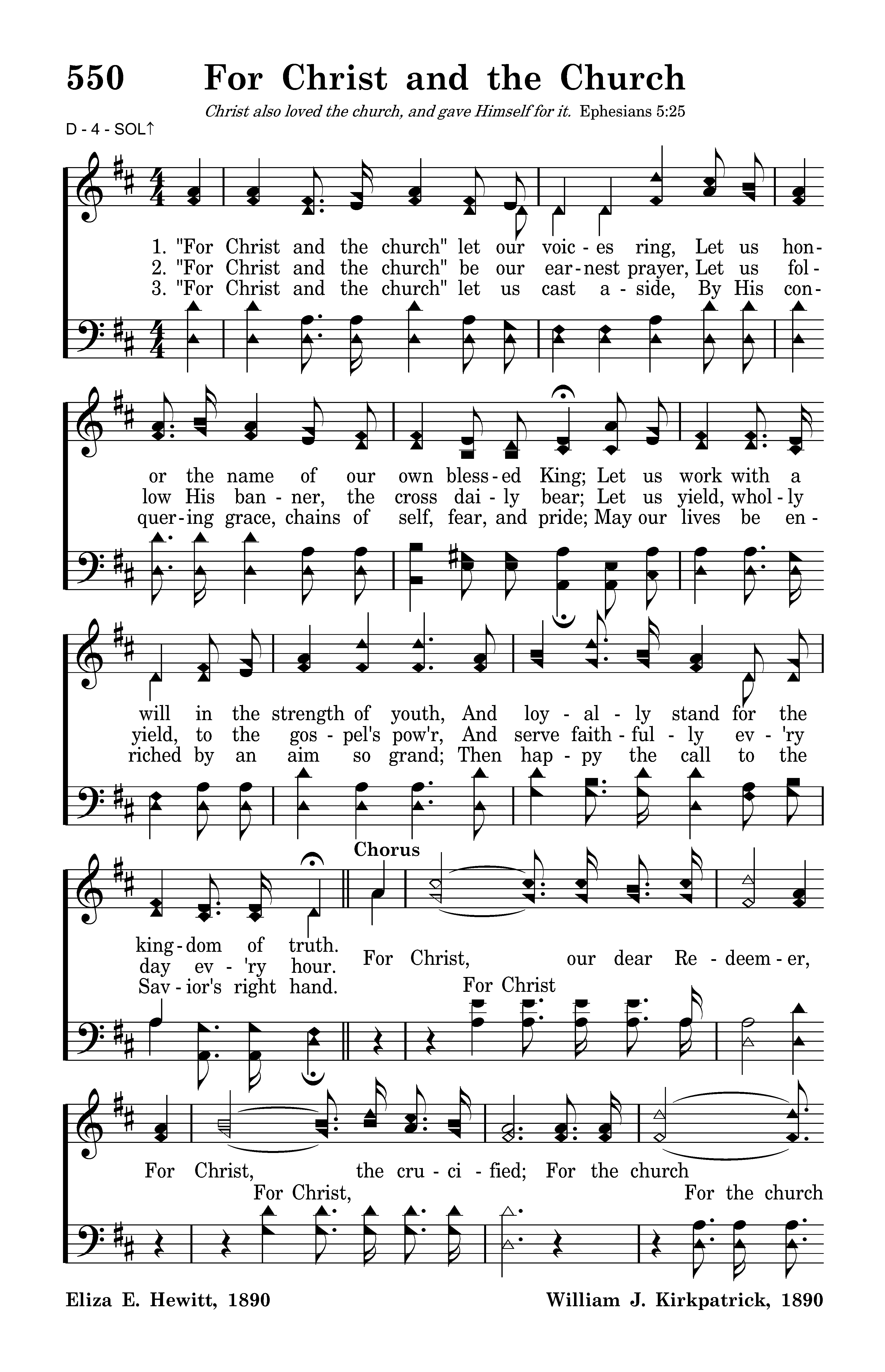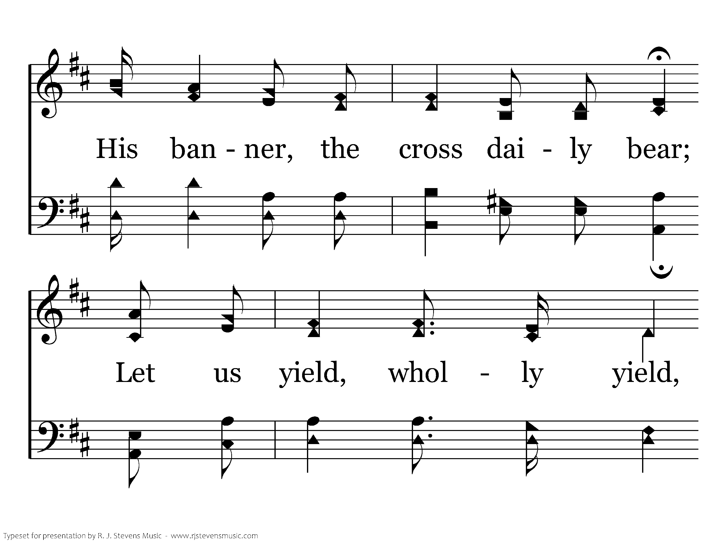"For Christ and the church" be our earnest prayer, Let us follow His banner, the cross daily bear; Let us yield, wholly yield, to the gospel's pow'r, And serve faithfully ev'ry day ev'ry hour.
