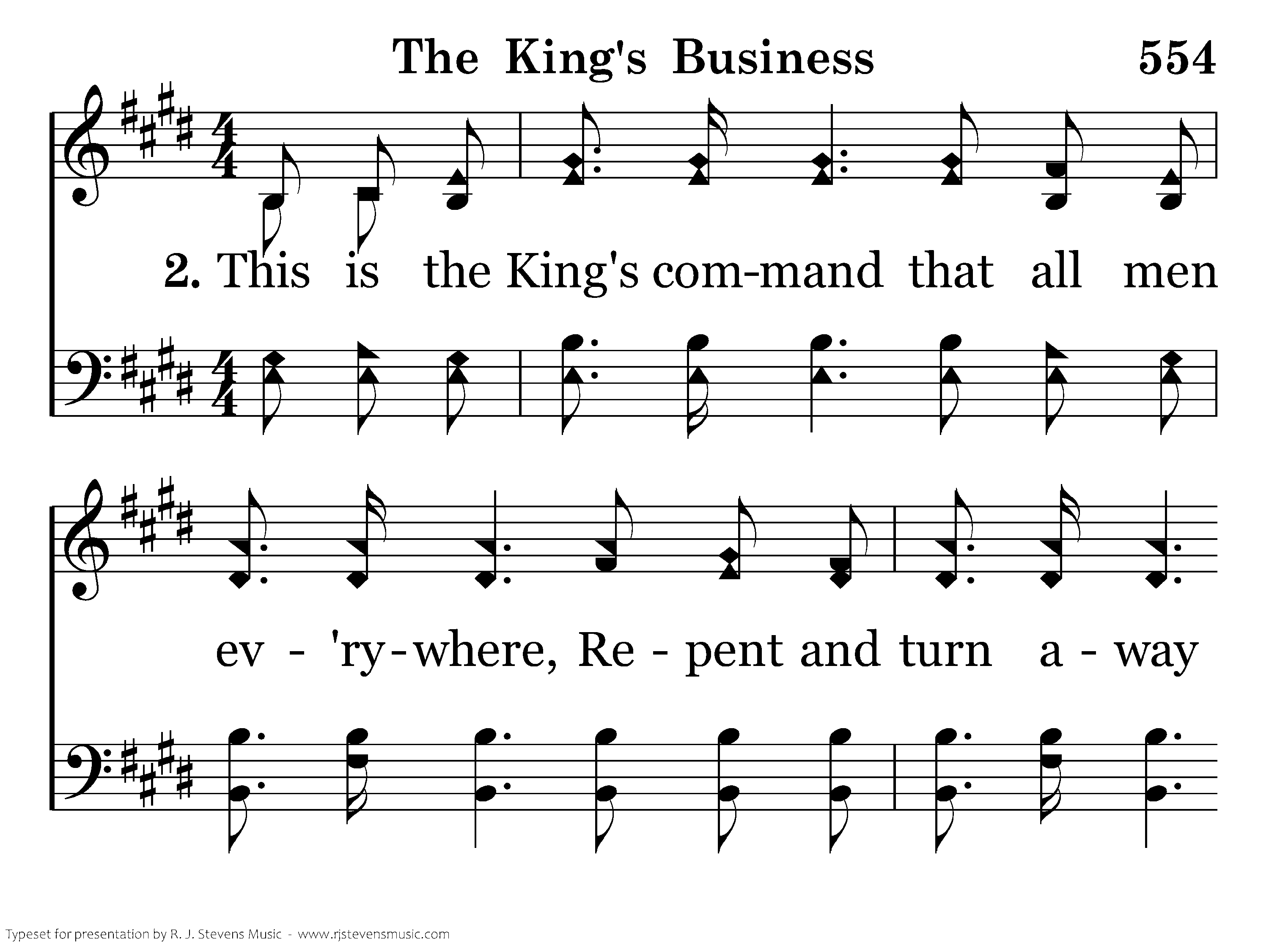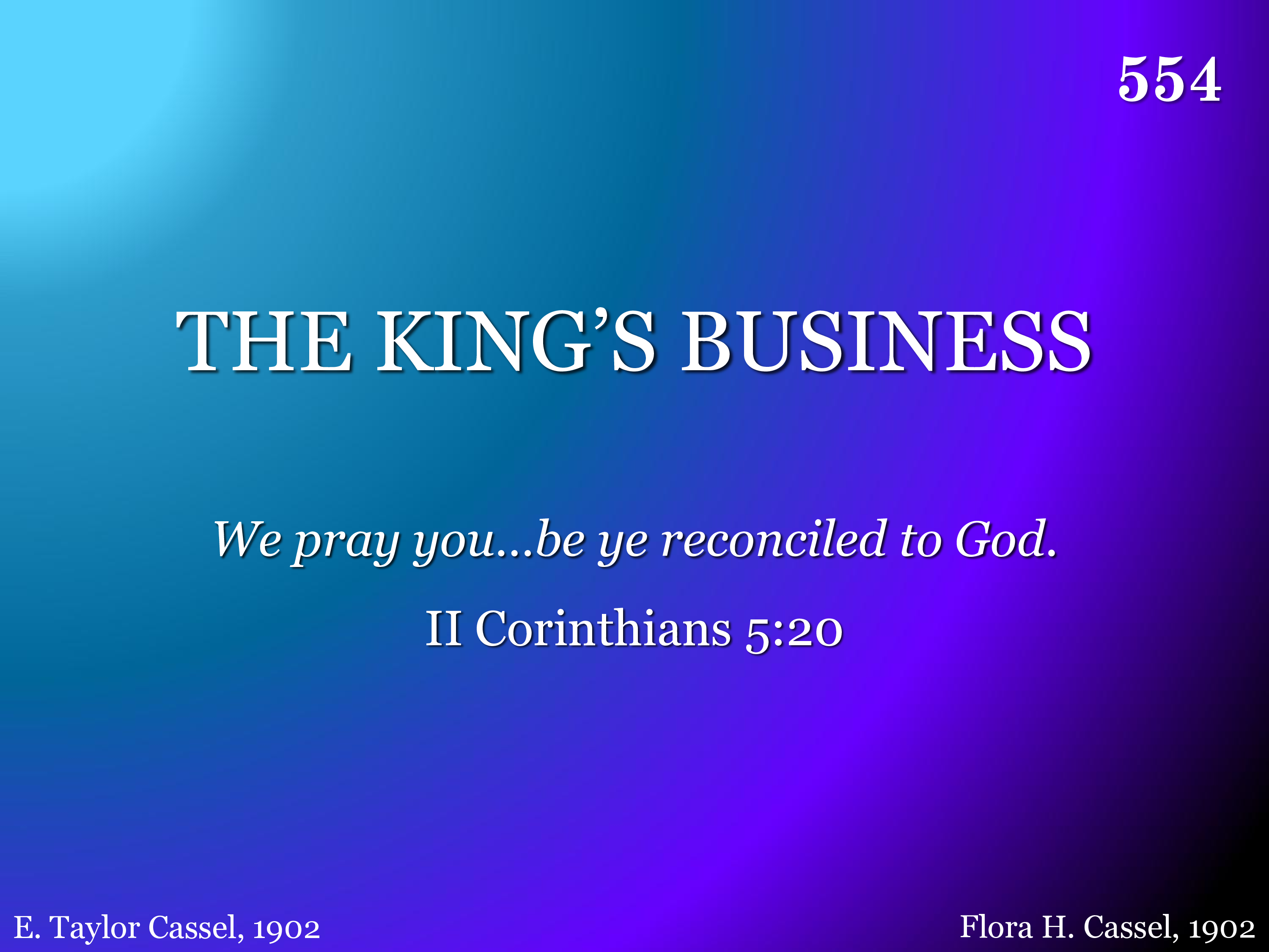 This is the King's command that all men ev'rywhere, Repent and turn away from sin's seductive snare; That all who will obey, with Him shall live for aye, And that's my bus'ness for my King. This is the message that I bring, A message angels fain would sing: "O, be ye reconciled," Thus saith my Lord and King, "O, be ye reconciled to God."