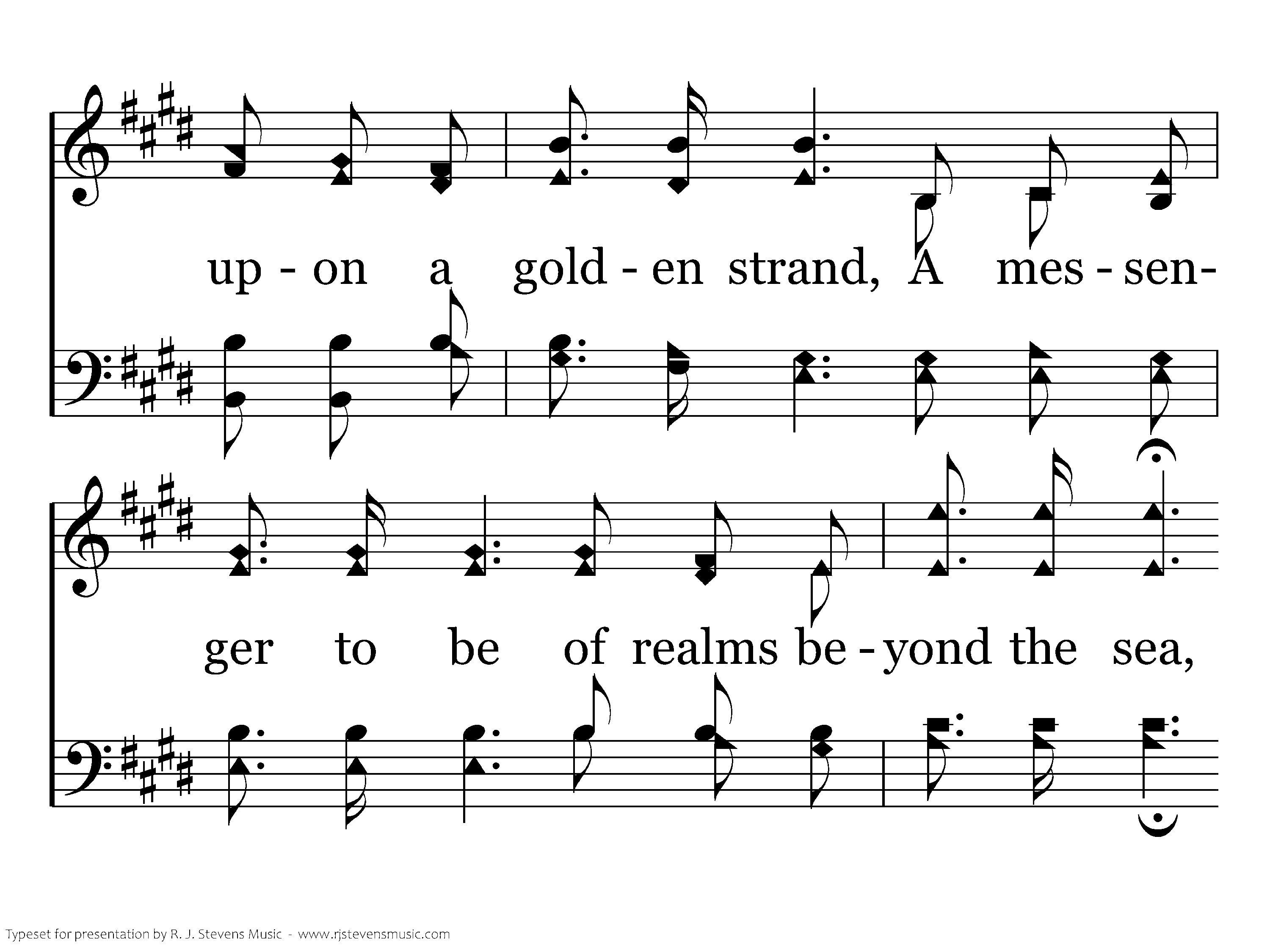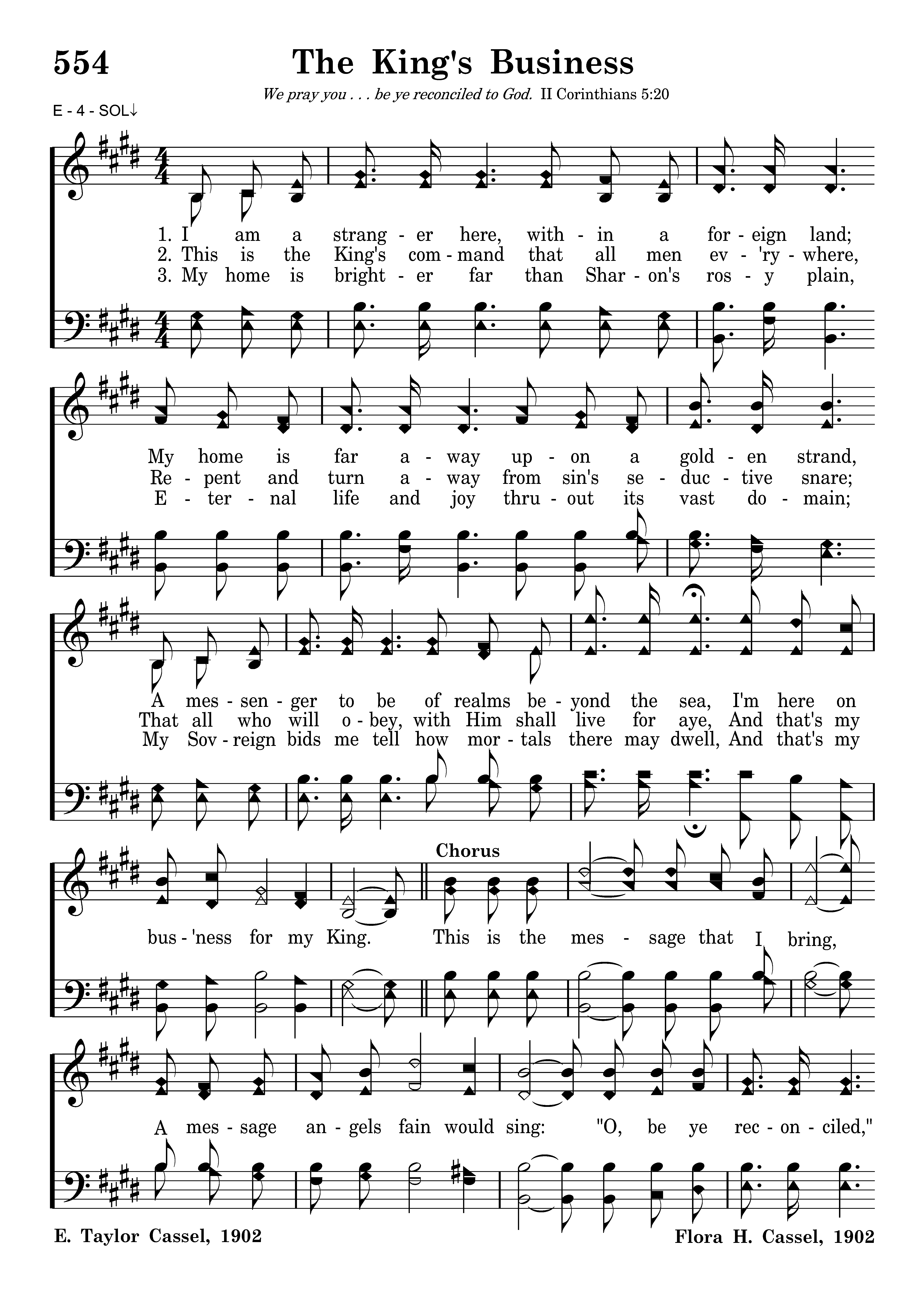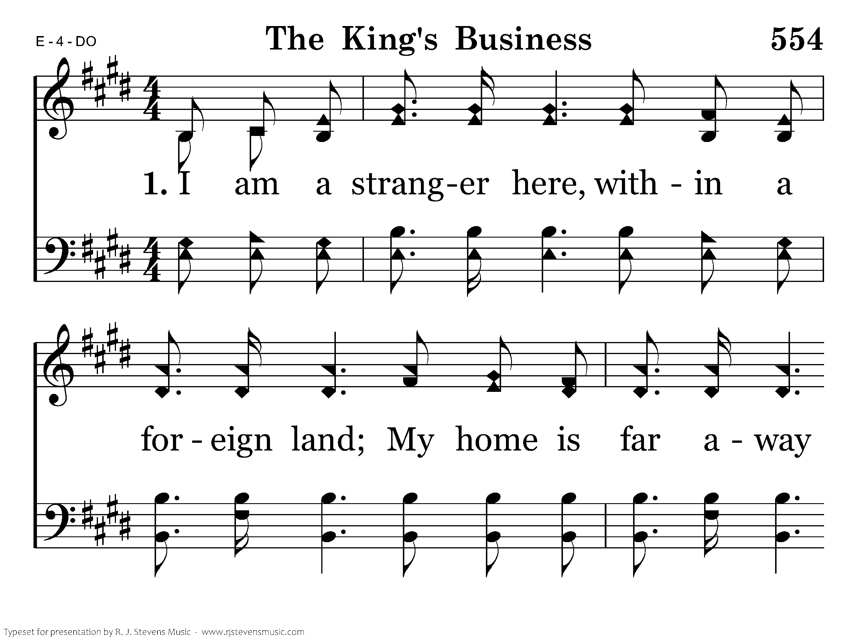 I am a stranger here, within a foreign land; My home is far away upon a golden strand, A messenger to be of realms beyond the sea, I'm here on bus'ness for my King. This is the message that I bring, A message angels fain would sing: "O, be ye reconciled," Thus saith my Lord and King, "O, be ye reconciled to God."