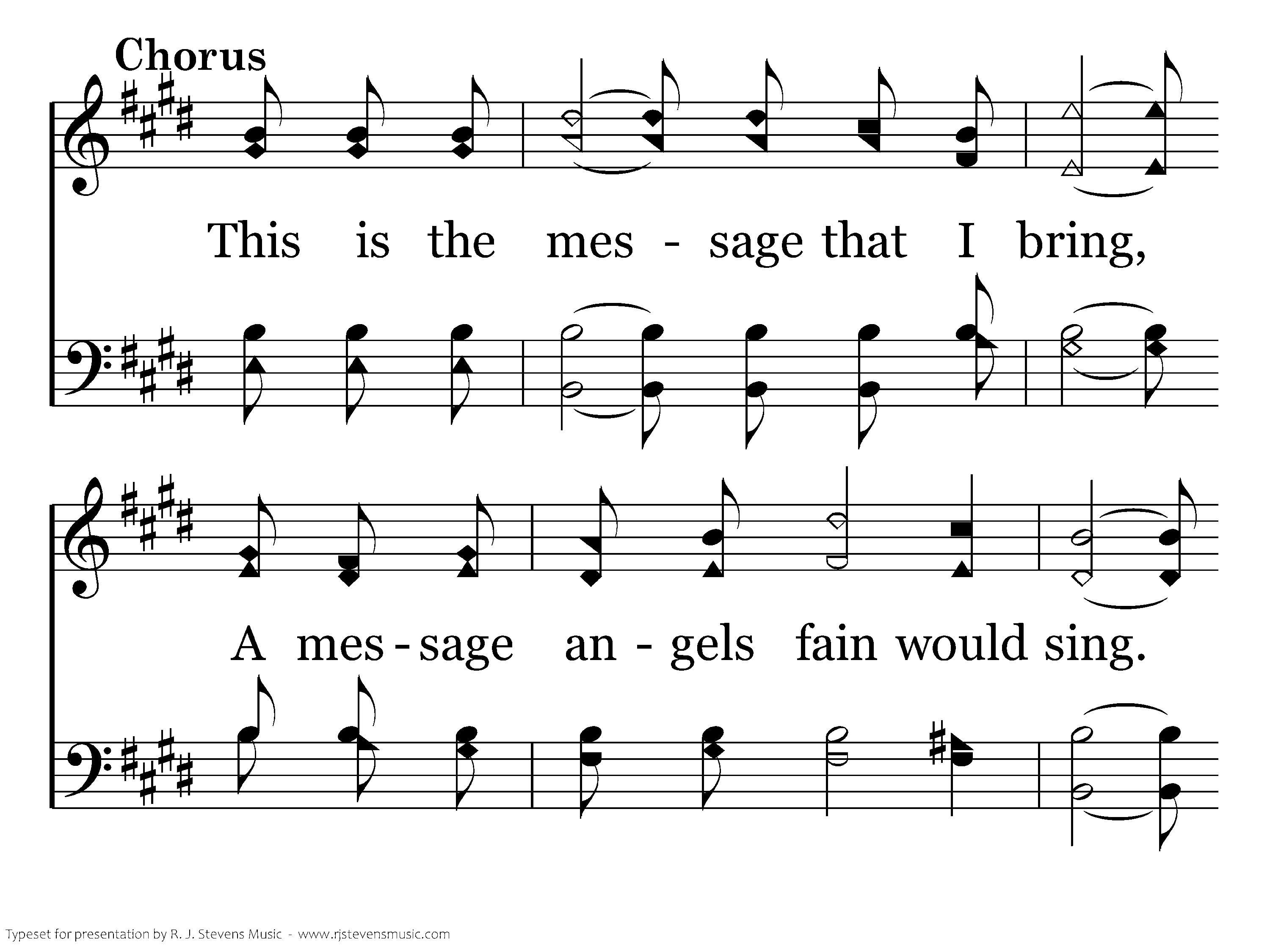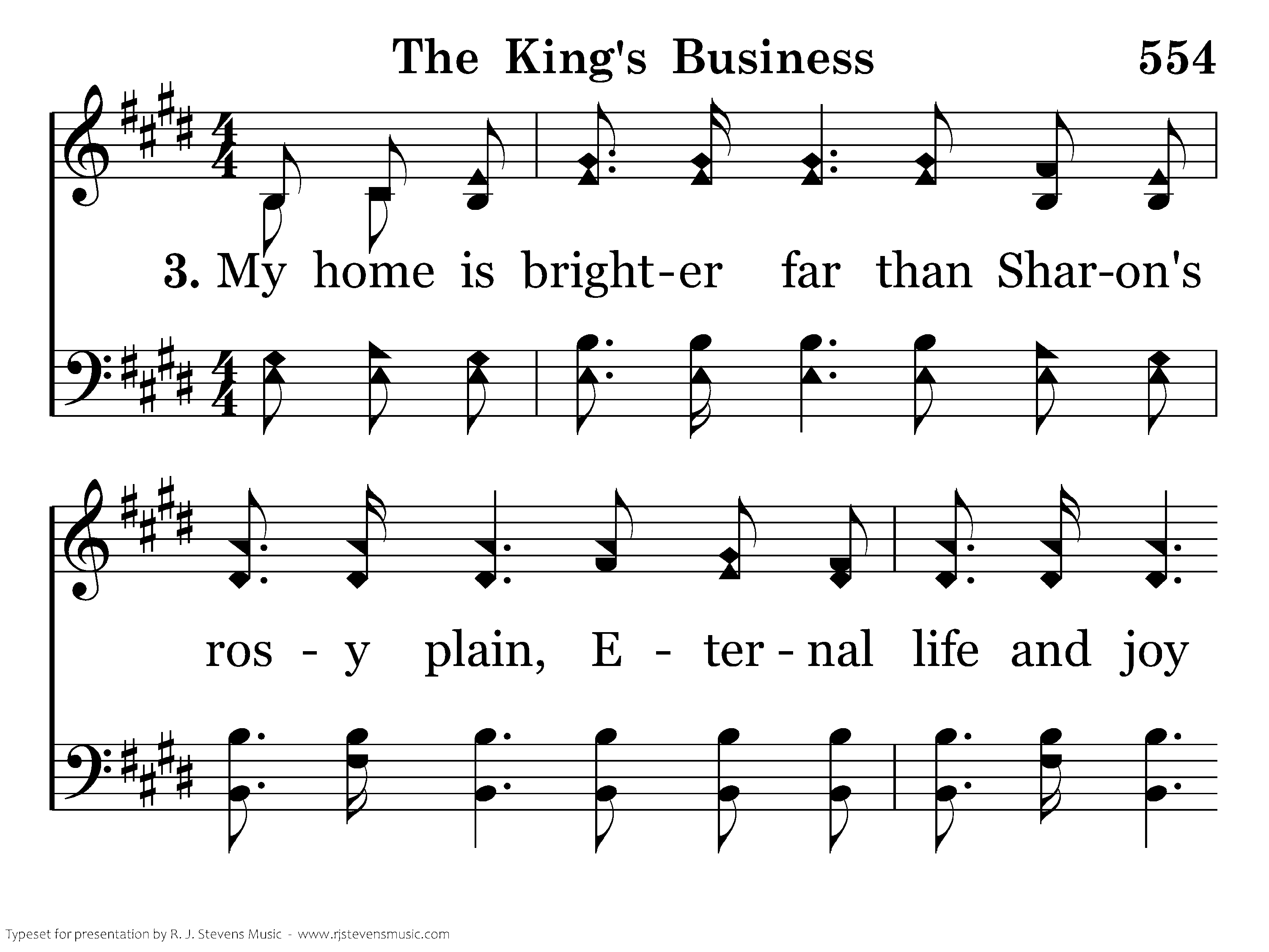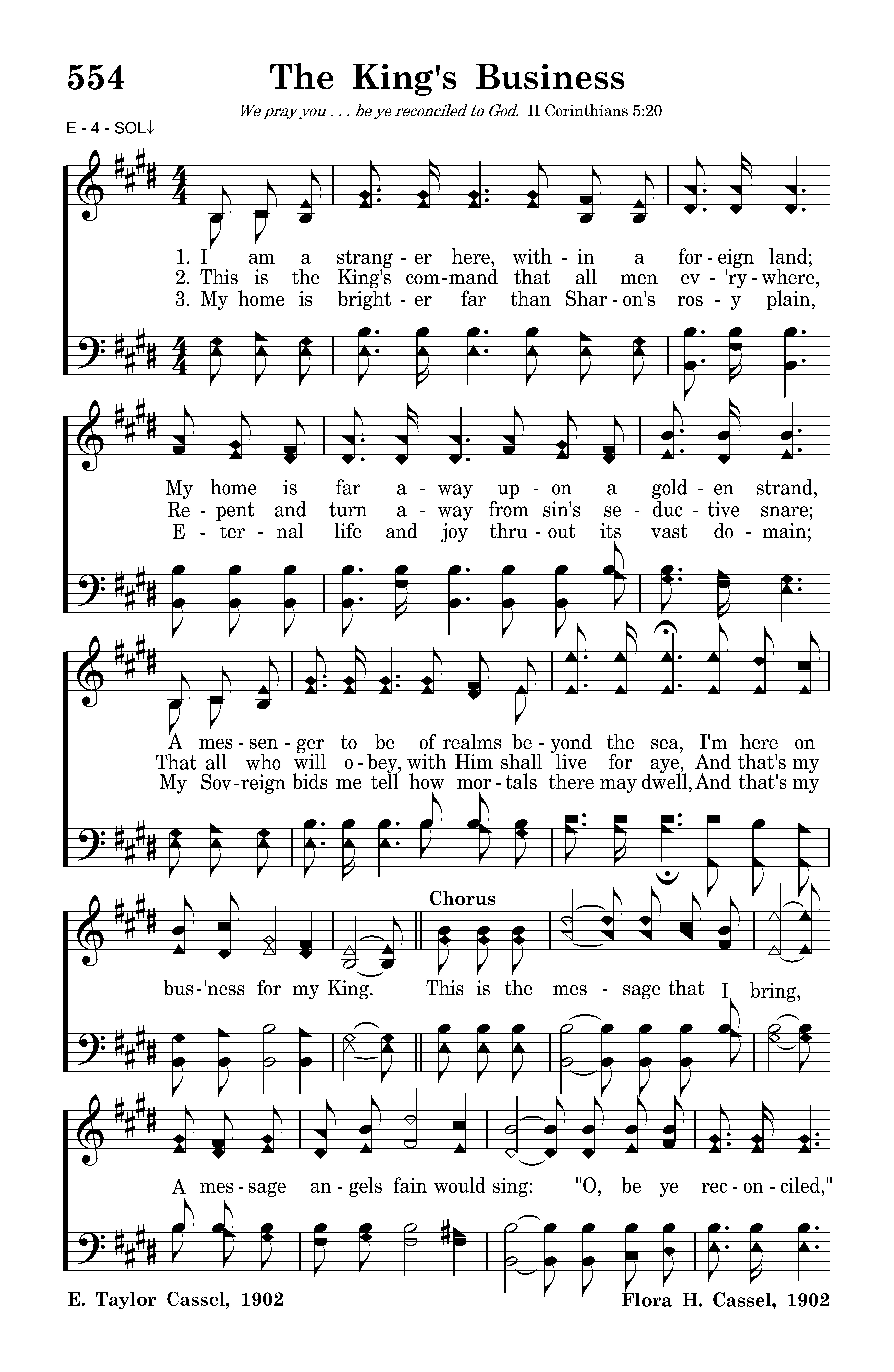 My home is brighter far than Sharon's rosy plain, Eternal life and joy thru'out its vast domain; My Sovreign bids me tell how mortals there may dwell, And that's my bus'ness for my King. This is the message that I bring, A message angels fain would sing: "O, be ye reconciled," Thus saith my Lord and King, "O, be ye reconciled to God." Amen.