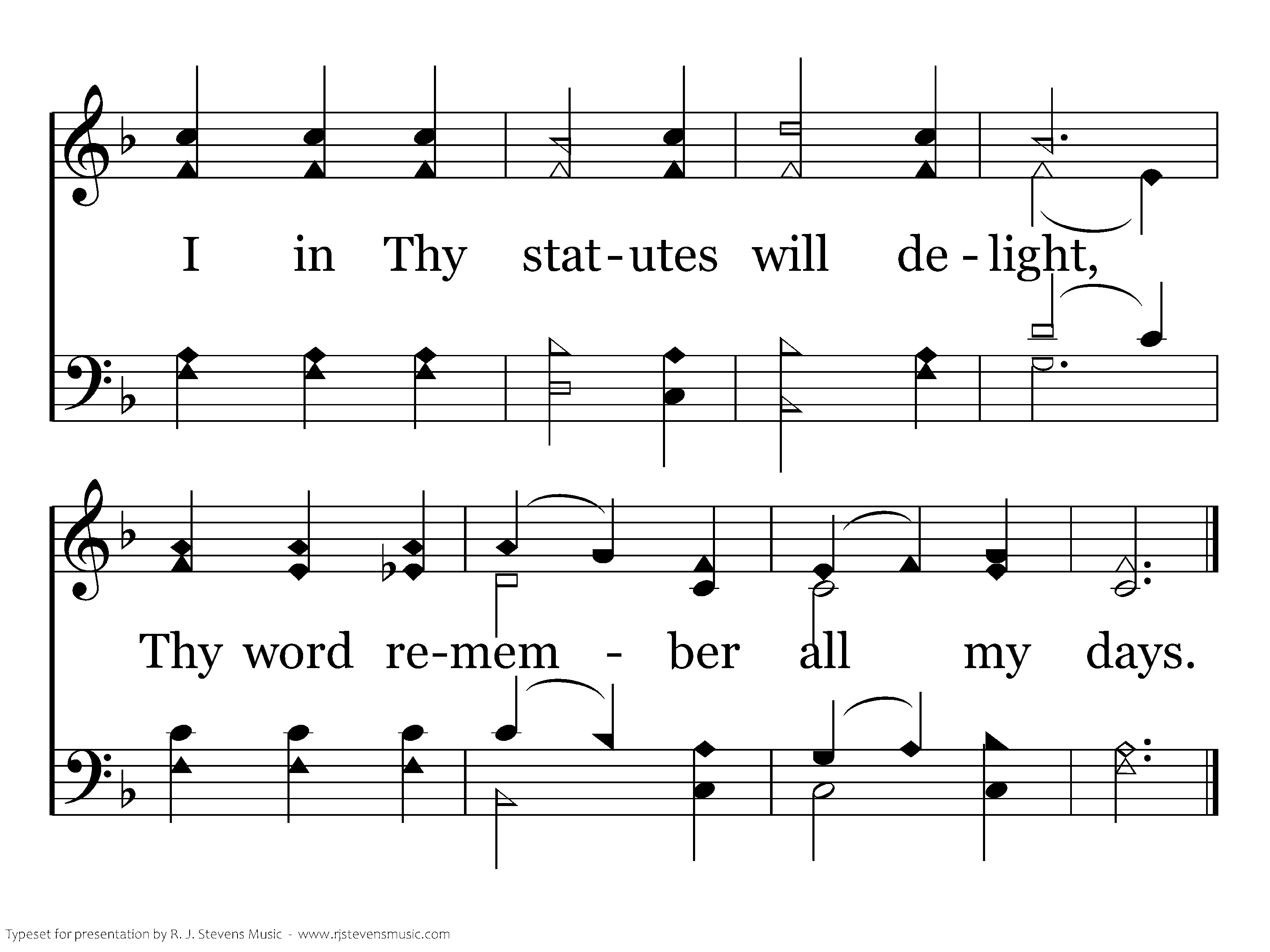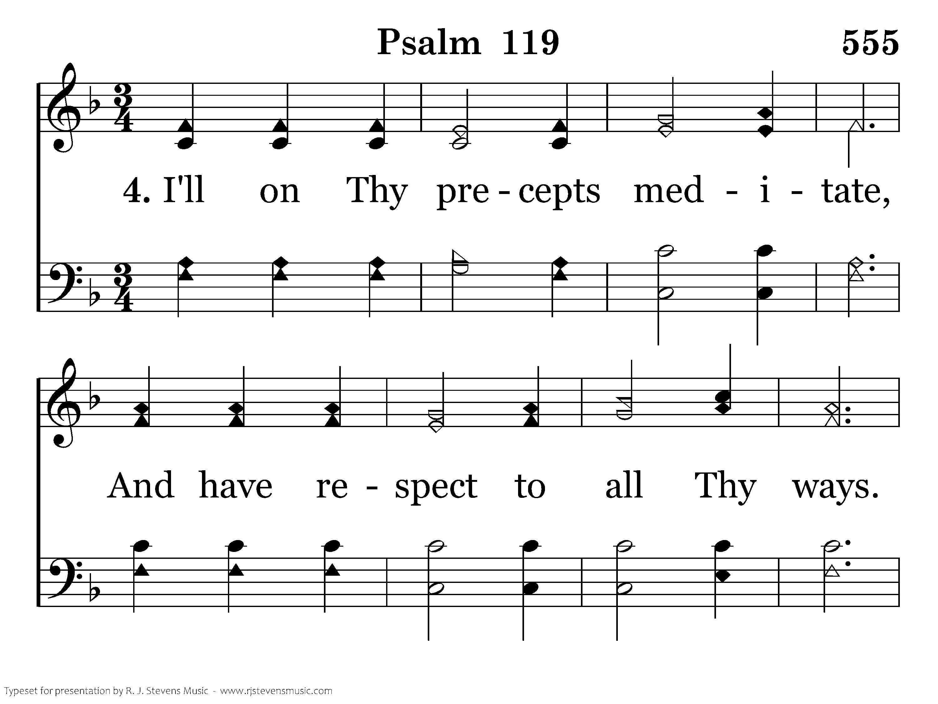 I'll on Thy precepts meditate, And have respect to all Thy ways. I in Thy statutes will delight, Thy word remember all my days.