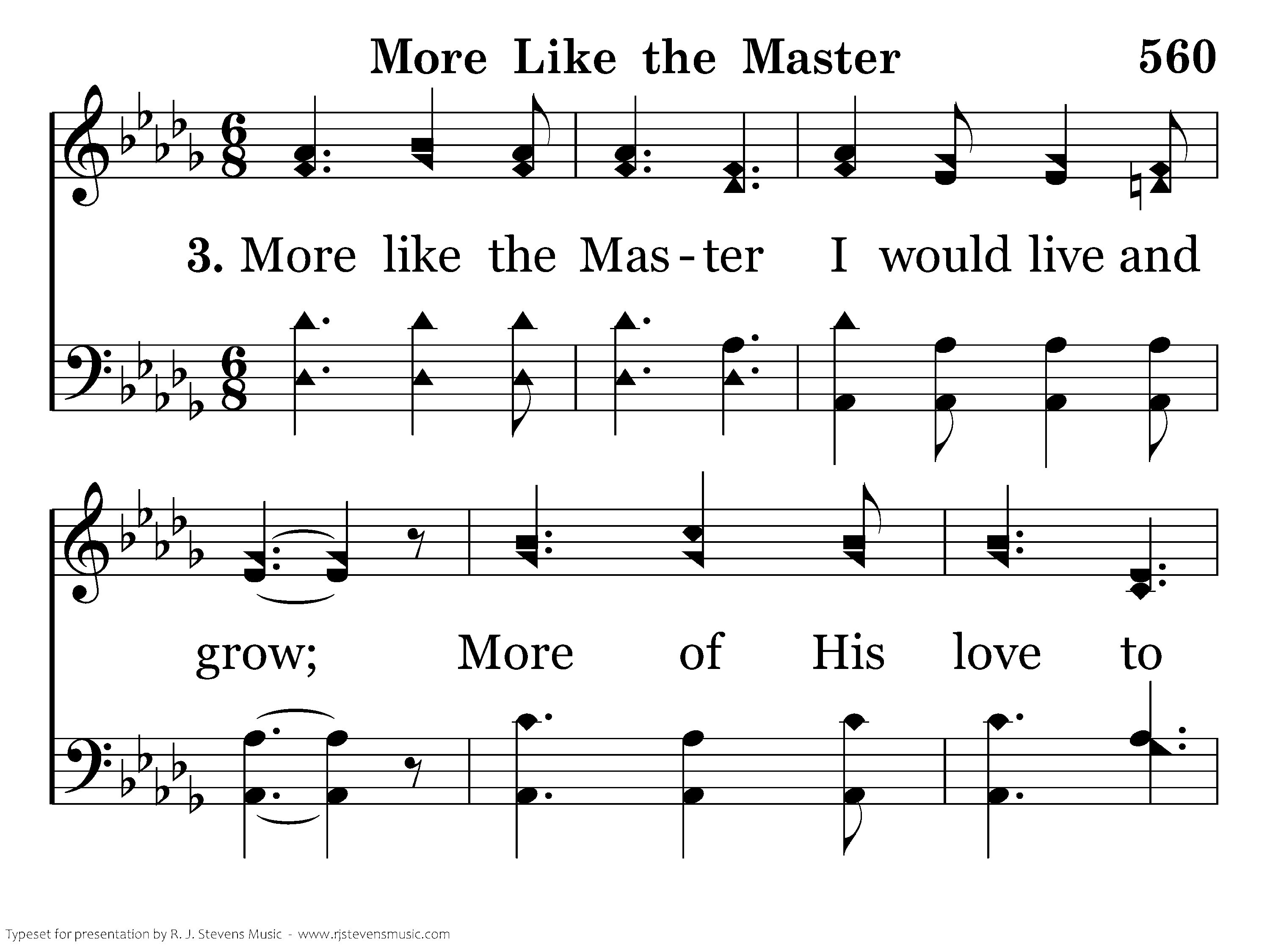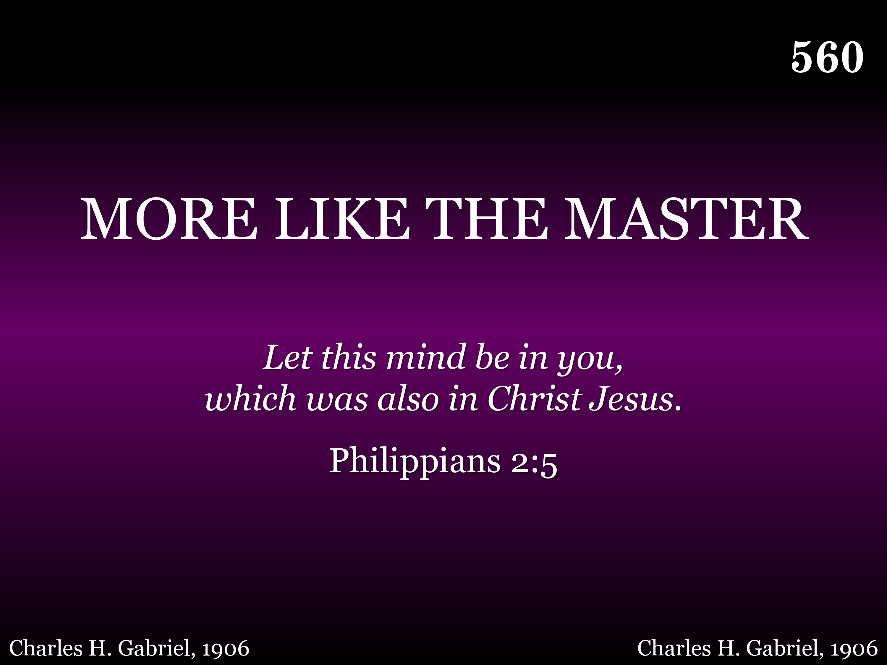More like the Master I would live and grow; More of His love to others I would show; More selfdenial, like His in Galilee, More like the Master I long to ever be.