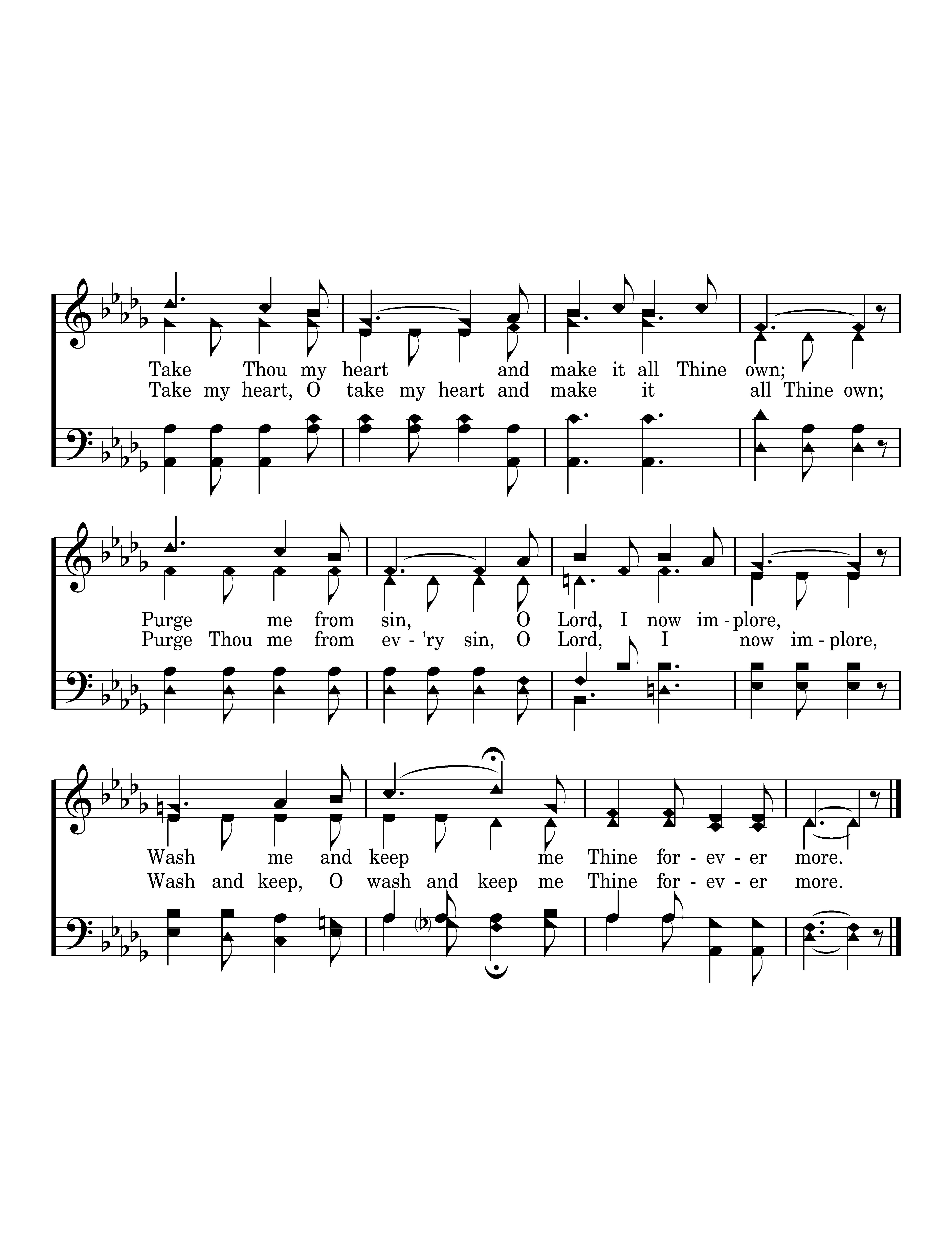 Take Thou my heart, I would be Thine alone, Take Thou my heart and make it all Thine own; Purge me from sin, O Lord, I now implore, Wash me and keep me Thine forever more.