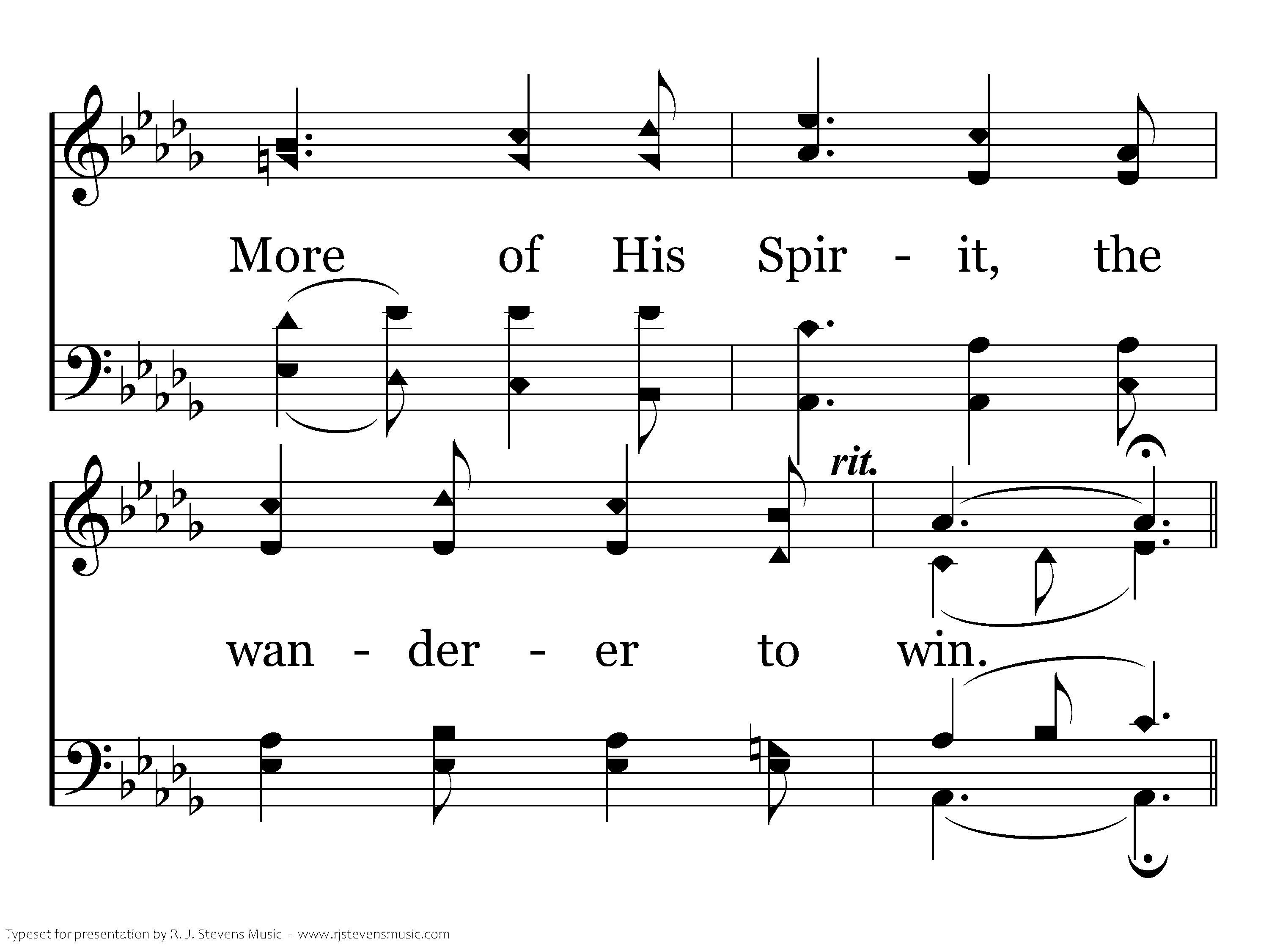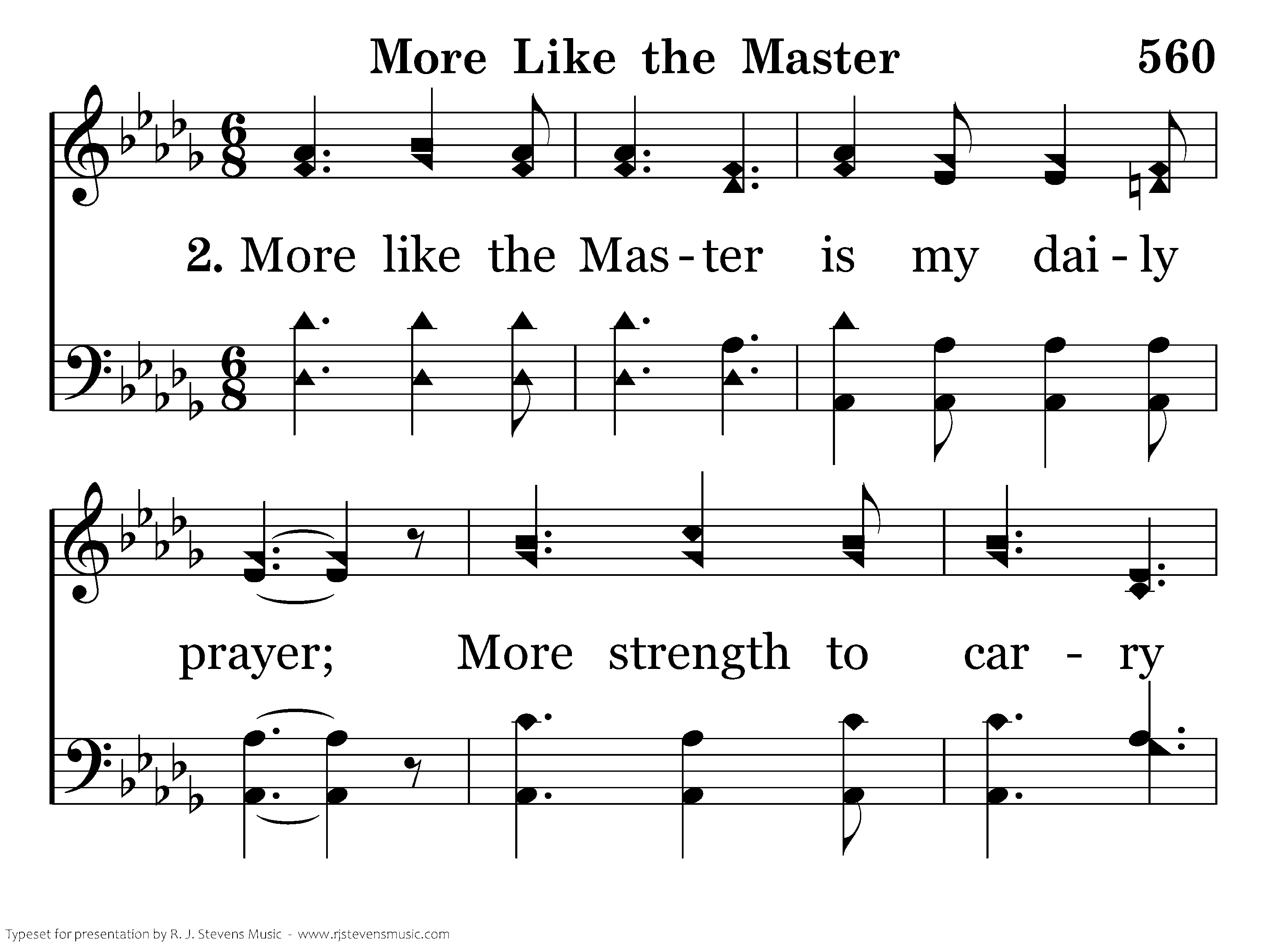 More like the Master is my daily prayer; More strength to carry crosses I must bear; More earnest effort His kingdom to increase, More of His Spirit, the wanderer to win.