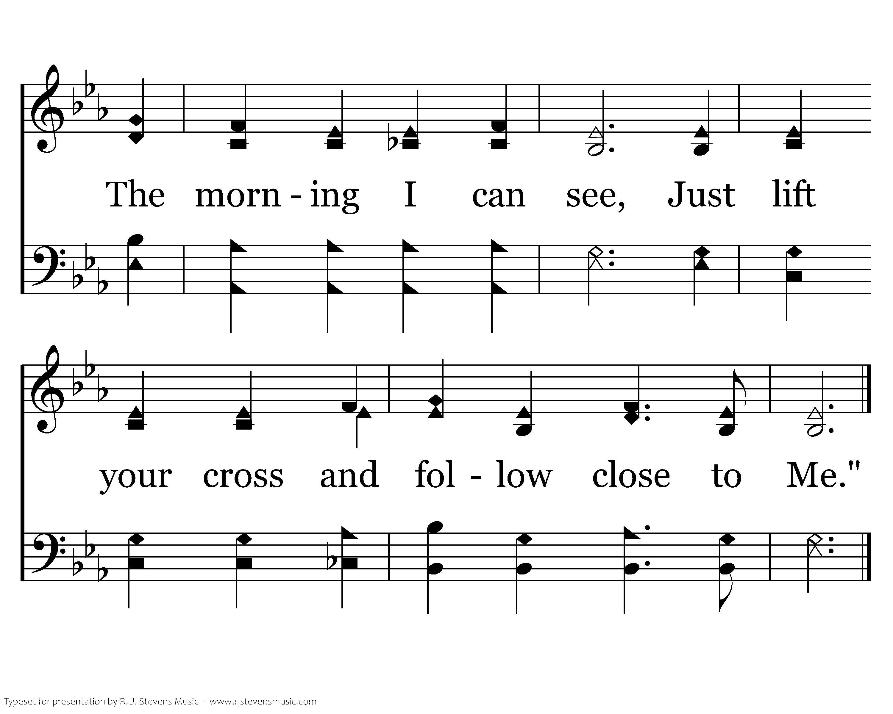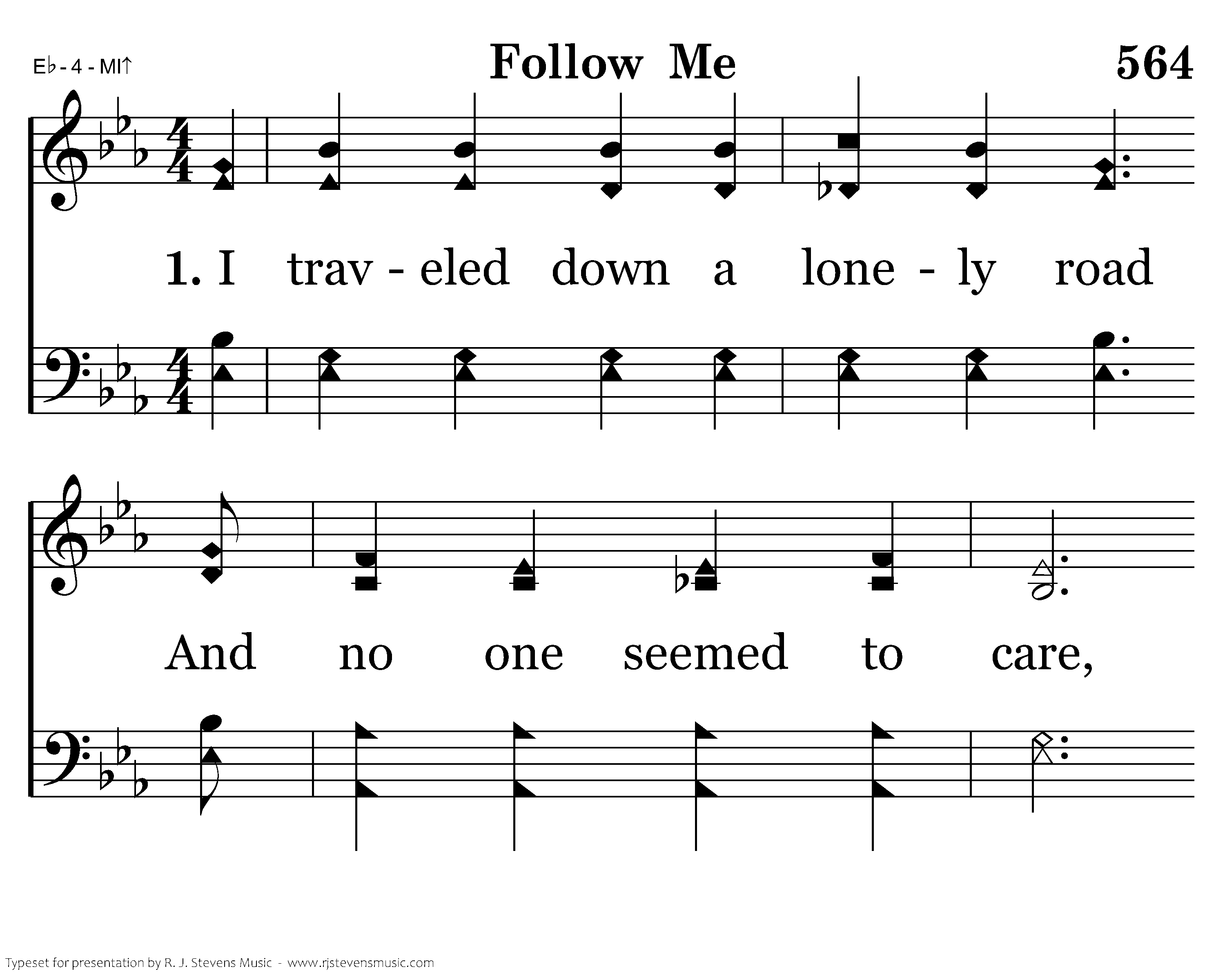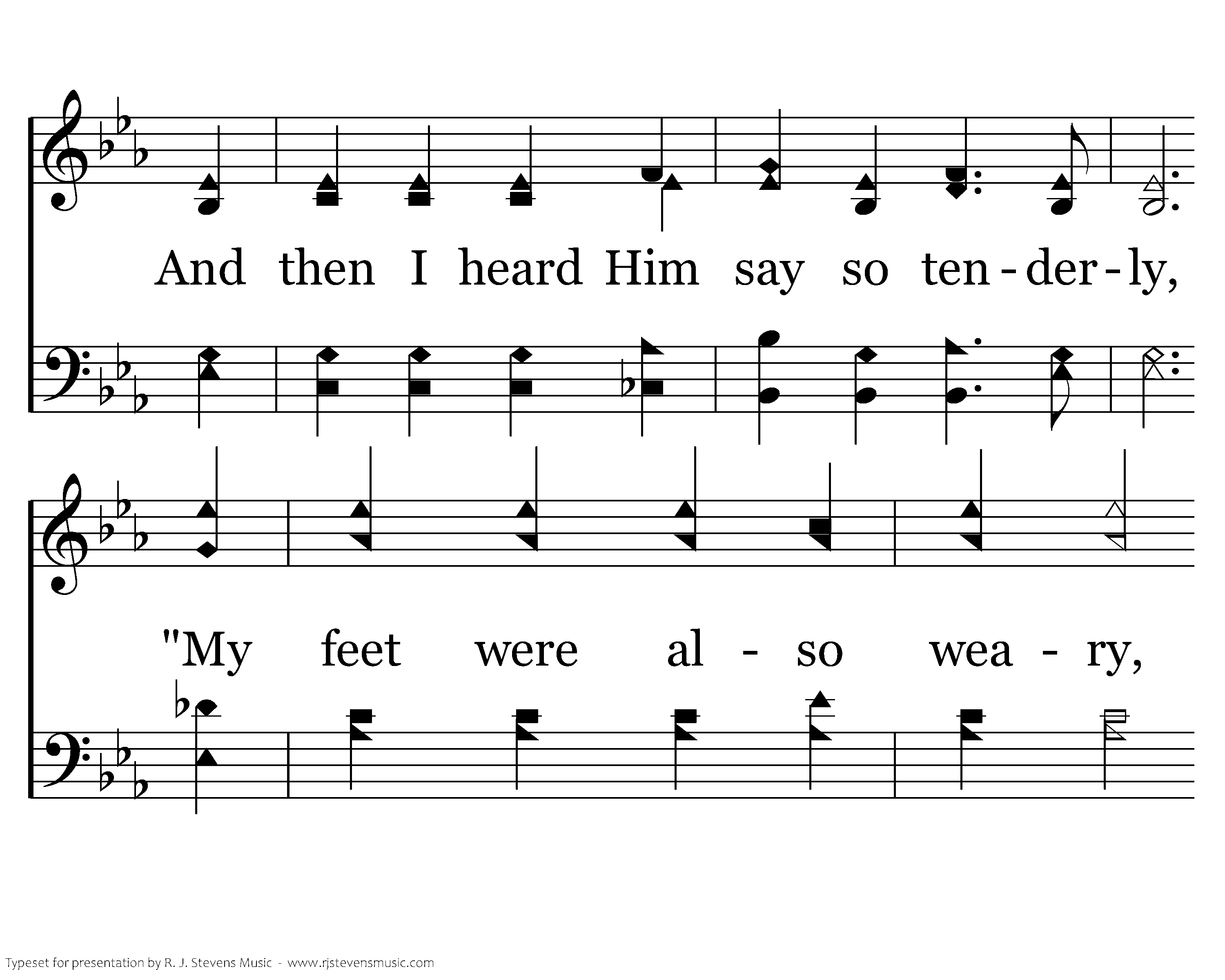 I traveled down a lonely road And no one seemed to care, The burden on my weary back Had bowed me to despair; I oft complained to Jesus How folks were treating me, And then I heard Him say so tenderly: "My feet were also weary, Upon the Calv'ry road; The cross became so heavy I fell beneath the load; Be faithful weary pilgrim, The morning I can see, Just lift your cross and follow close to Me."
