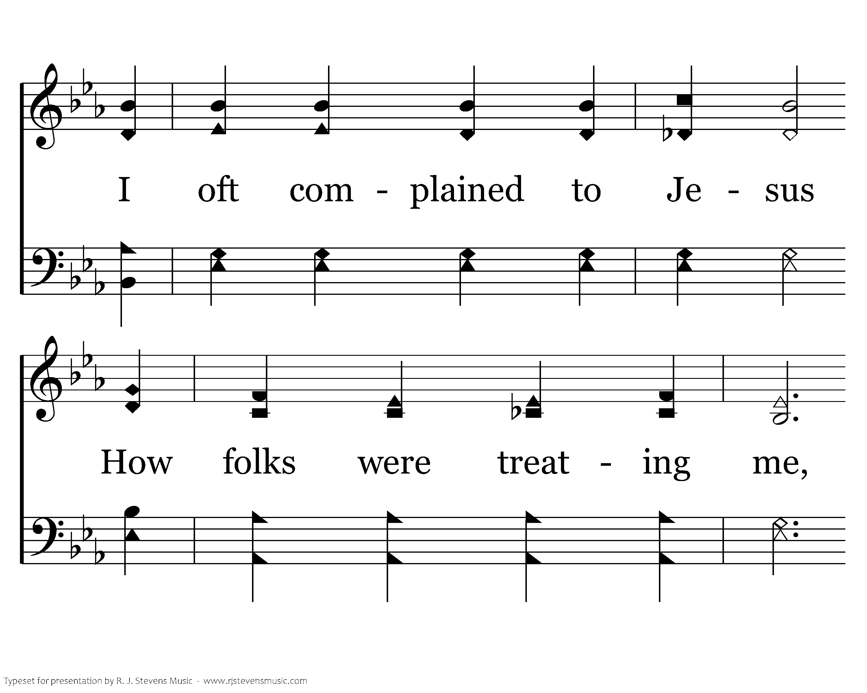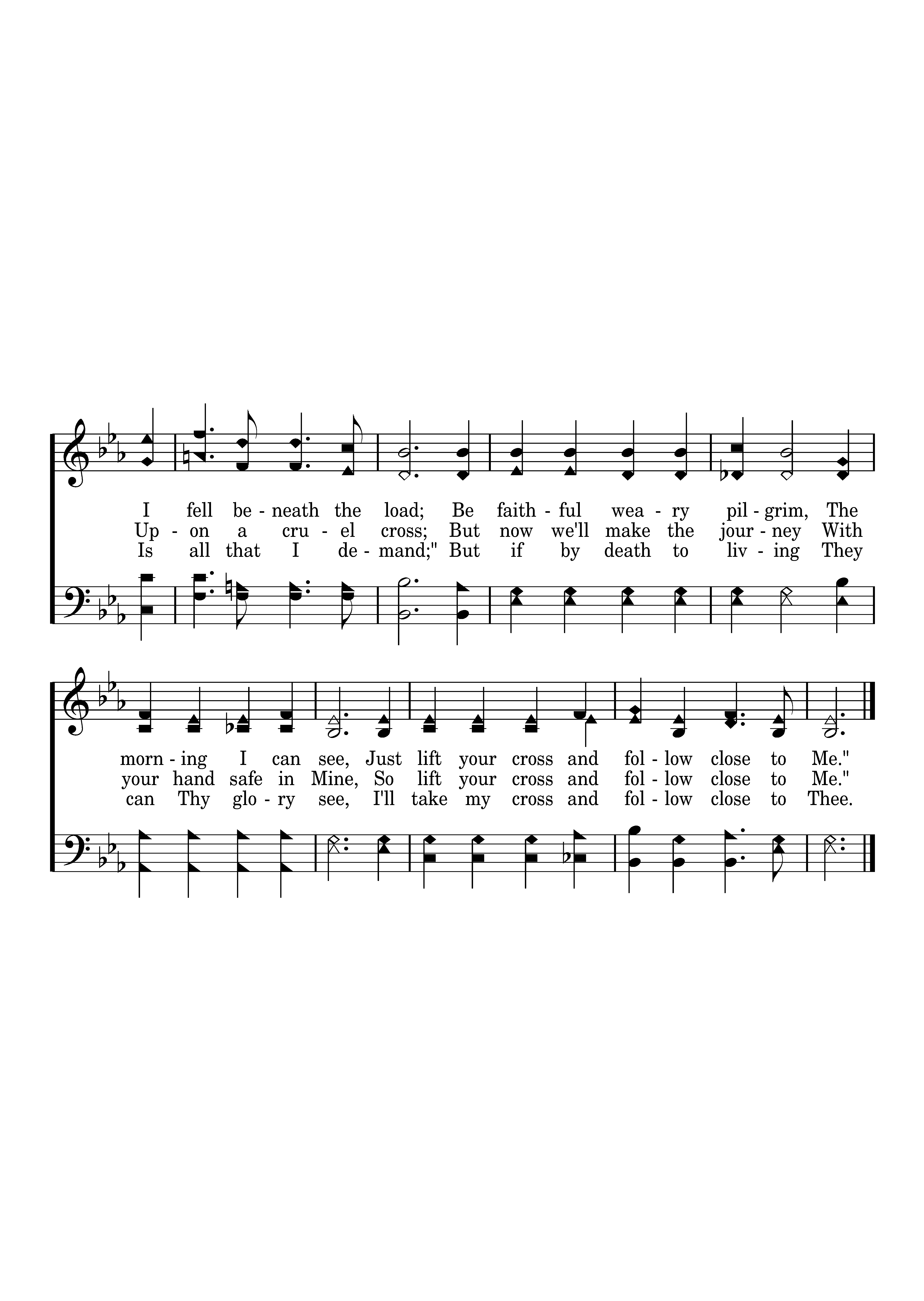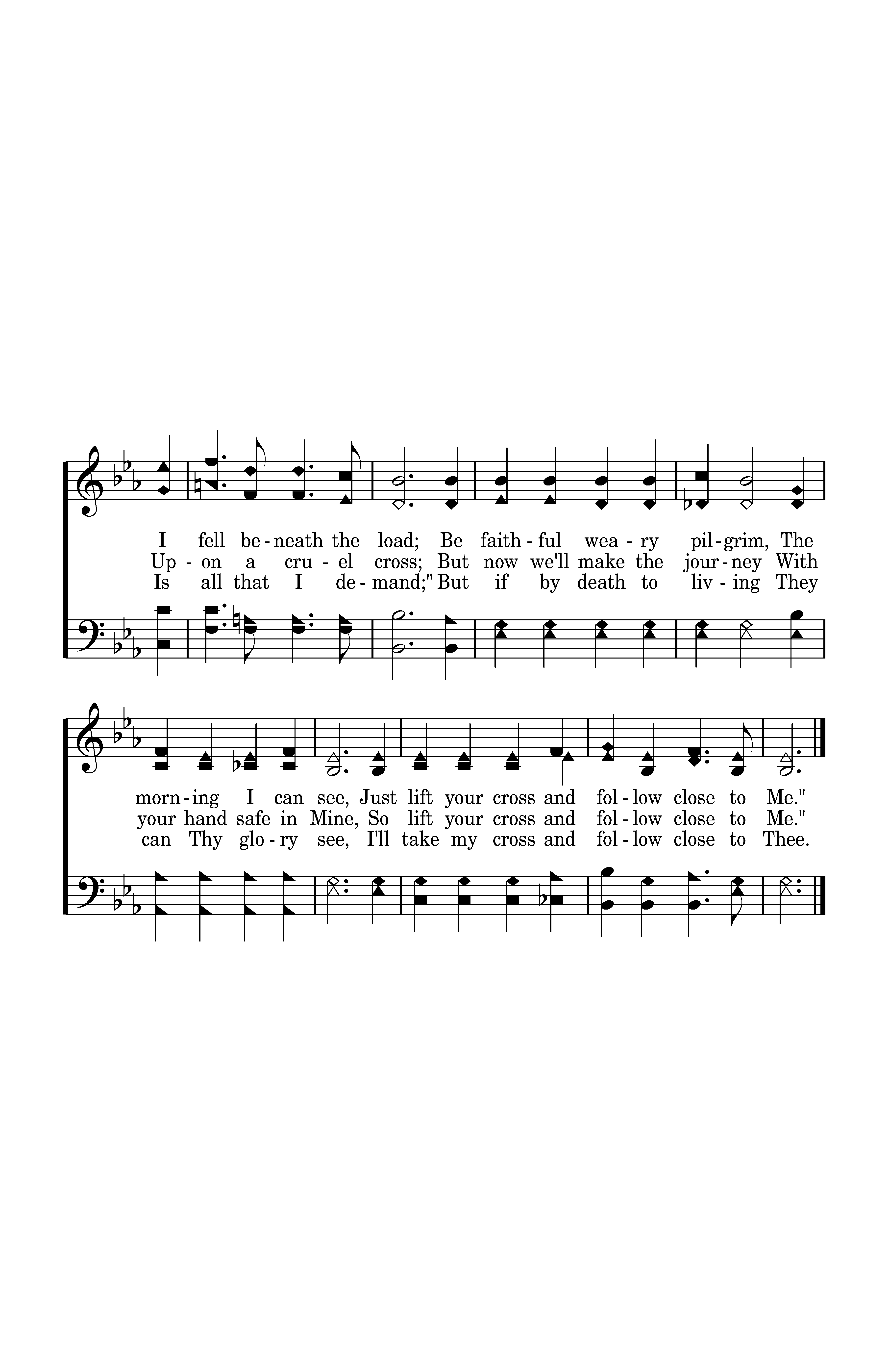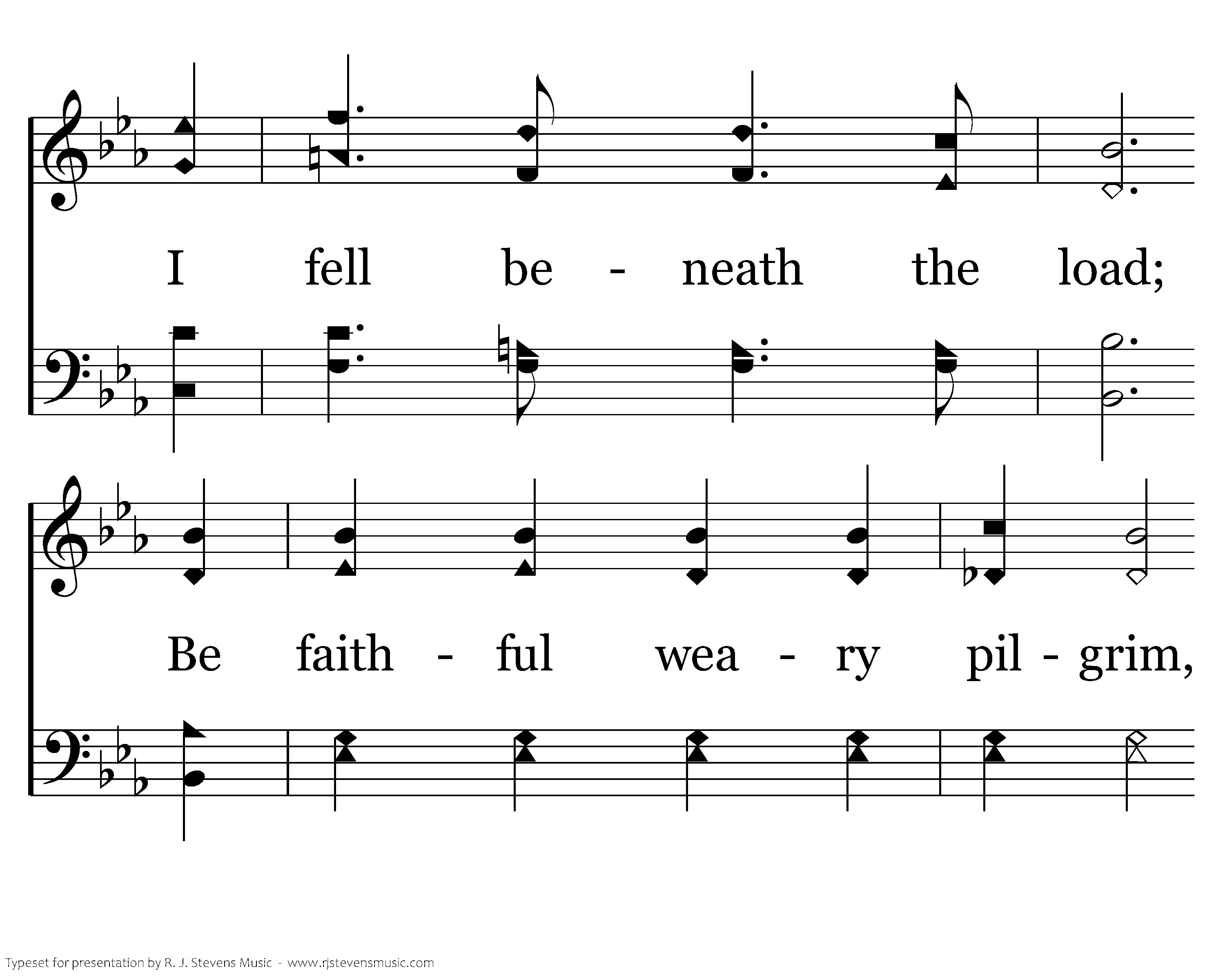 I traveled down a lonely road And no one seemed to care, The burden on my weary back Had bowed me to despair; I oft complained to Jesus How folks were treating me, And then I heard Him say so tenderly: "My feet were also weary, Upon the Calv'ry road; The cross became so heavy I fell beneath the load; Be faithful weary pilgrim, The morning I can see, Just lift your cross and follow close to Me."