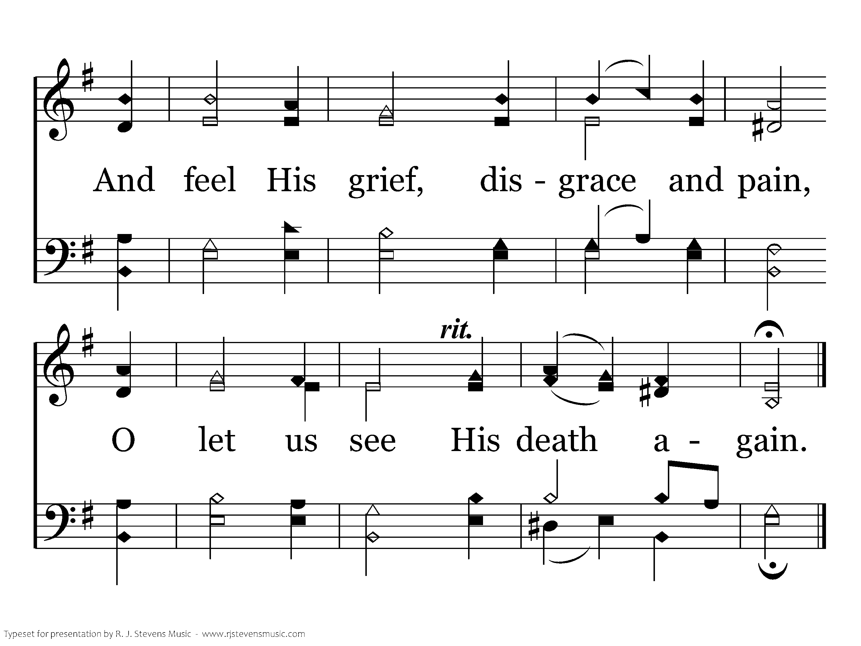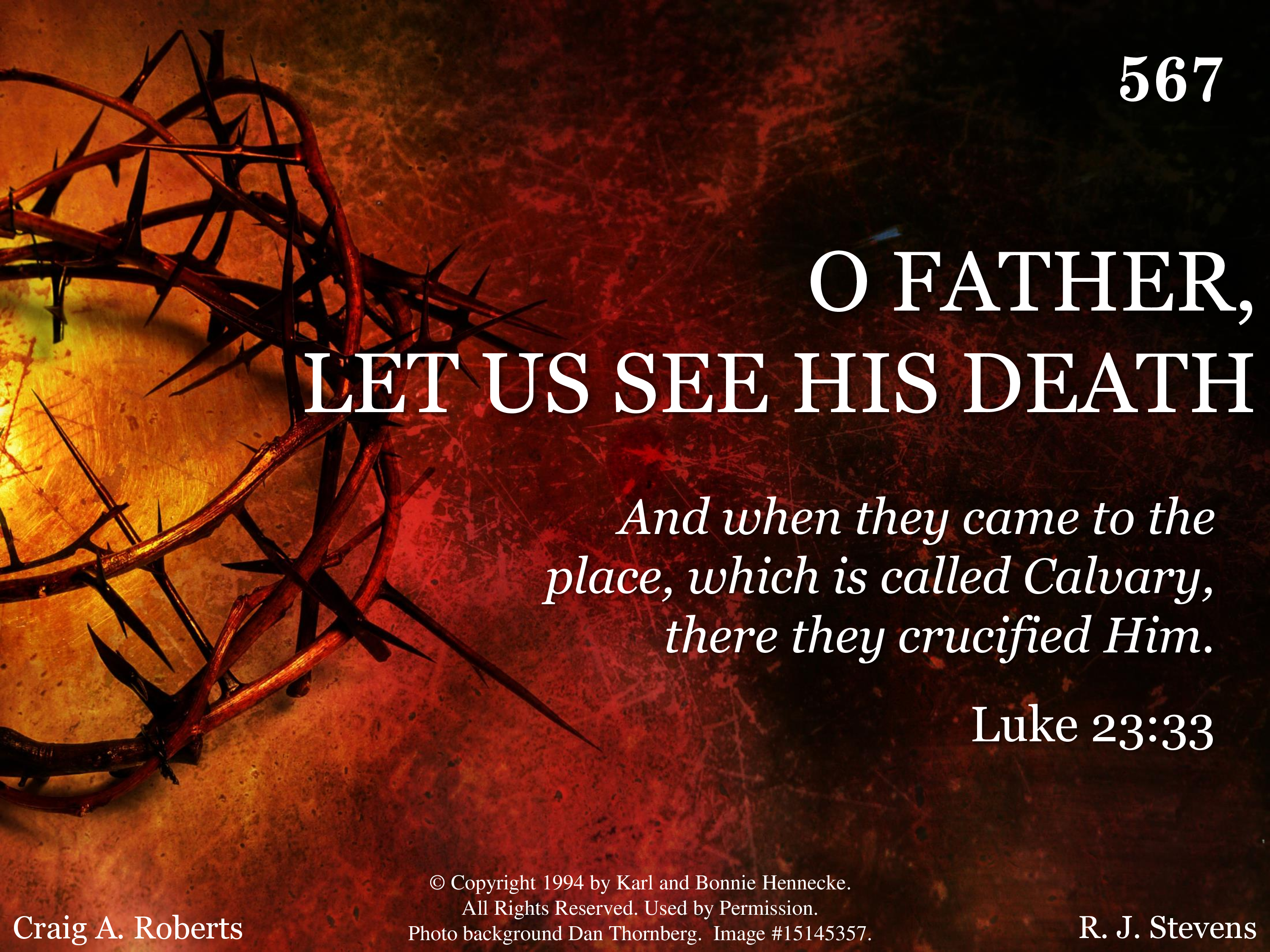 O Father, let us see His death, And hear "forgive them" on His breath, And feel His grief, disgrace and pain, O let us see His death again.