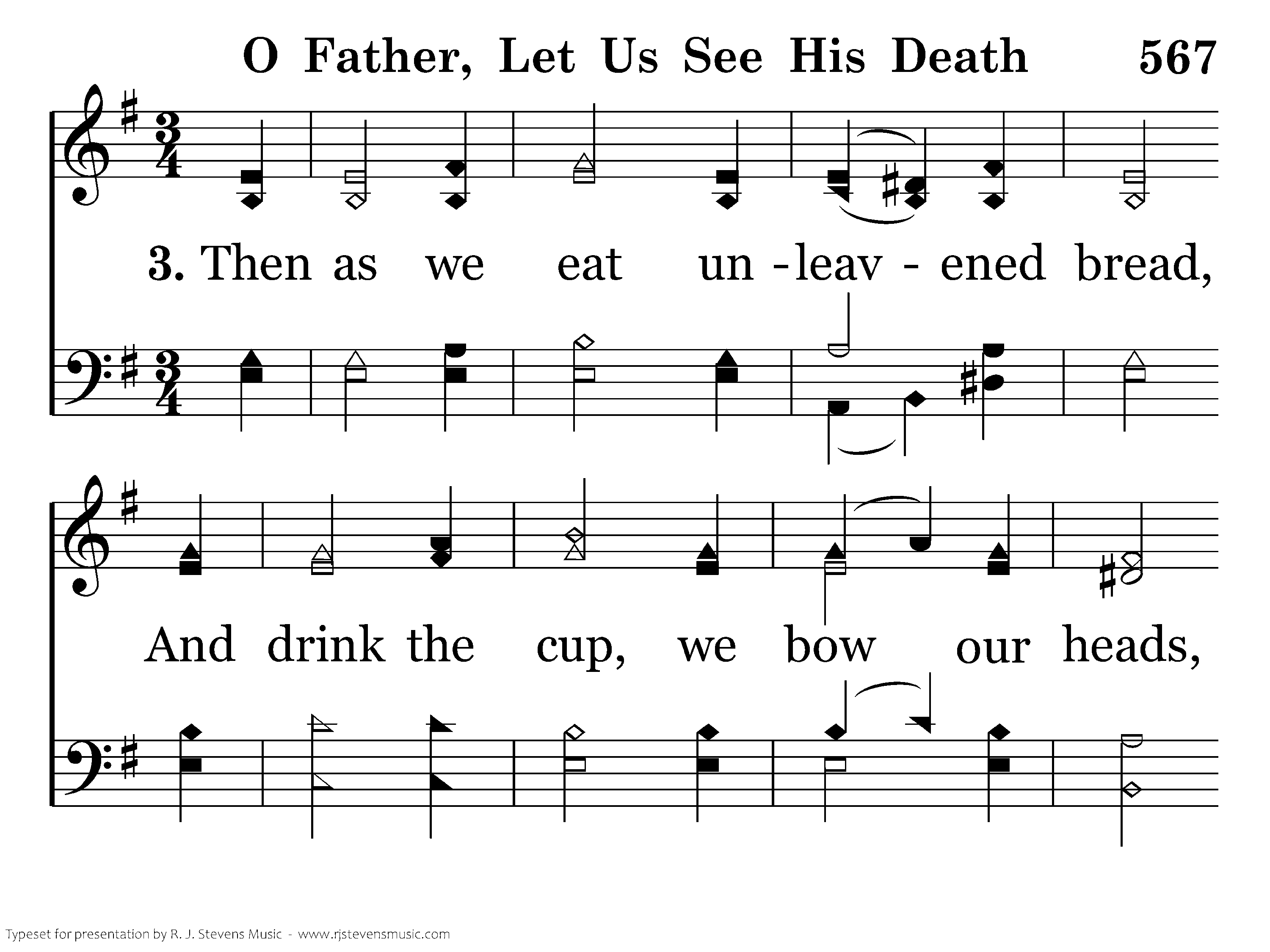 Then as we eat unleavened bread, And drink the cup, we bow our heads, And see the suff'ring death of Christ, His blood! His body! Sacrificed!