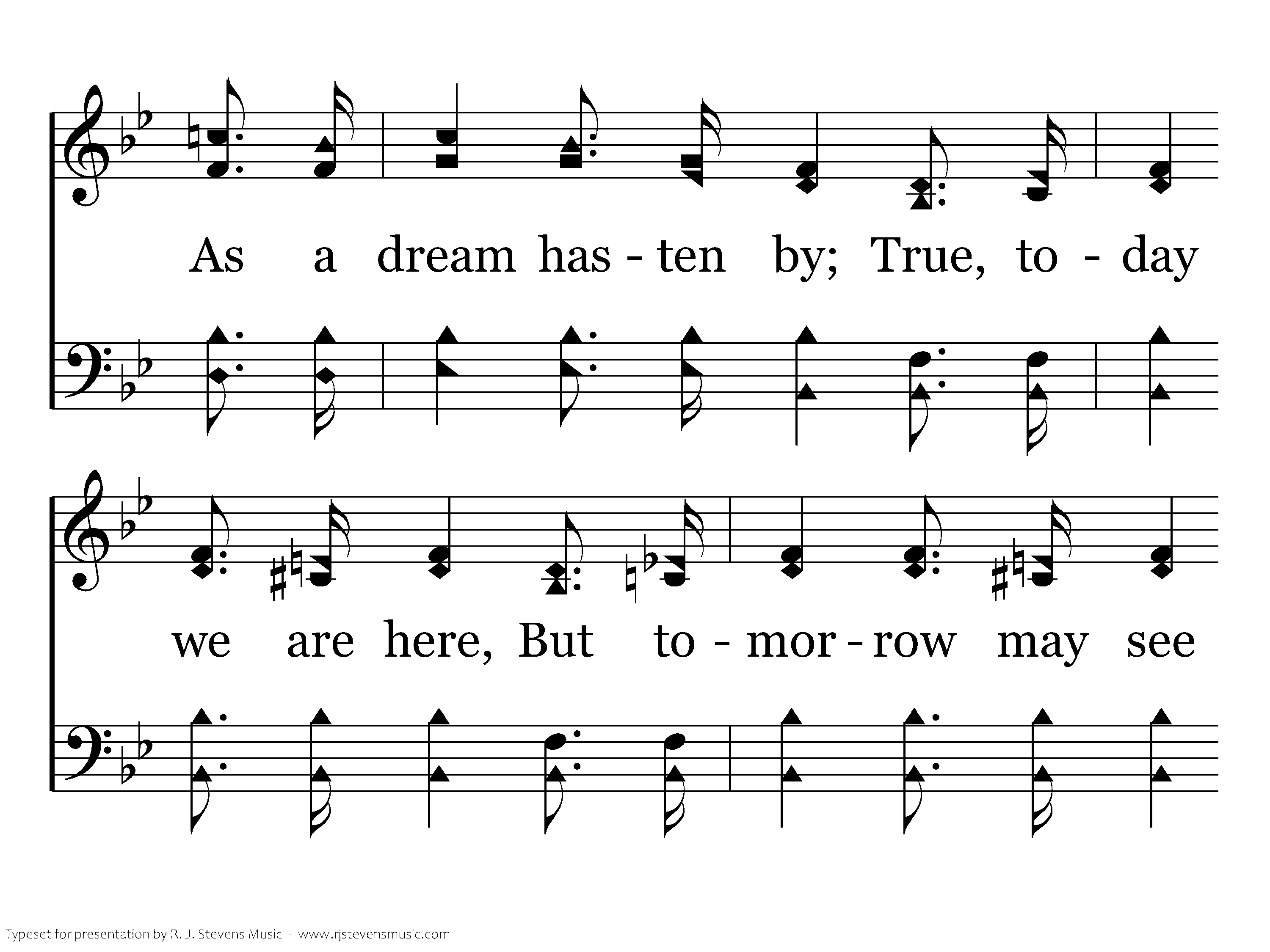 As the life of a flow'r, As a breath or a sigh, So the years that we live As a dream hasten by; True, today we are here, But tomorrow may see Just a grave in the vale, And a mem'ry of me.