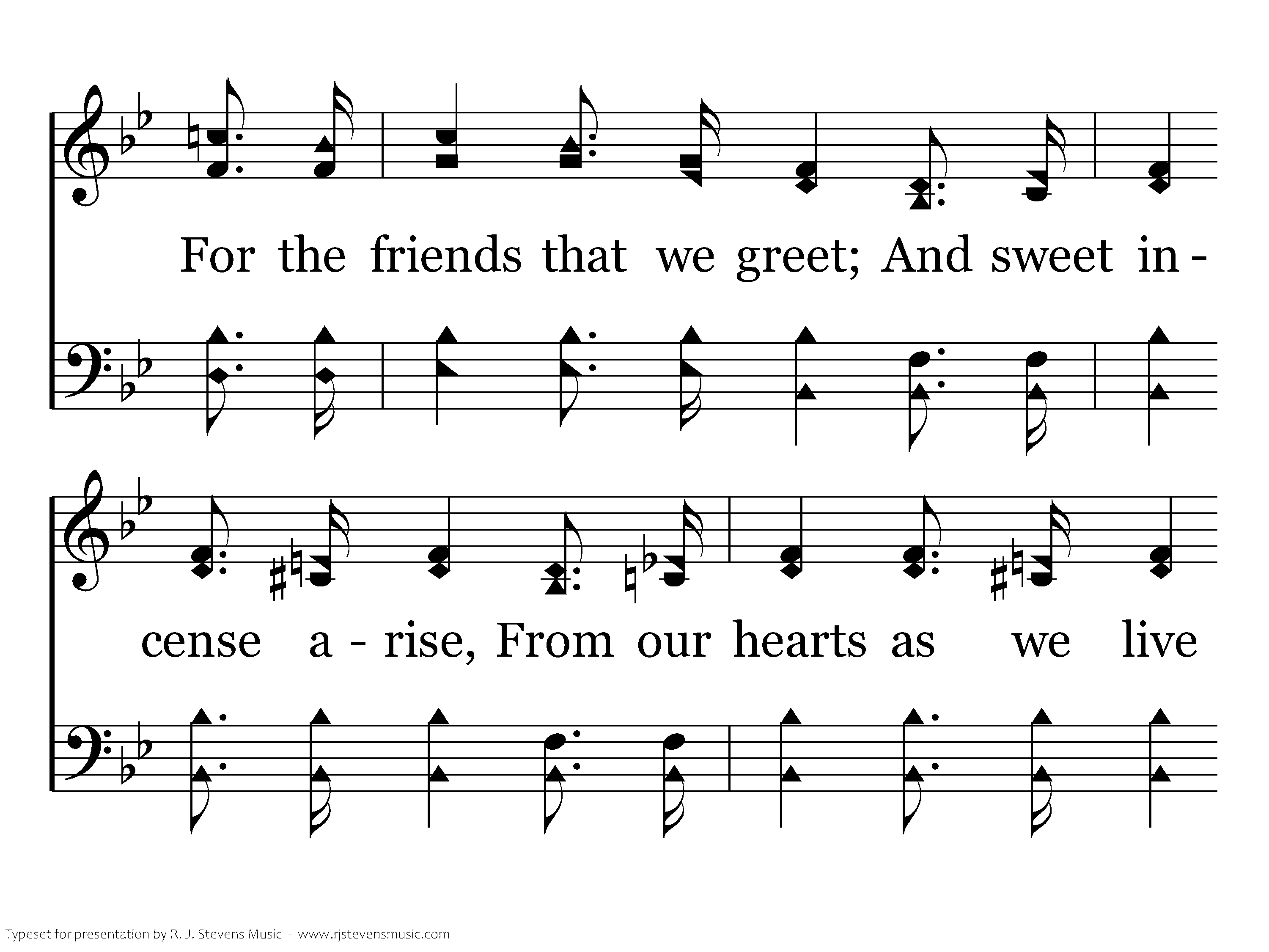 As the life of a flow'r, Be our lives pure and sweet; May we brighten the way For the friends that we greet; And sweet incense arise, From our hearts as we live Close to Him who doth teach Us to love and forgive.
