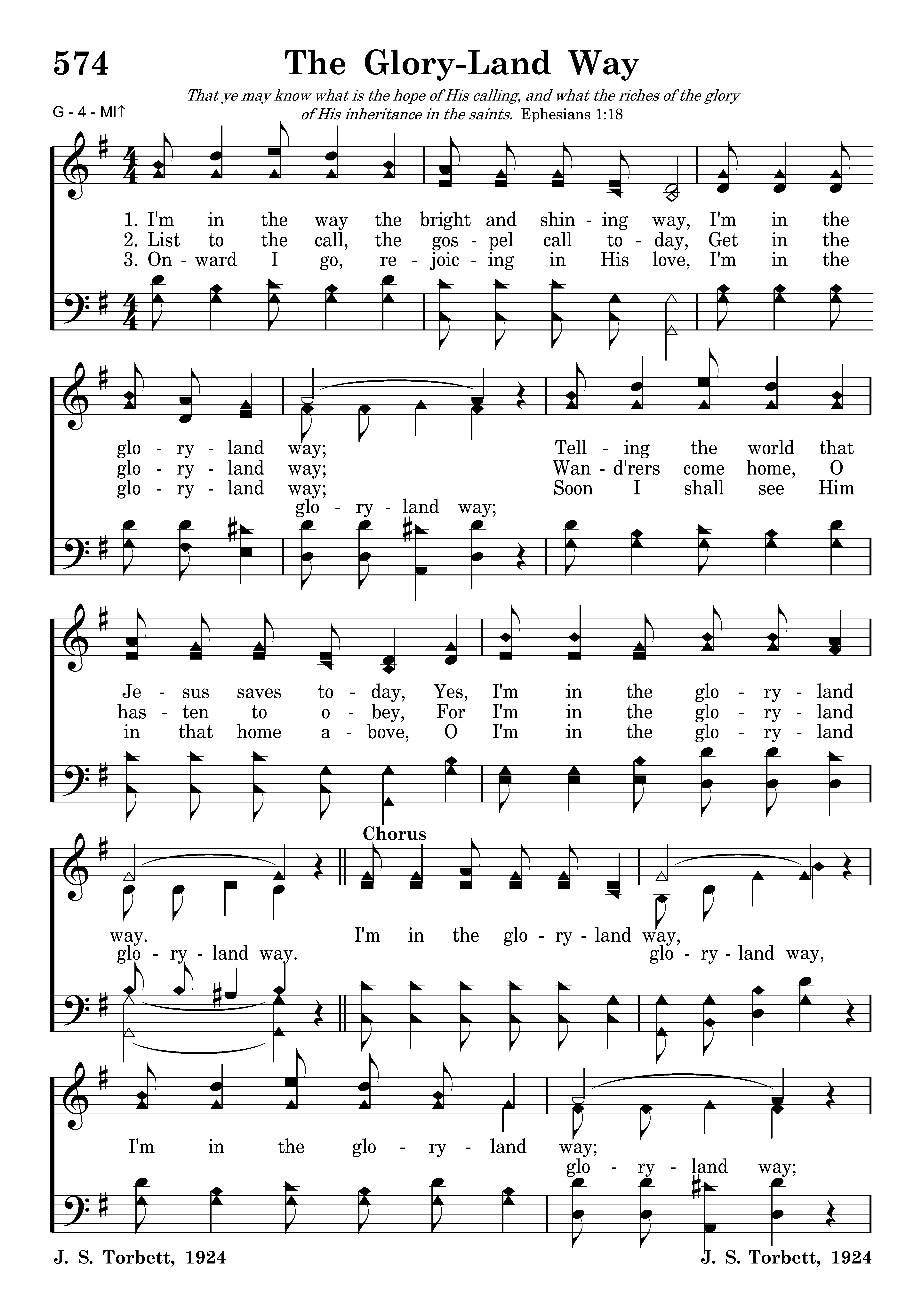 I'm in the way the bright and shining way, I'm in the gloryland way; Telling the world that Jesus saves today, Yes, I'm in the gloryland way.