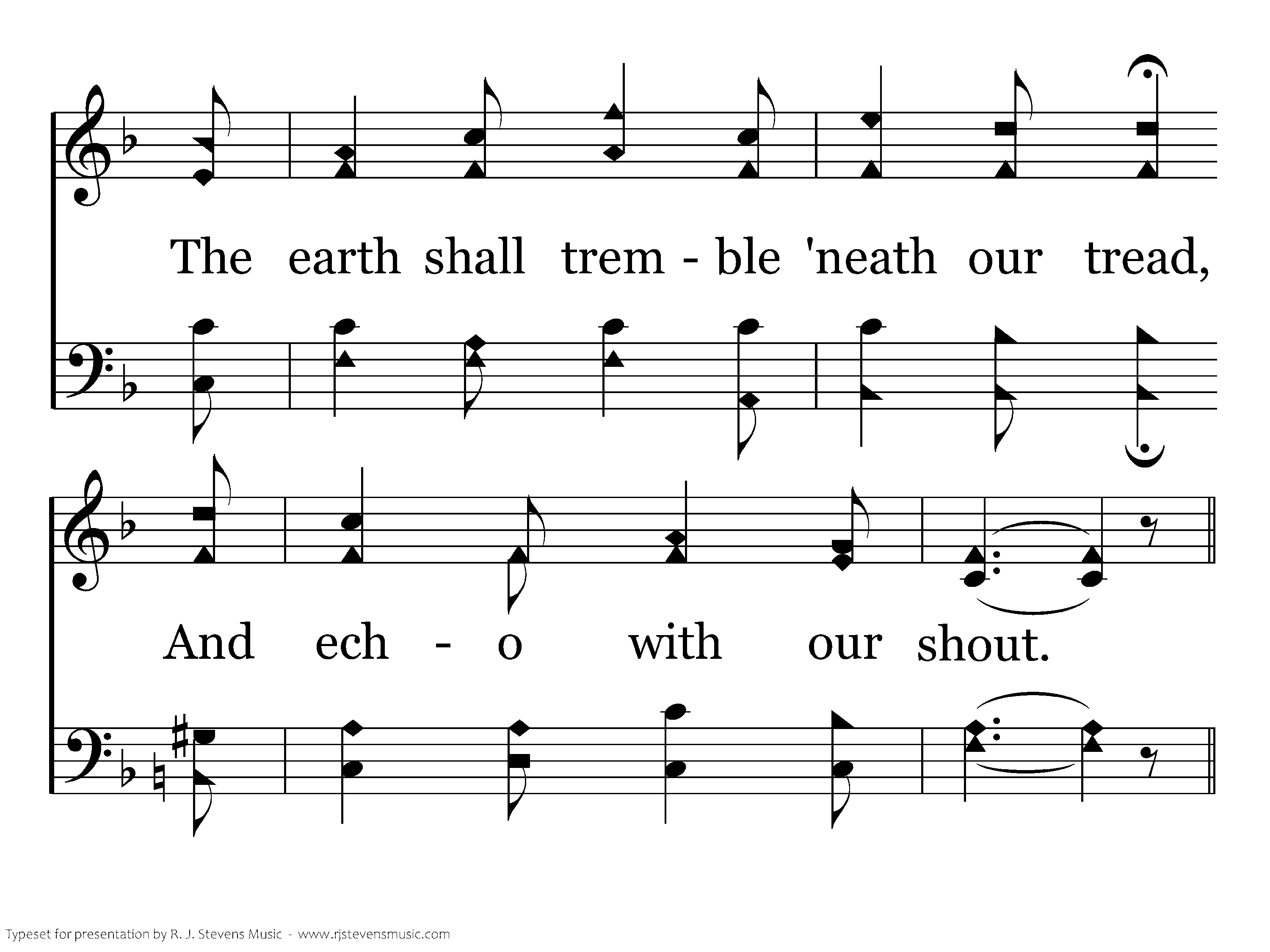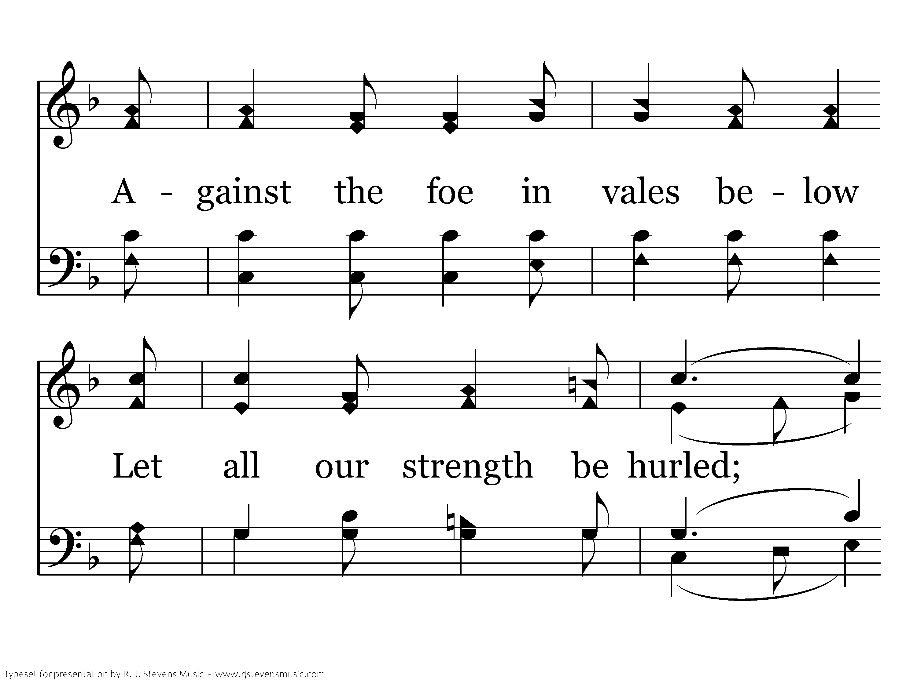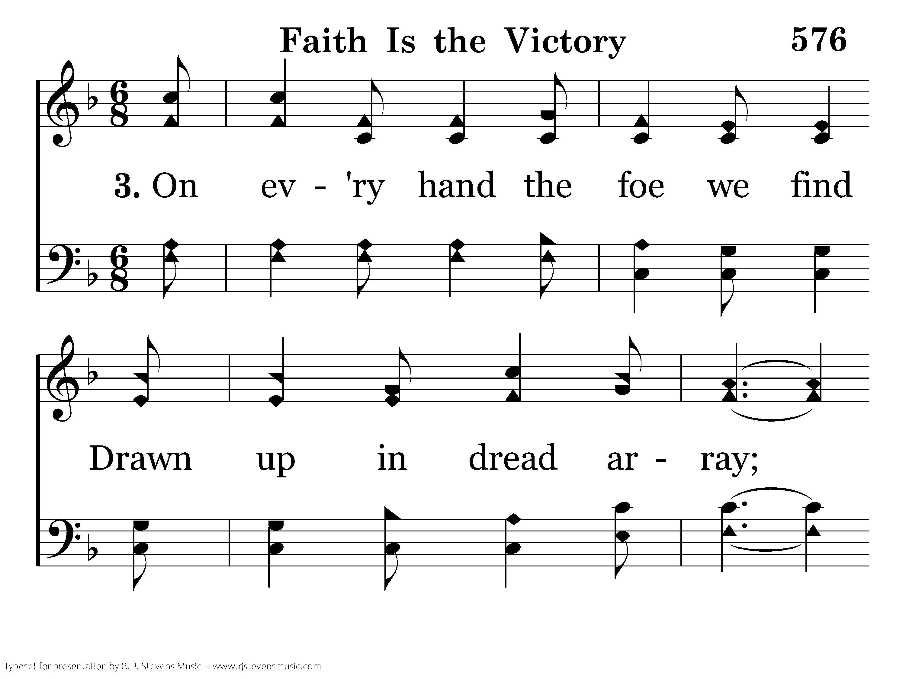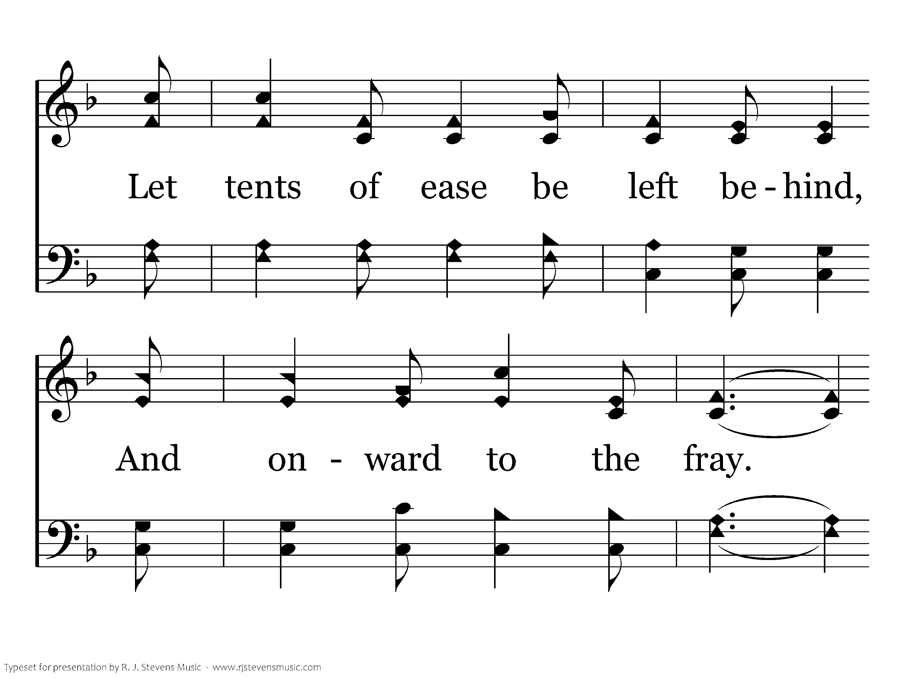 On ev'ry hand the foe we find Drawn up in dread array; Let tents of ease be left behind, And onward to the fray. Salvation's helmet on each head, With truth all girt about, The earth shall tremble 'neath our tread, And echo with our shout.