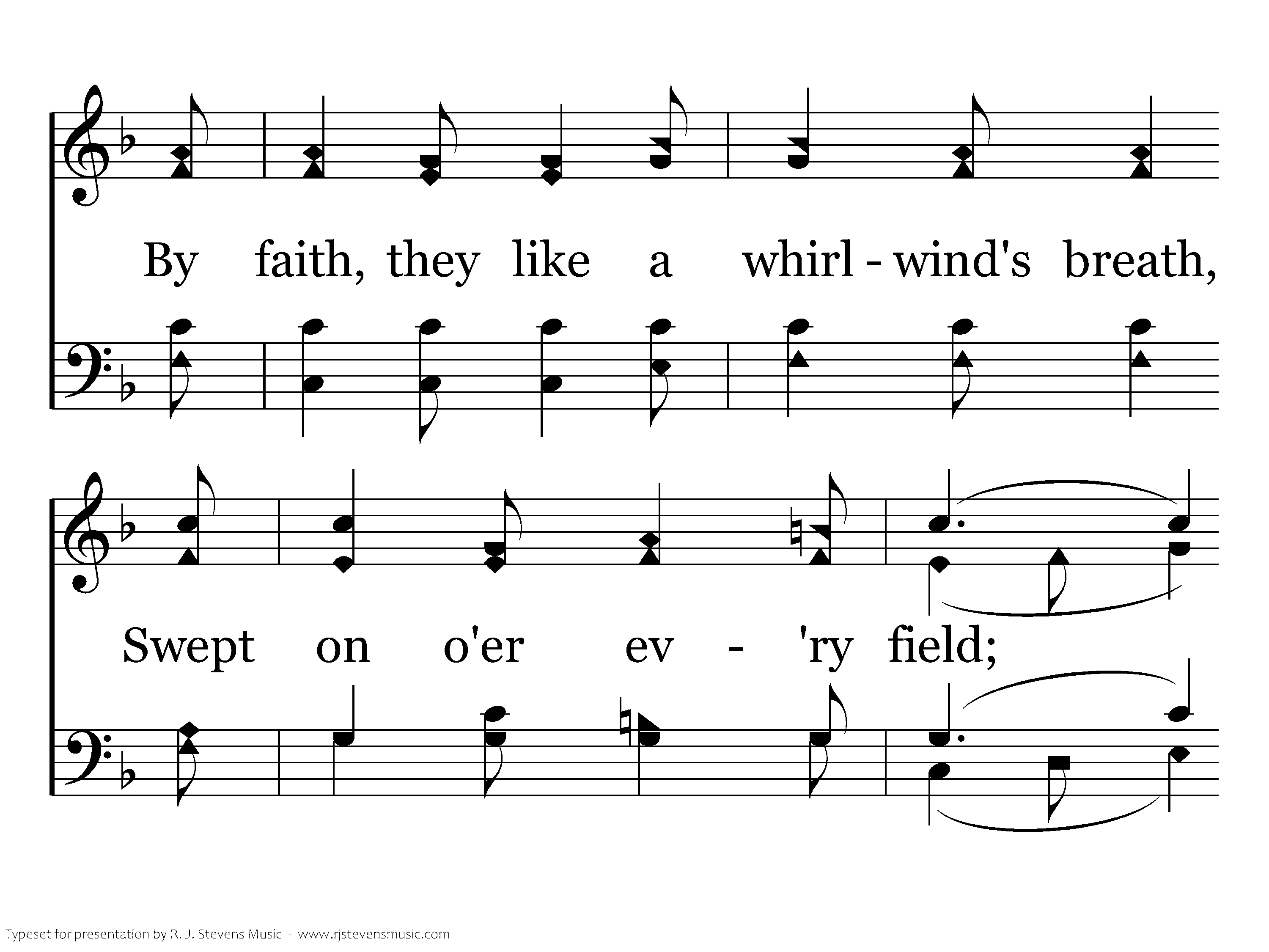 His banner over us is love, Our sword the Word of God; We tread the road the saints above With shouts of triumph trod. By faith, they like a whirlwind's breath, Swept on o'er ev'ry field; The faith by which they conquered death Is still our shining shield.