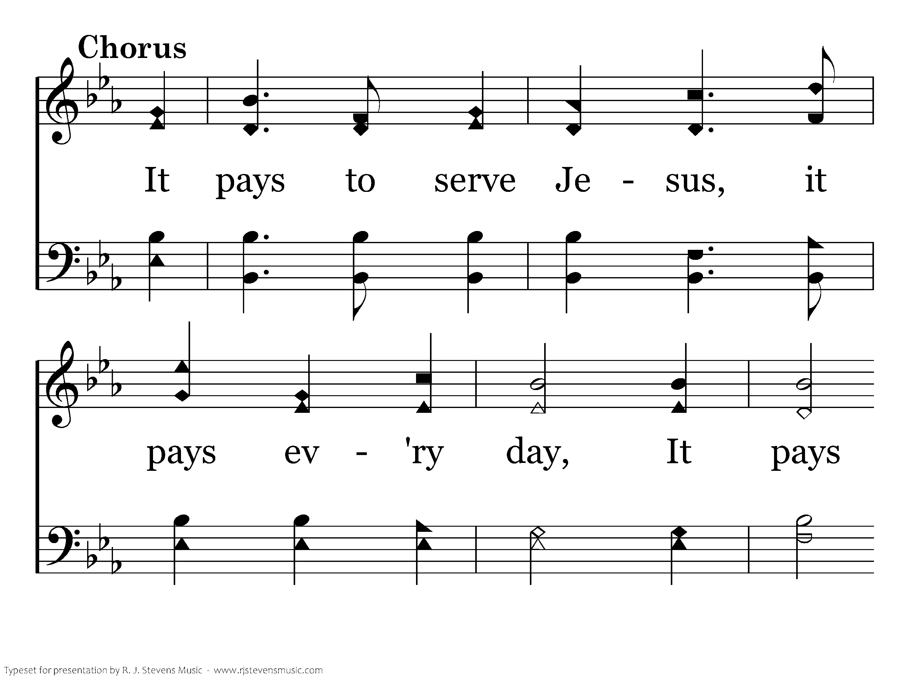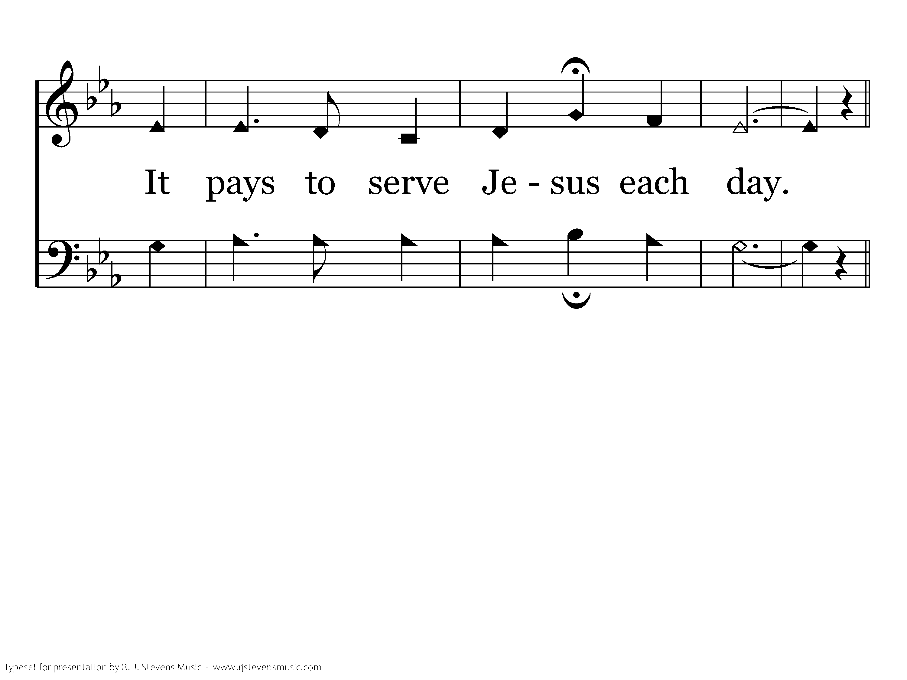 Tho' sometimes the shadows may hang o'er the way, And sorrows may come to beckon us home; Our precious Redeemer each toil will repay; It pays to serve Jesus each day.