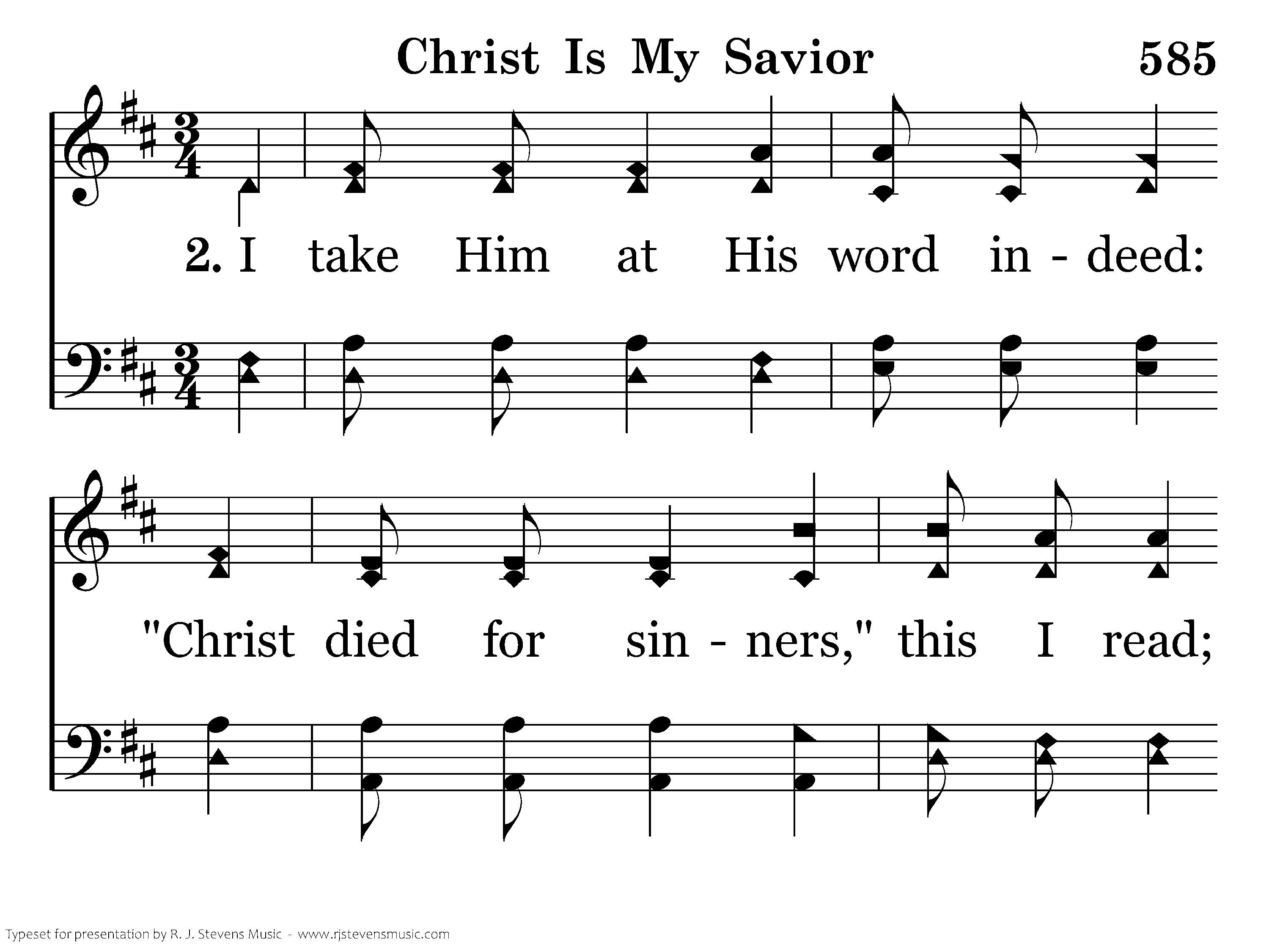I take Him at His word indeed: "Christ died for sinners," this I read; For in my heart I find a need Of Him to be my Savior!