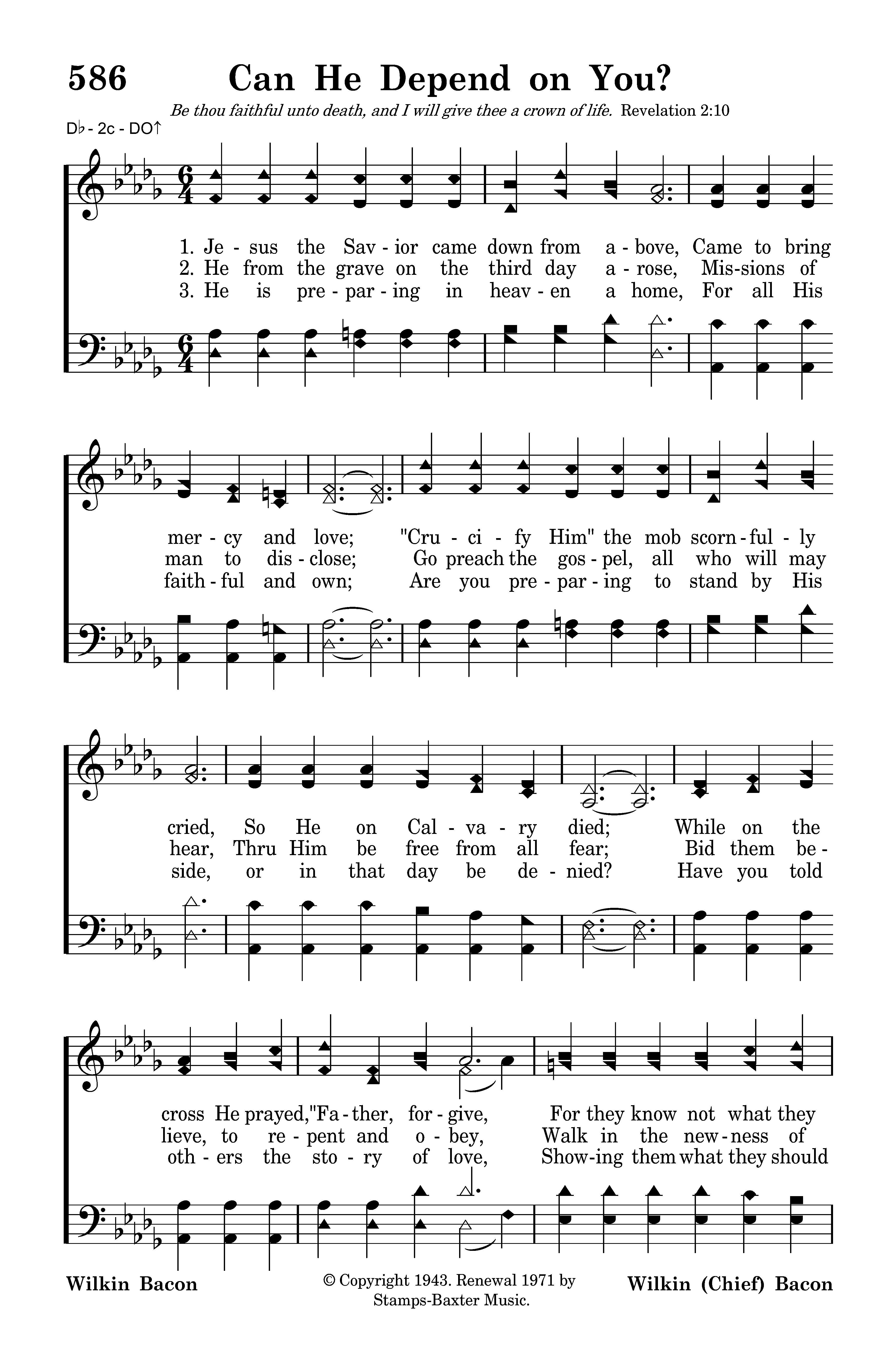 Jesus the Savior came down from above, Came to bring mercy and love; "Crucify Him" the mob scornfully cried, So He on Calvary died; While on the cross He prayed, "Father, forgive, For they know not what they do;" For us He died that for Him we might live, Can He depend on you?