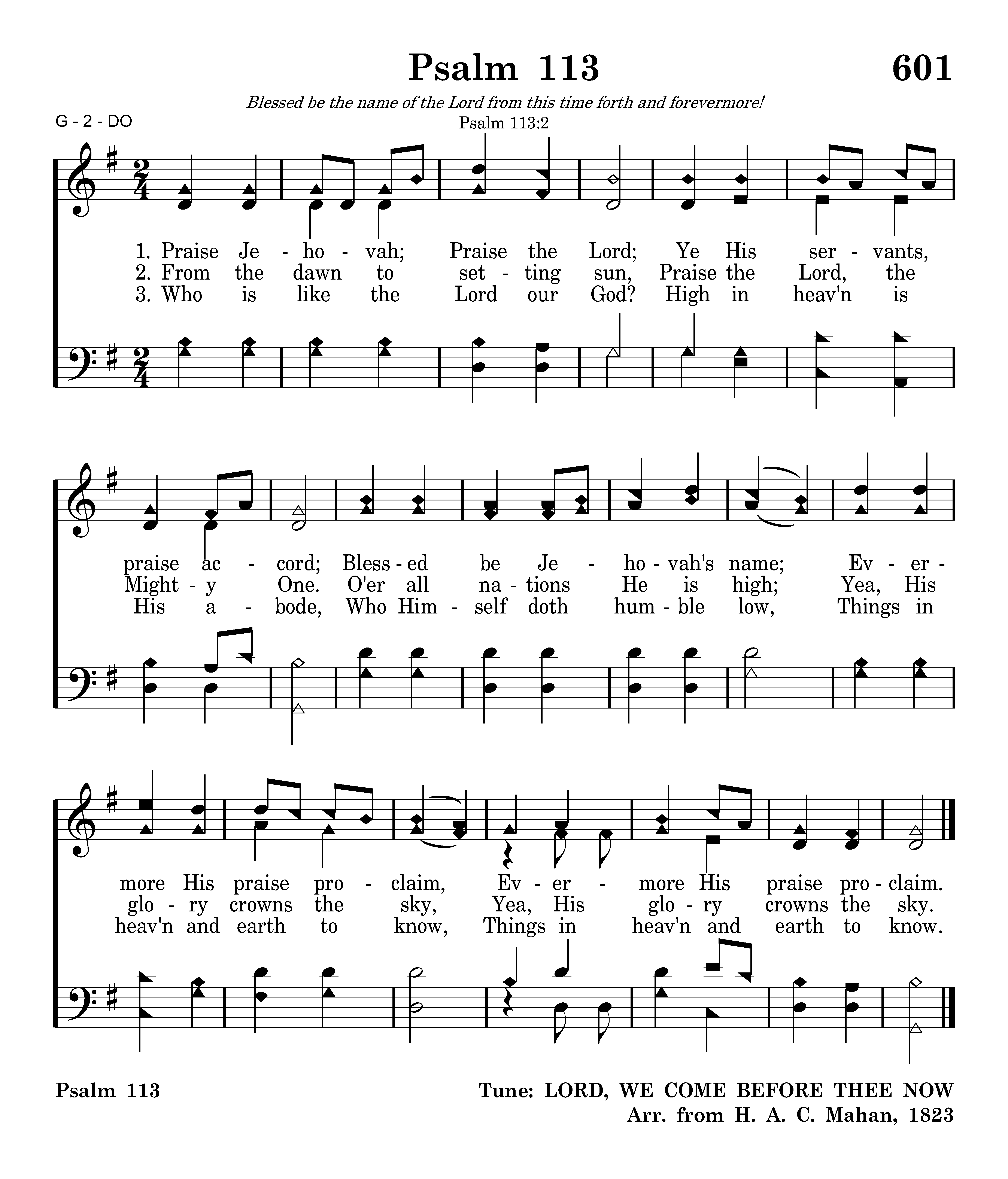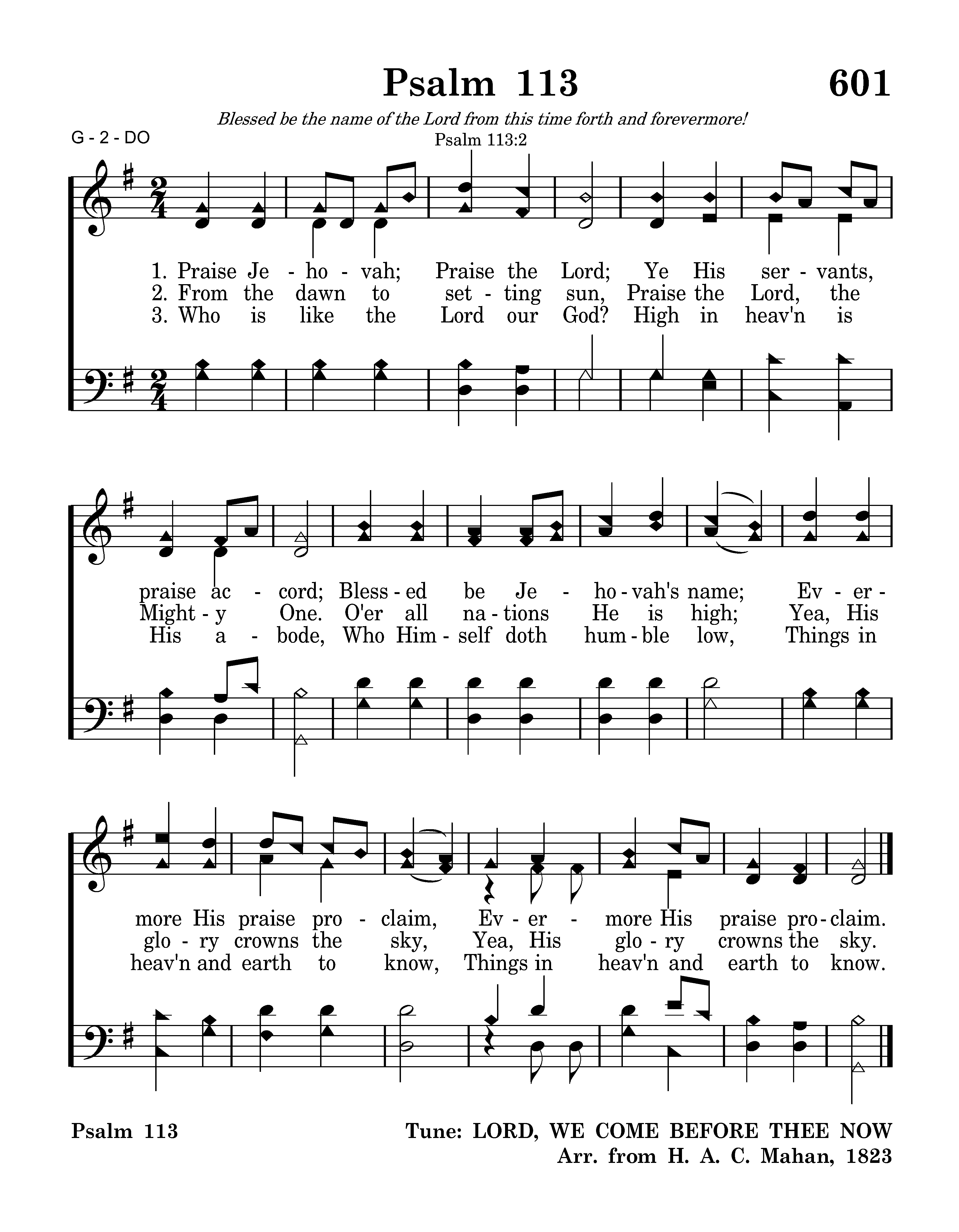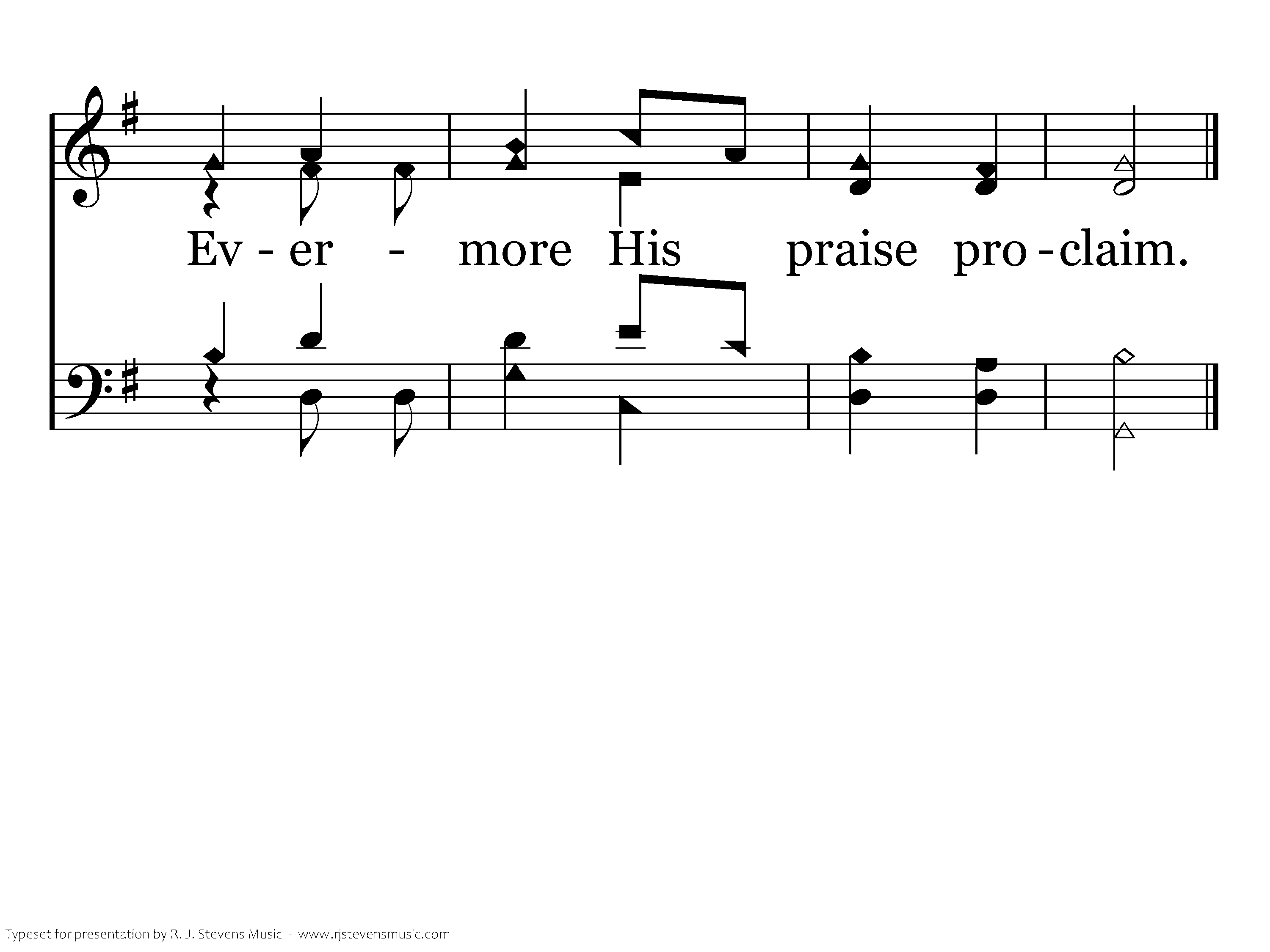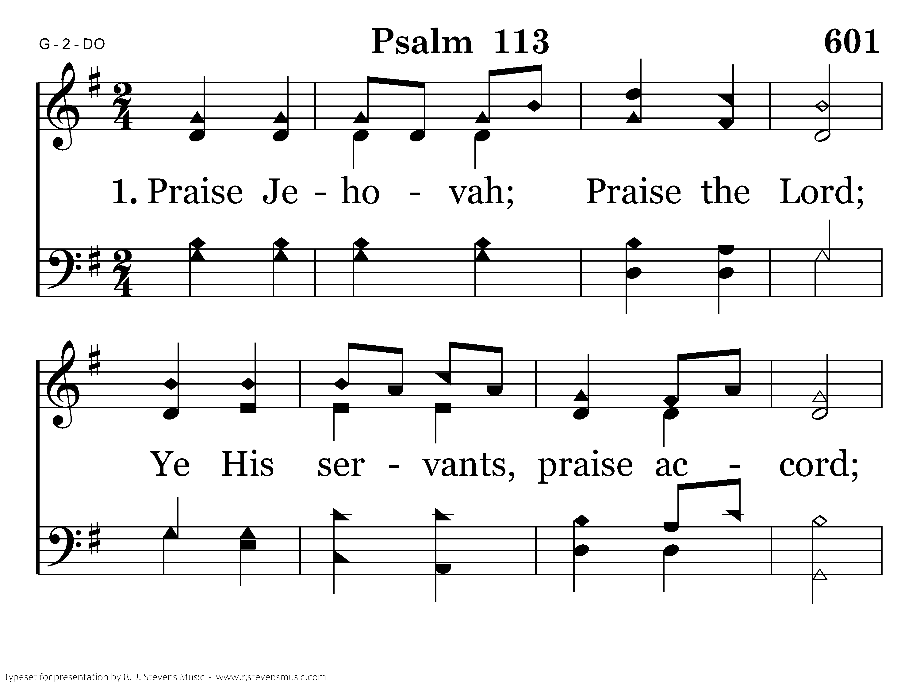 Praise Jehovah; Praise the Lord; Ye His servants, praise accord; Blessed be Jehovah's name; Evermore His praise proclaim, Evermore His praise proclaim.