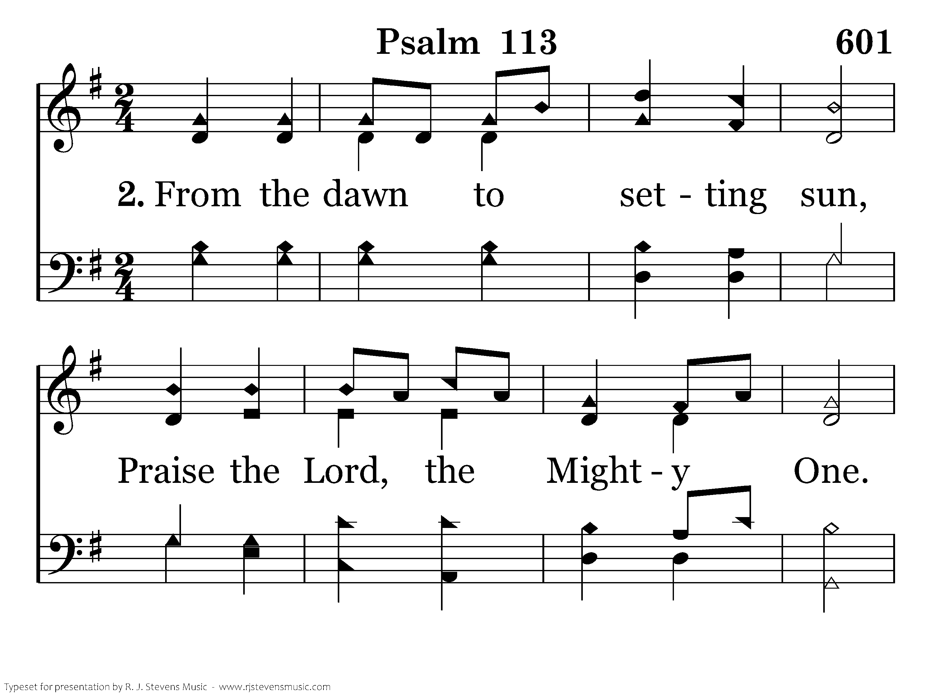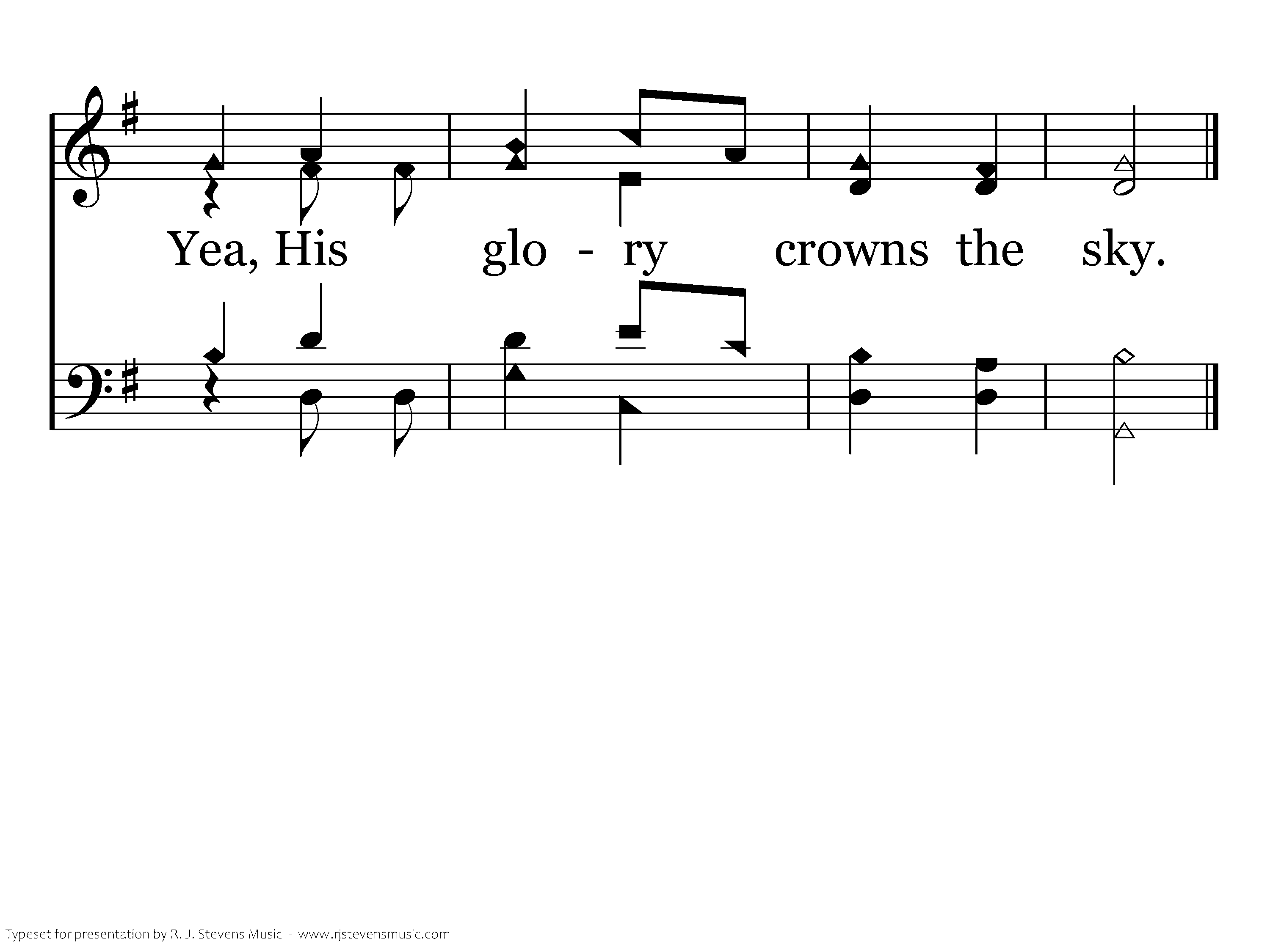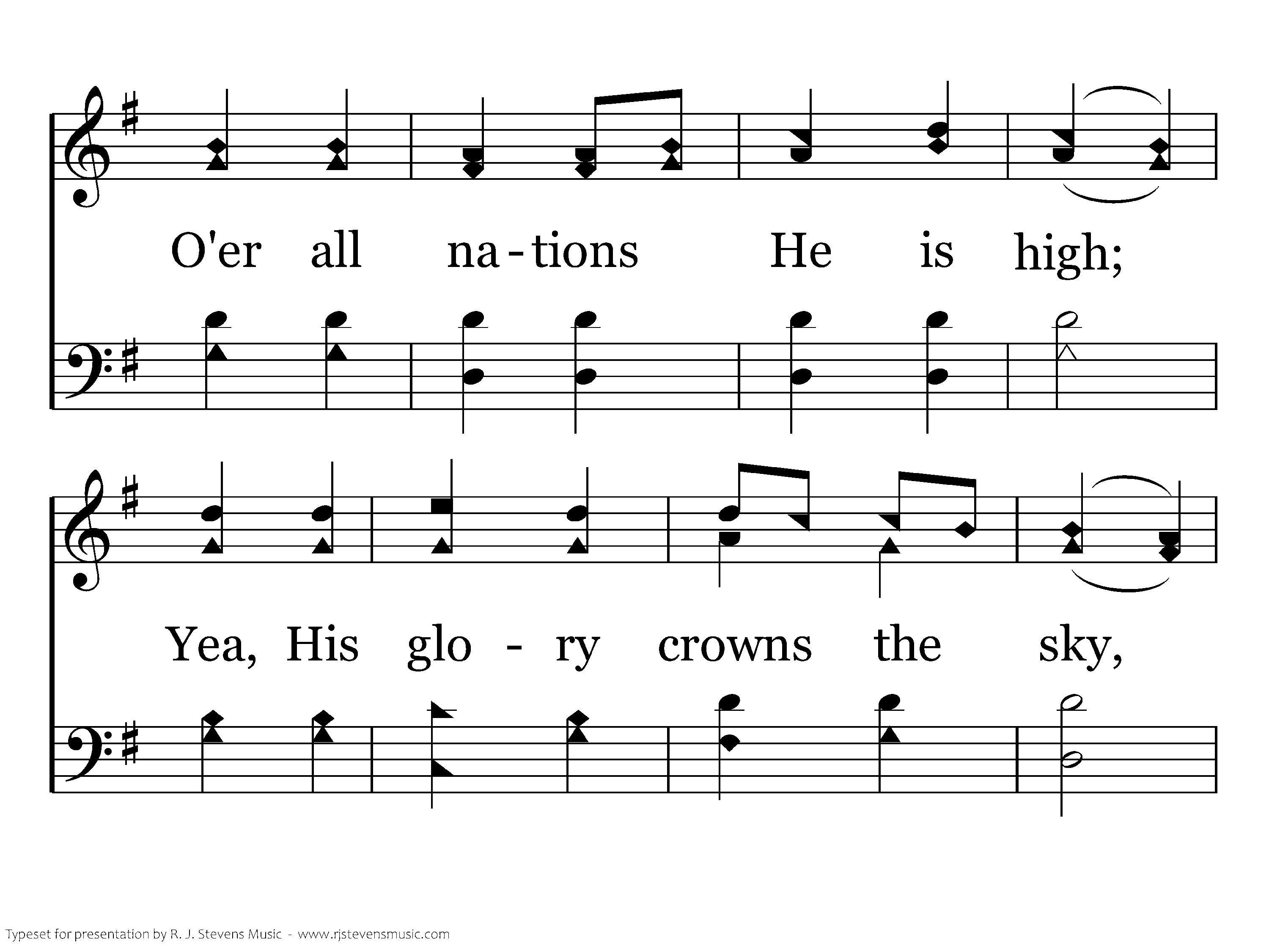 From the dawn to setting sun, Praise the Lord, the Mighty One. O'er all nations He is high; Yea, His glory crowns the sky, Yea, His glory crowns the sky.