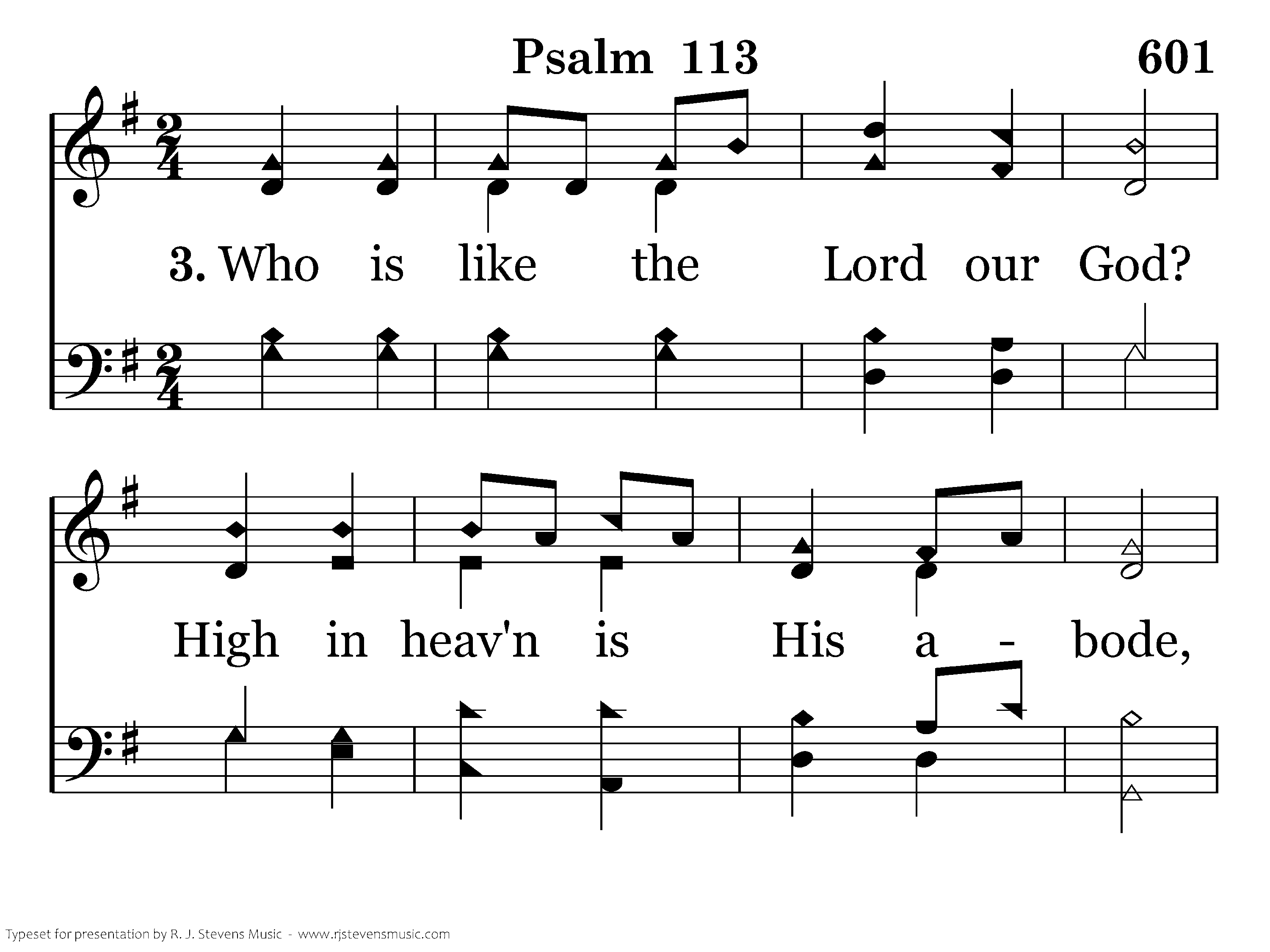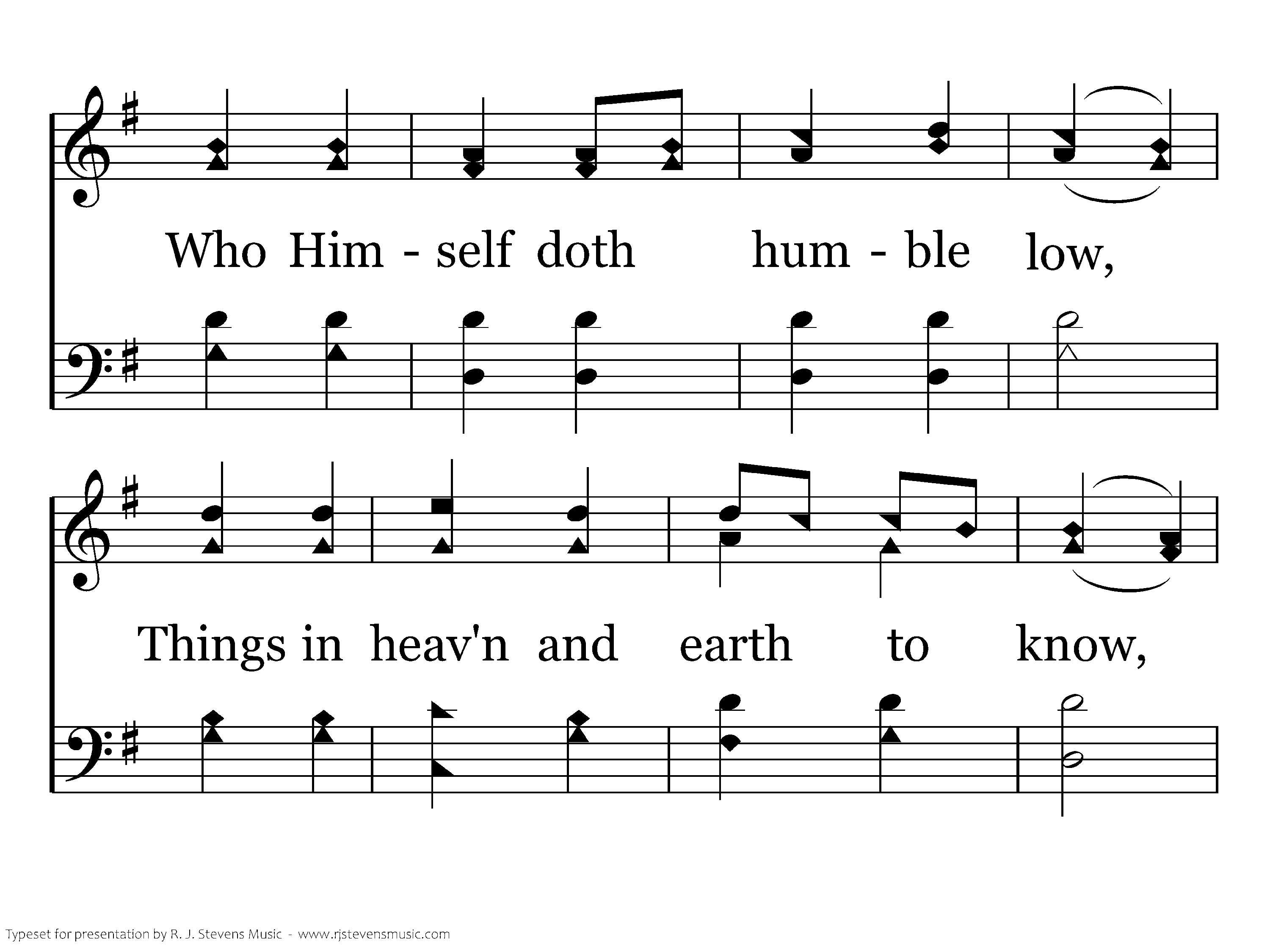 Who is like the Lord our God? High in heav'n is His abode, Who Himself doth humble low, Things in heav'n and earth to know, Things in heav'n and earth to know.