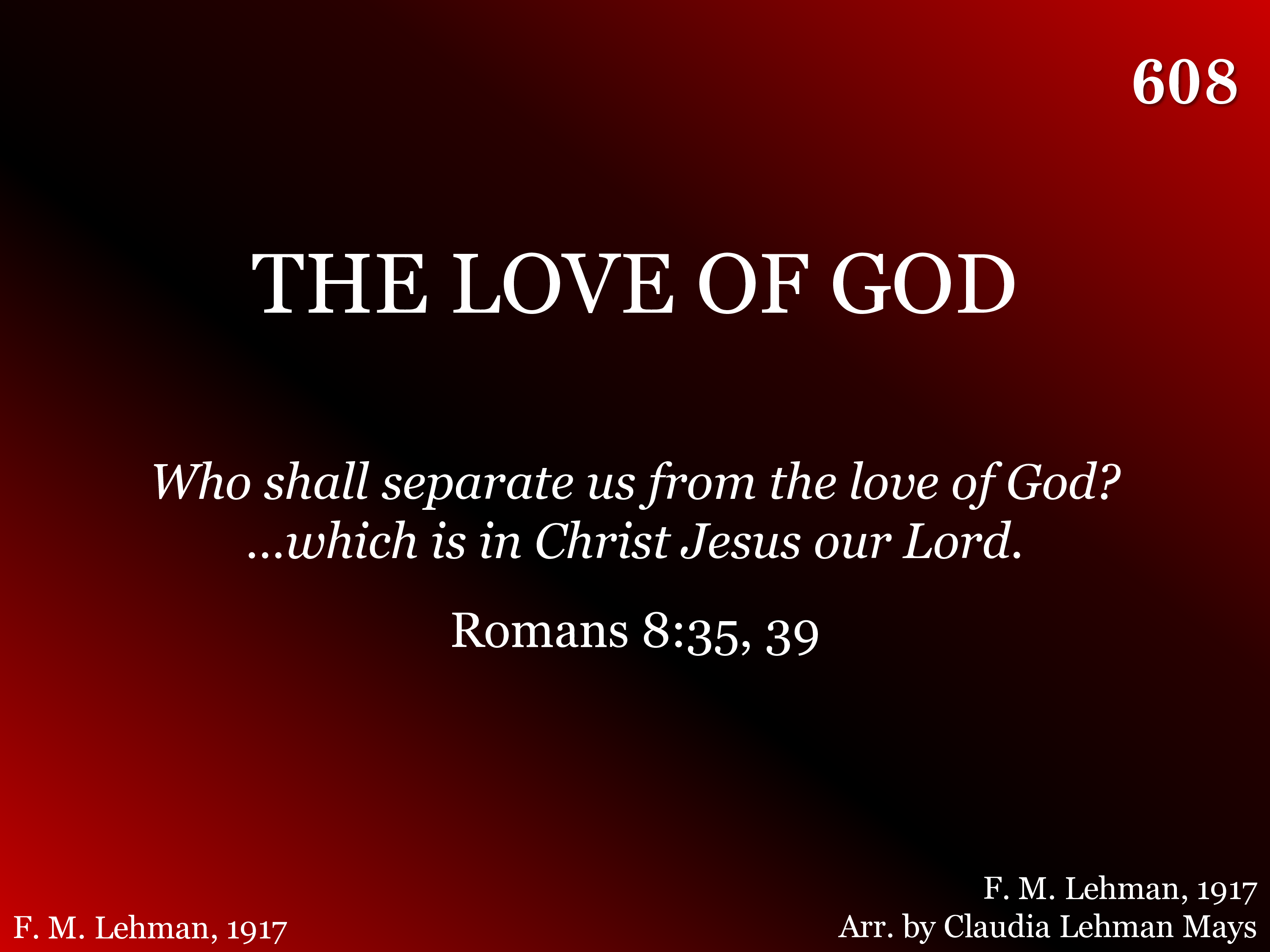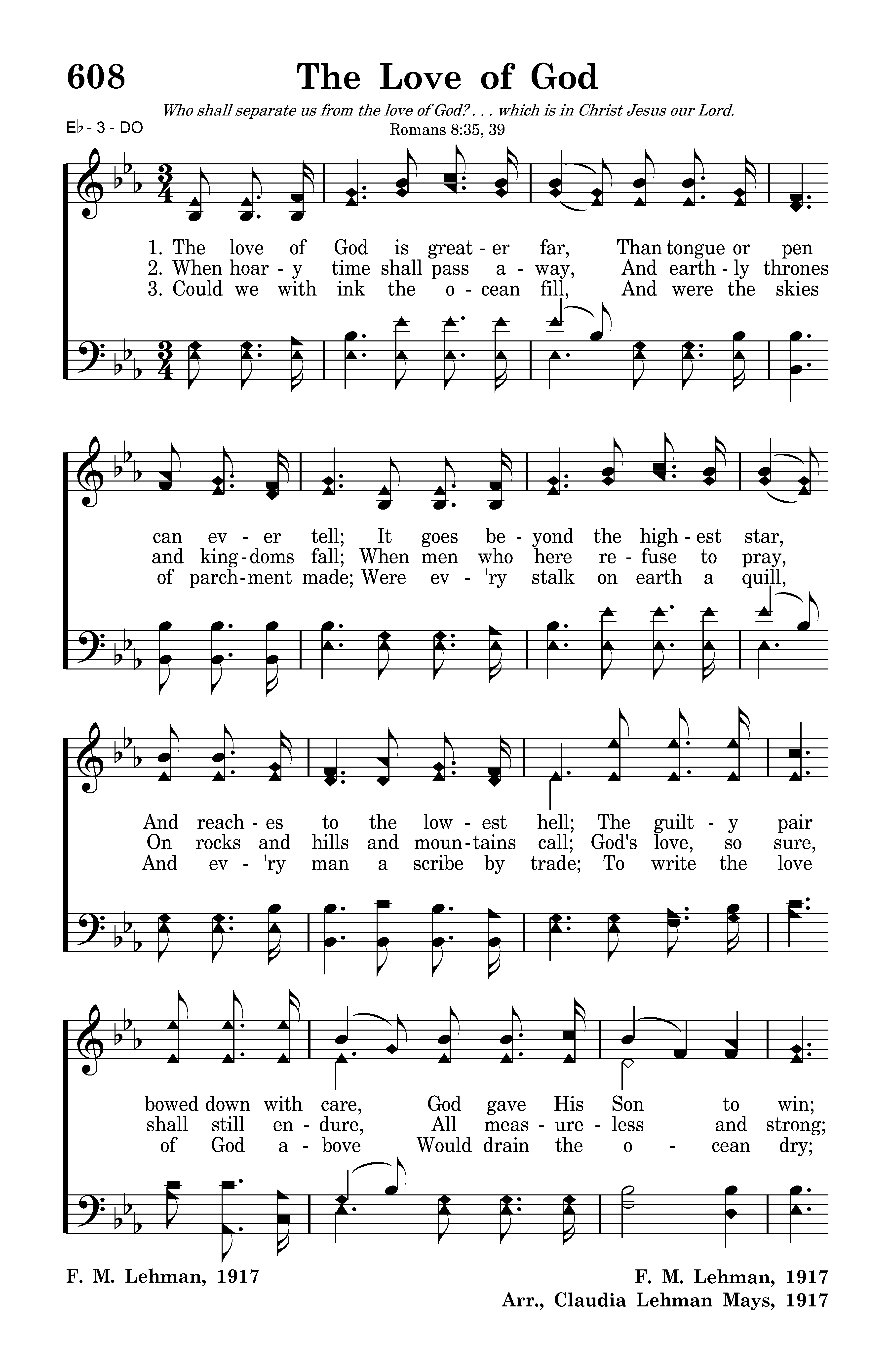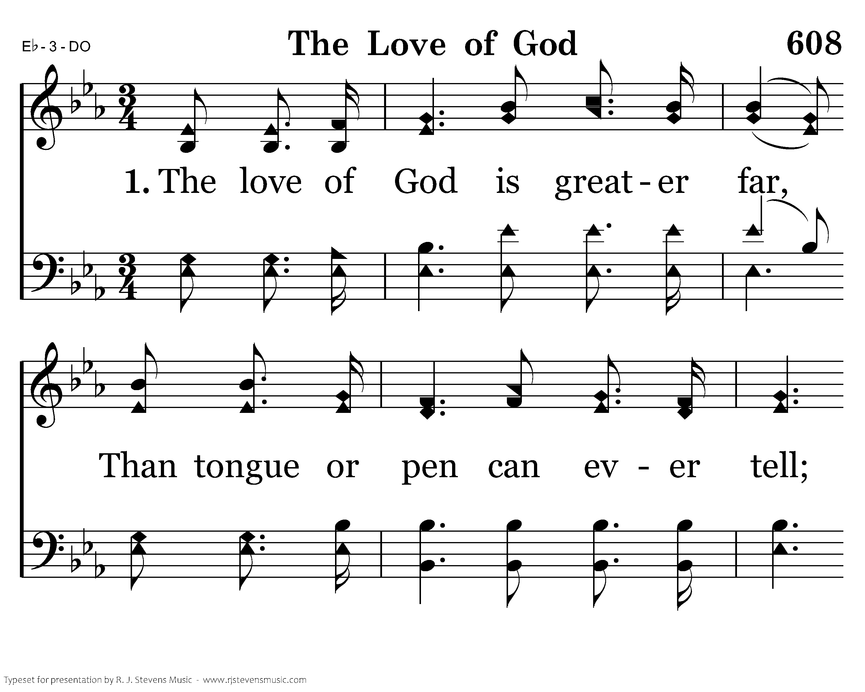 The love of God is greater far, Than tongue or pen can ever tell; It goes beyond the highest star, And reaches to the lowest hell; The guilty pair bowed down with care, God gave His Son to win; His erring child He reconciled, And pardoned from his sin.