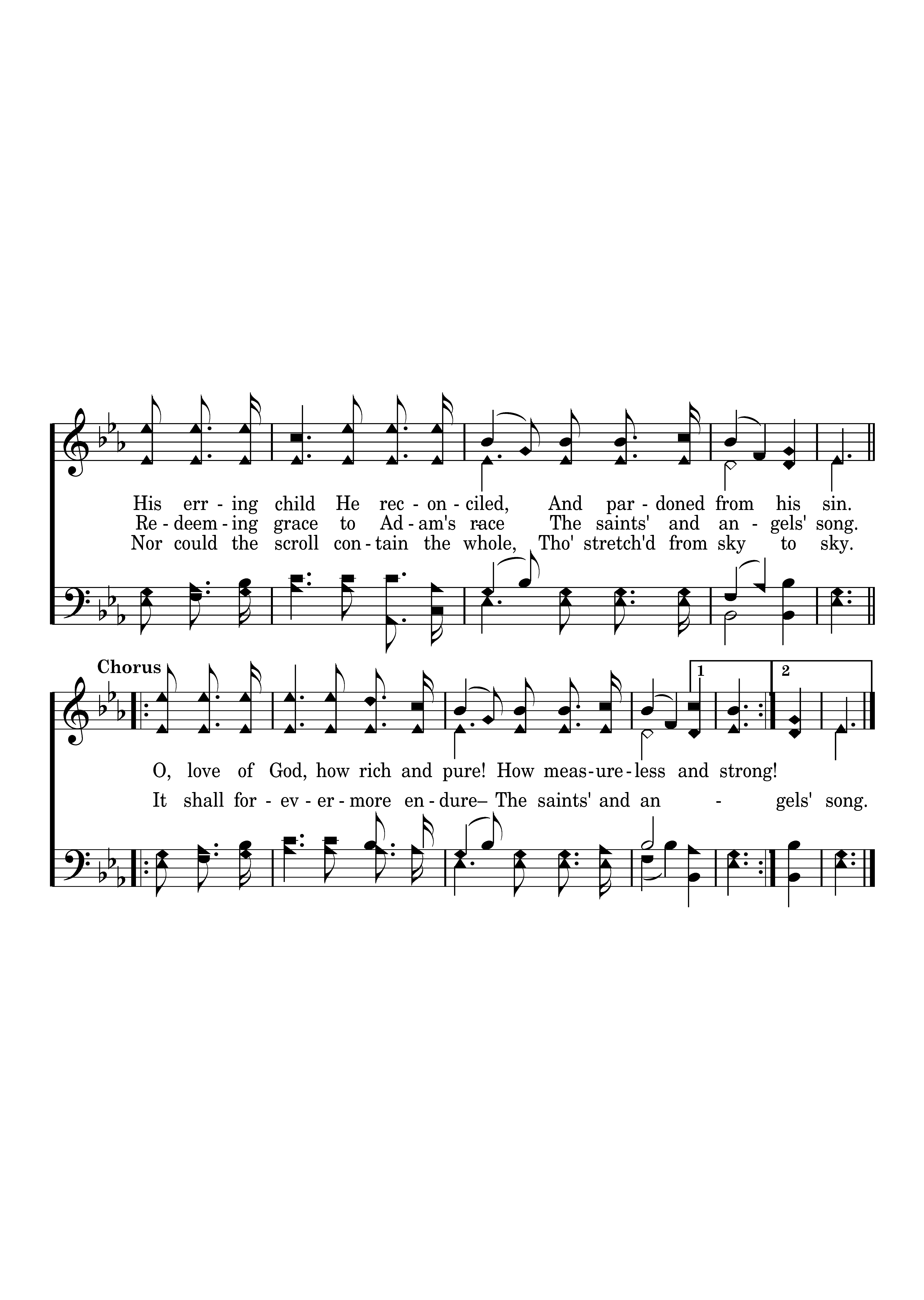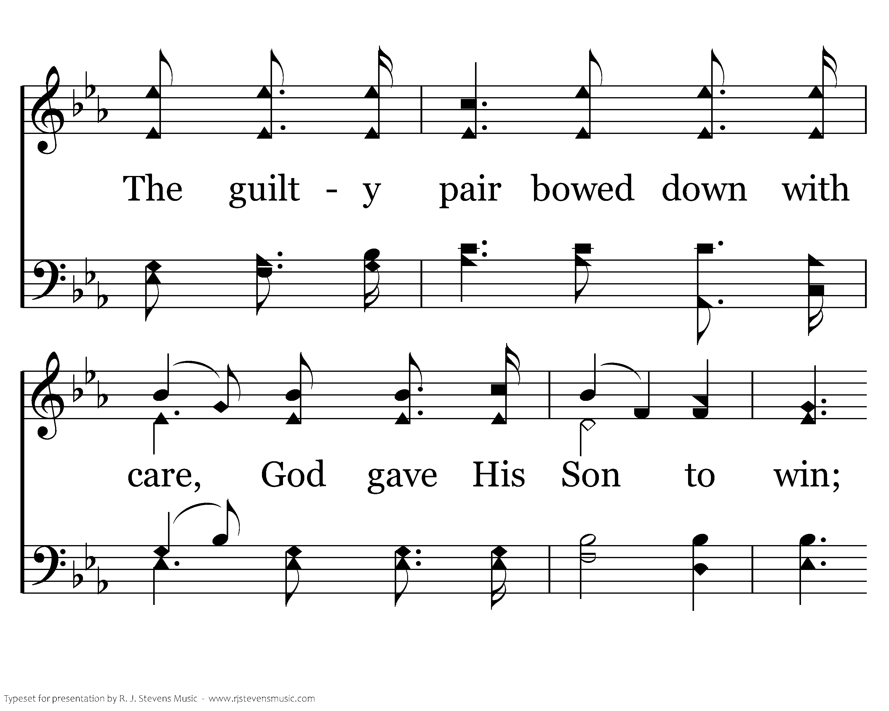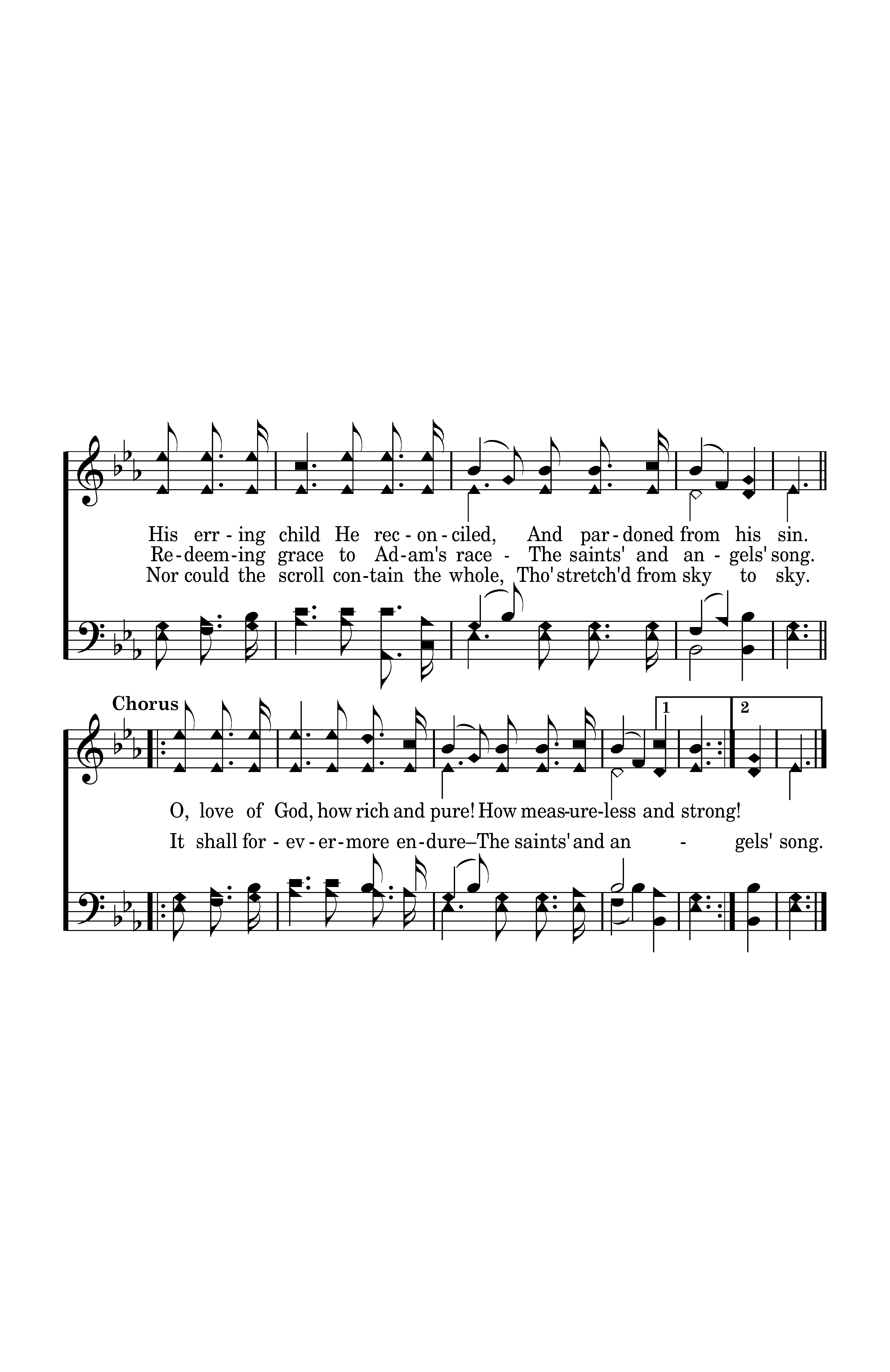 The love of God is greater far, Than tongue or pen can ever tell; It goes beyond the highest star, And reaches to the lowest hell; The guilty pair bowed down with care, God gave His Son to win; His erring child He reconciled, And pardoned from his sin.