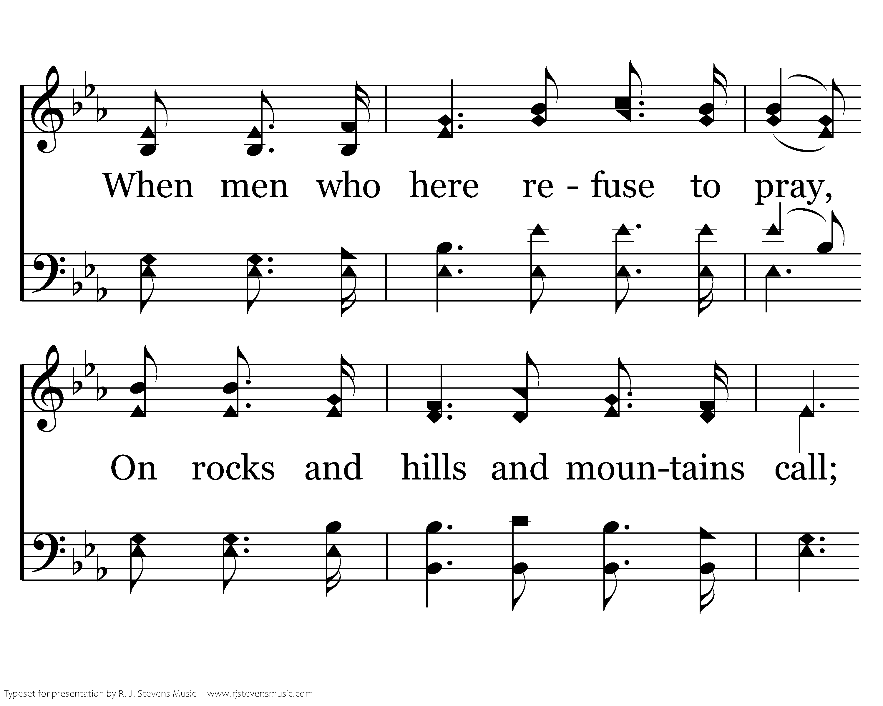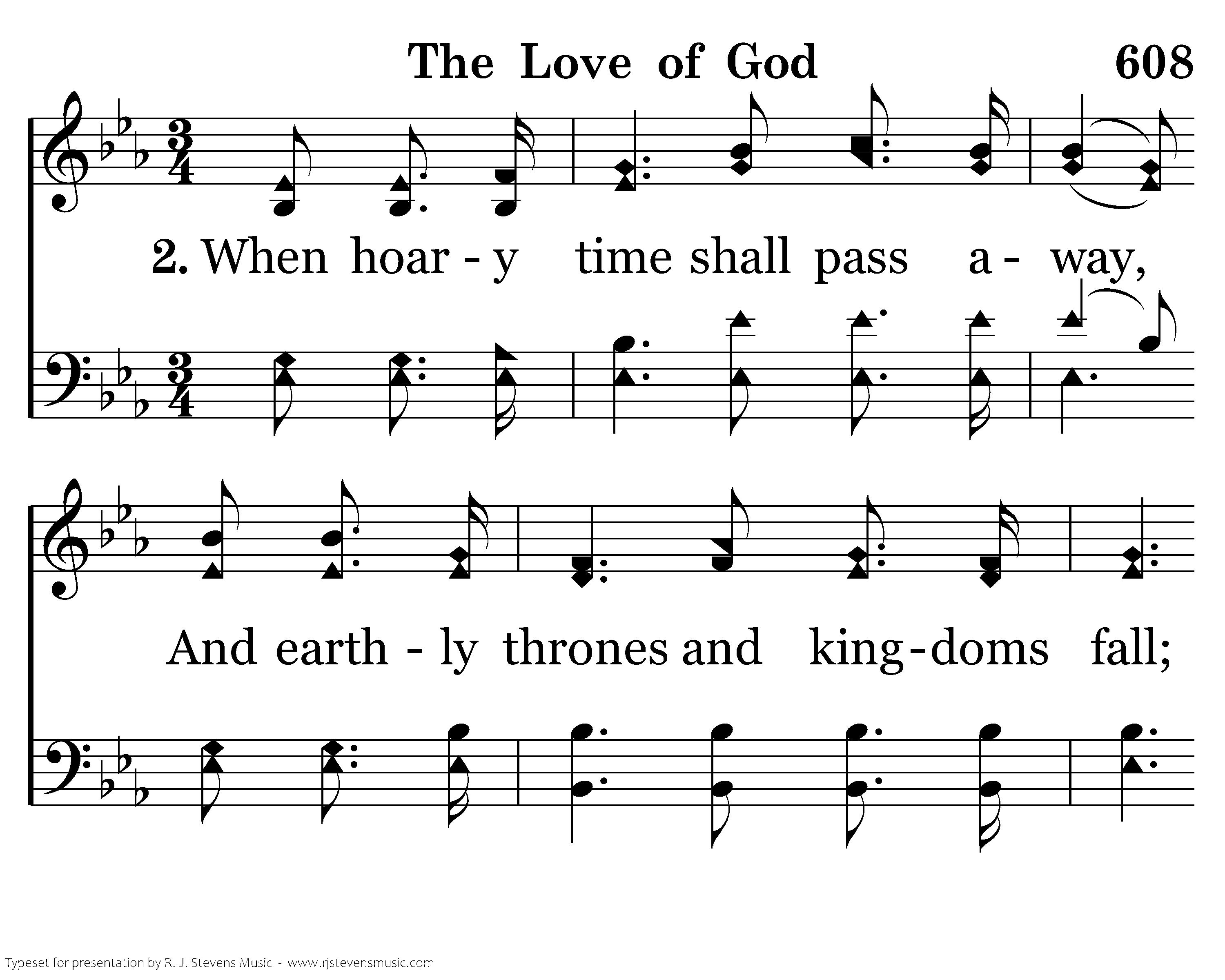 When hoary time shall pass away, And earthly thrones and kingdoms fall; When men who here refuse to pray, On rocks and hills and mountains call; God's love, so sure, shall still endure, All measureless and strong; Redeeming grace to Adam's race The saints' and angels' song.